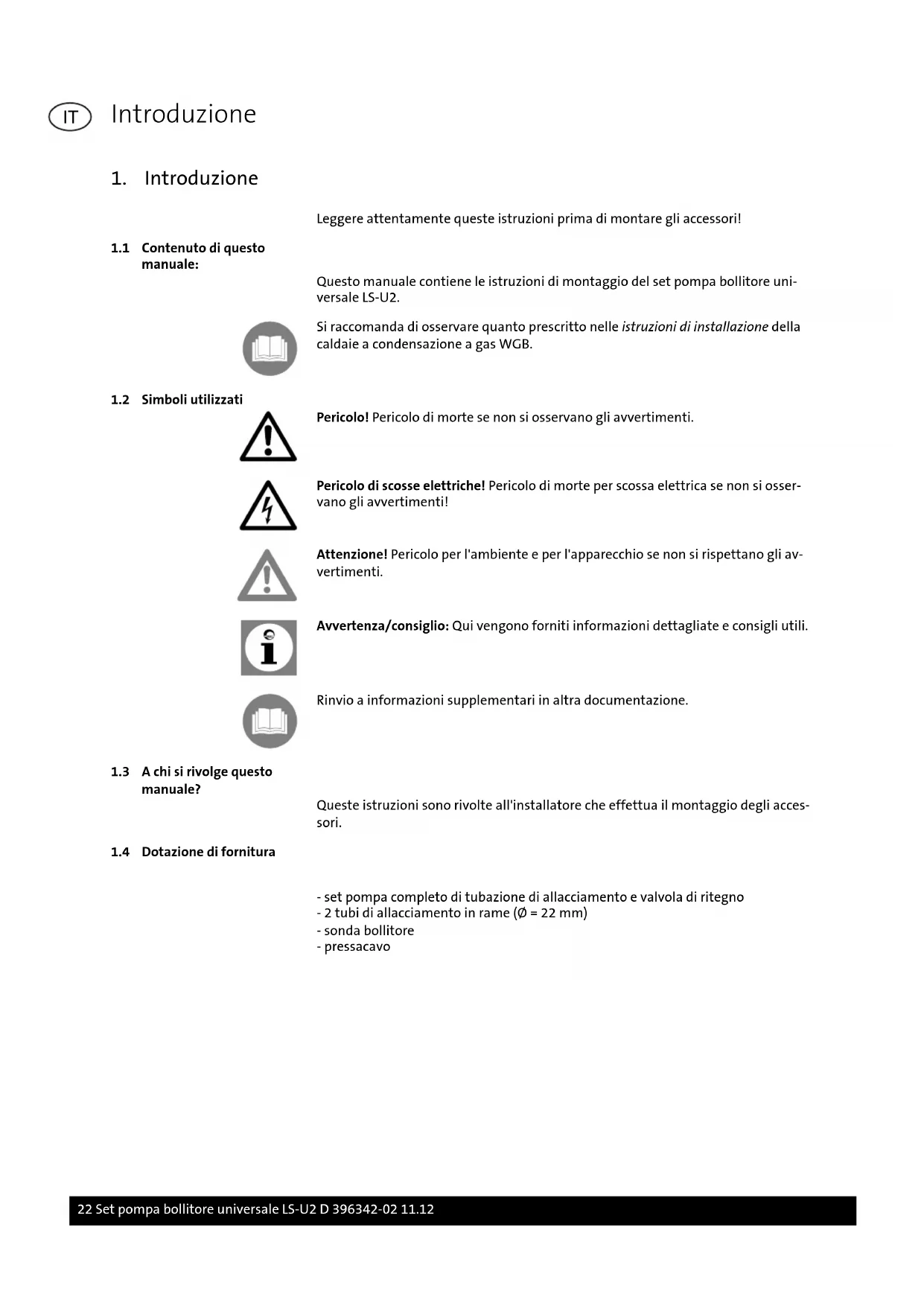 manuale: Questo manuale contiene le istruzioni di montaggio del set pompa bollitore uni- versale LS-U2. Si raccomanda di osservare quanto prescritto nelle istruzioni di installazione della caldaie a condensazione a gas WGB.