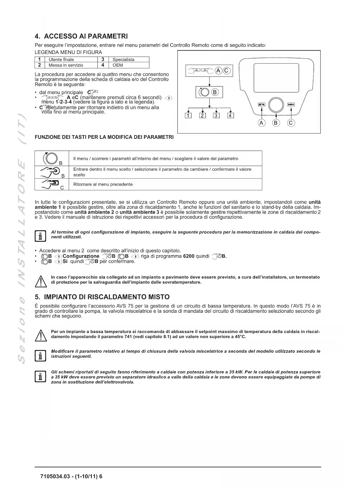 Pompa circuito riscaldamento Q2Controllo della pompa/elettrovalvola del circuito 1 6031 Pompa CR2 Q6 Controllo della pompa/elettrovalvola del circuito 2 CIRCUITO DI RISCALDAMENTO 1742 ---Abilitazione della temperatura di mandata modulante (circuito di riscaldamento 1)CIRCUITO DI RISCALDAMENTO 21042 ---Abilitazione della temperatura di mandata modulante (circuito di riscaldamento 2) Le unità ambiente sono in grado di controllare direttamente le rispettive zone in funzione della temperatura ambiente desiderata nel locale.Se, ruotando la manopola B, il display visualizza la temperatura di mandata caldaia anziché quella ambiente, signica che i parametri 742, 1042 e 1034 non sono impostati correttamente.11 S e z i o n e I N S TA L L AT O R E ( I T ) 7105034.03 - (1-10/11)