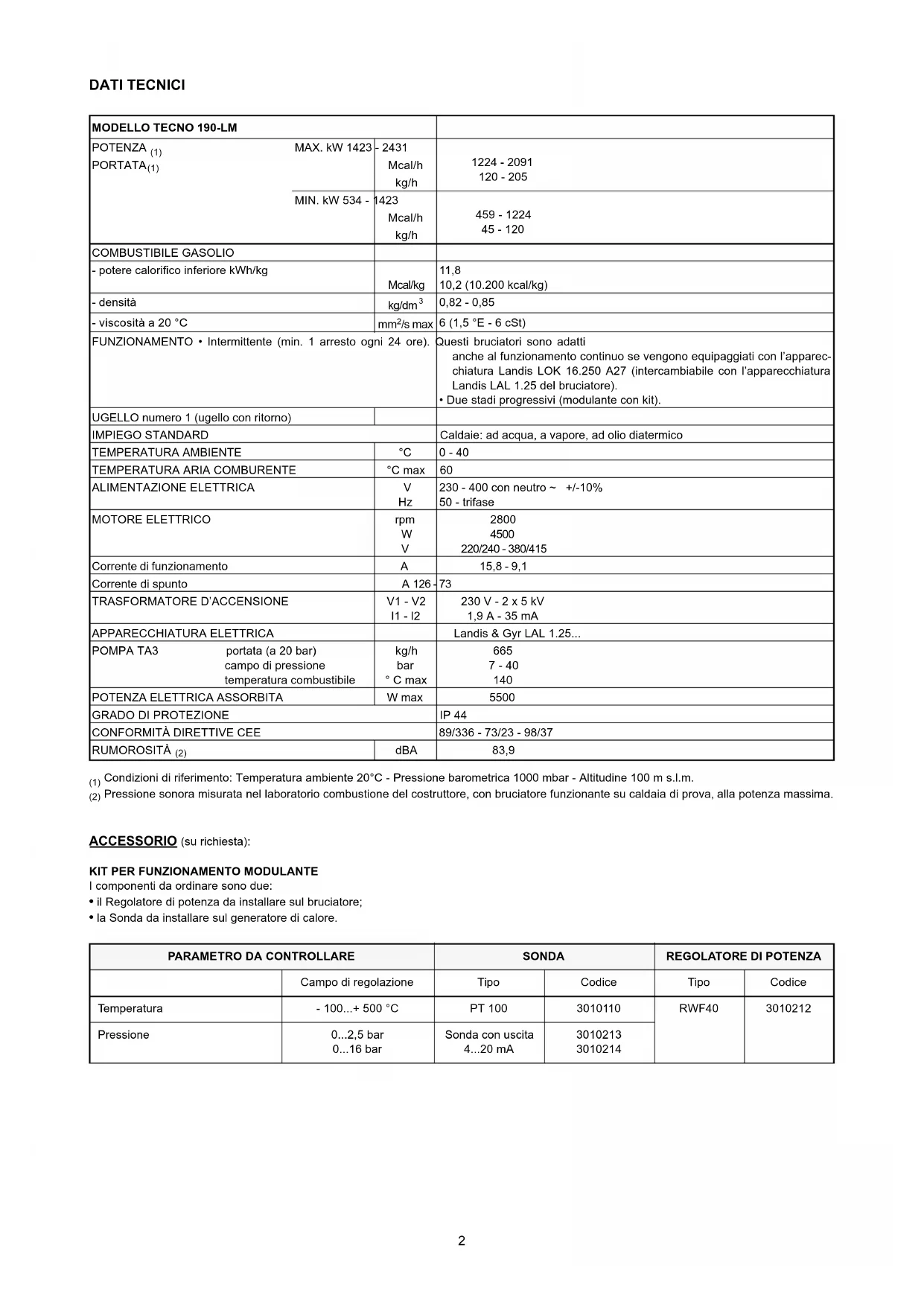 RUMOROSITÀ (2) dBA 83,9 PARAMETRO DA CONTROLLARE SONDA REGOLATORE DI POTENZA Campo di regolazione Tipo Codice Tipo Codice Temperatura - 100...+ 500 °C PT 100 3010110 RWF40 3010212 Pressione 0...2,5 bar 0...16 bar Sonda con uscita 4...20 mA