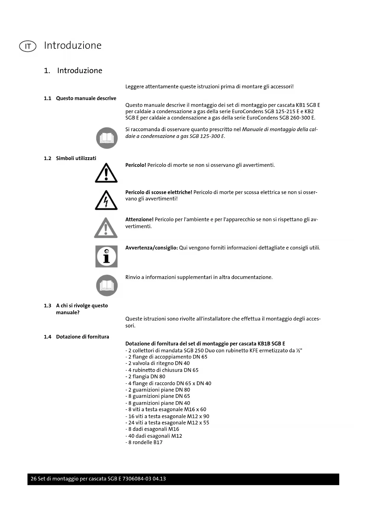 Questo manuale descrive il montaggio dei set di montaggio per cascata KB1 SGB E per caldaie a condensazione a gas della serie EuroCondens SGB 125-215 E e KB2 SGB E per caldaie a condensazione a gas della serie EuroCondens SGB 260-300 E. Si raccomanda di osservare quanto prescritto nel Manuale di montaggio della cal- daie a condensazione a gas SGB 125-300 E.