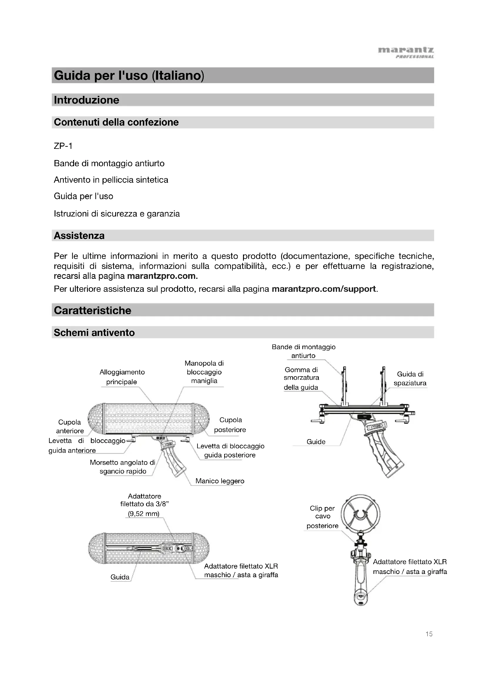 Guida per l'uso (Italiano) Introduzione Contenuti della confezione ZP-1 Bande di montaggio antiurto Antivento in pelliccia sintetica Guida per l'uso Istruzioni di sicurezza e garanzia Assistenza Per le ultime informazioni in merito a questo prodotto (documentazione, specifiche tecniche, requisiti di sistema, informazioni sulla compatibilità, ecc.) e per effettuarne la registrazione, recarsi alla pagina marantzpro.com. Per ulteriore assistenza sul prodotto, recarsi alla pagina marantzpro.com/support. Caratteristiche Schemi antivento