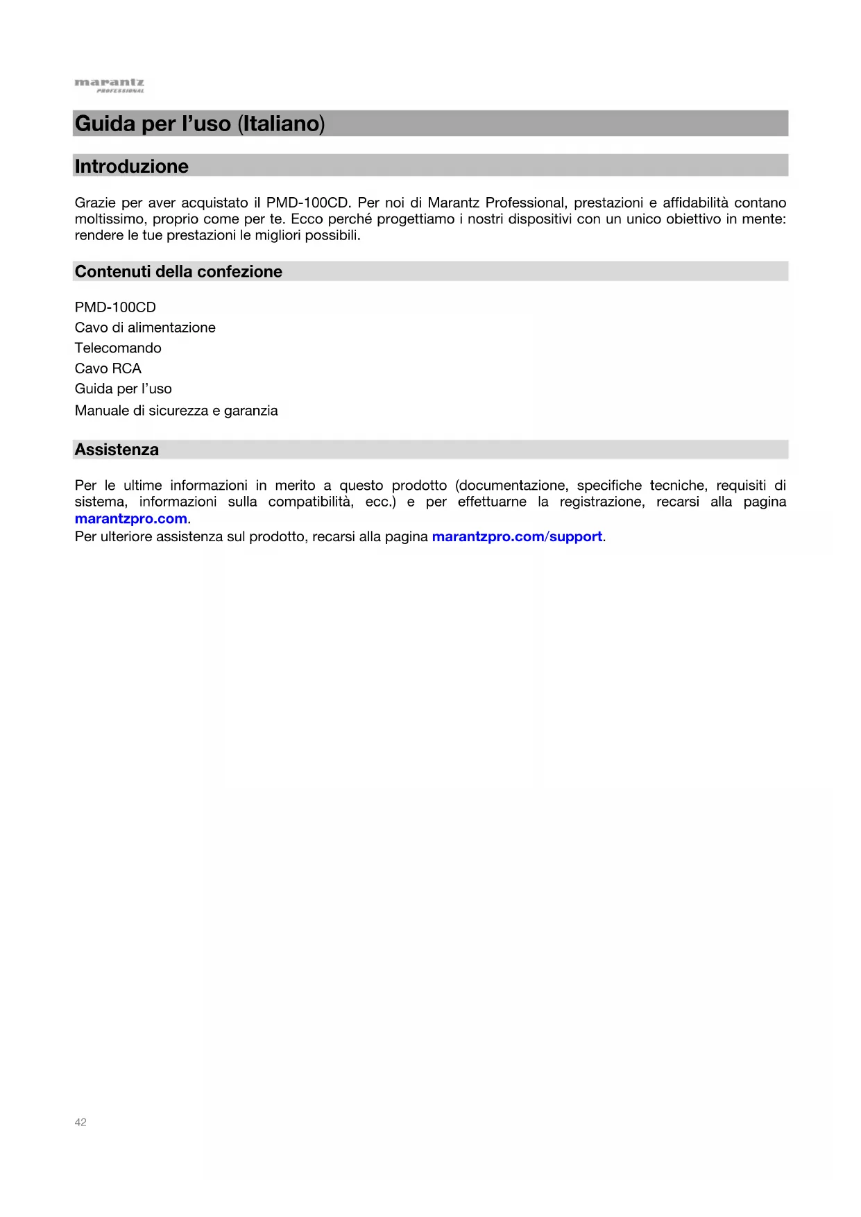 Guida per l’uso (Italiano) Introduzione Grazie per aver acquistato il PMD-100CD. Per noi di Marantz Professional, prestazioni e affidabilità contano moltissimo, proprio come per te. Ecco perché progettiamo i nostri dispositivi con un unico obiettivo in mente: rendere le tue prestazioni le migliori possibili. Contenuti della confezione PMD-100CD Cavo di alimentazione Telecomando Cavo RCA Guida per l’uso Manuale di sicurezza e garanzia Assistenza Per le ultime informazioni in merito a questo prodotto (documentazione, specifiche tecniche, requisiti di sistema, informazioni sulla compatibilità, ecc.) e per effettuarne la registrazione, recarsi alla pagina marantzpro.com. Per ulteriore assistenza sul prodotto, recarsi alla pagina marantzpro.com/support.43