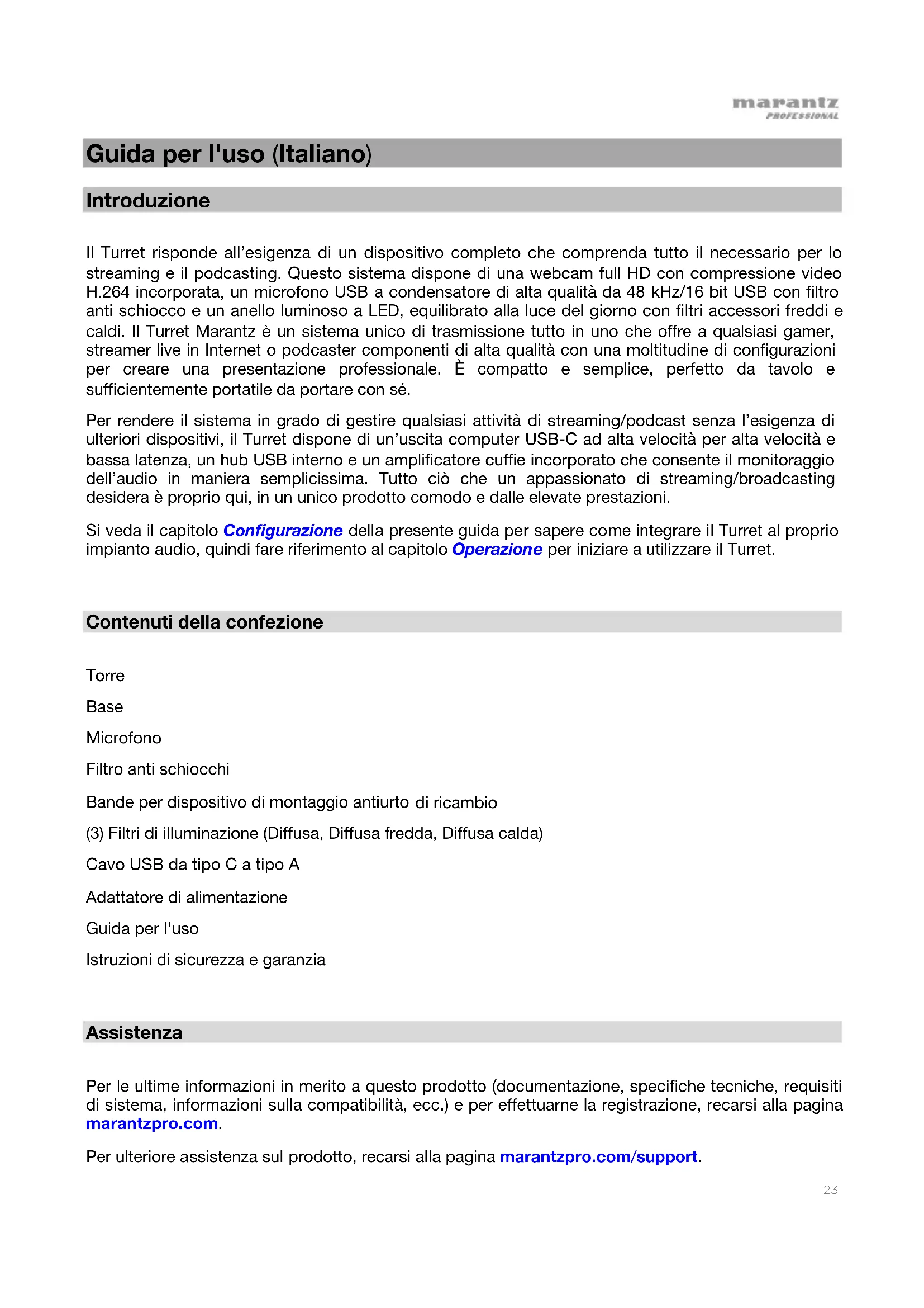 Guida per l'uso (Italiano) Introduzione Il Turret risponde all’esigenza di un dispositivo completo che comprenda tutto il necessario per lo streaming e il podcasting. Questo sistema dispone di una webcam full HD con compressione video H.264 incorporata, un microfono USB a condensatore di alta qualità da 48 kHz/16 bit USB con filtro anti schiocco e un anello luminoso a LED, equilibrato alla luce del giorno con filtri accessori freddi e caldi. Il Turret Marantz è un sistema unico di trasmissione tutto in uno che offre a qualsiasi gamer, streamer live in Internet o podcaster componenti di alta qualità con una moltitudine di configurazioni per creare una presentazione professionale. È compatto e semplice, perfetto da tavolo e sufficientemente portatile da portare con sé. Per rendere il sistema in grado di gestire qualsiasi attività di streaming/podcast senza l’esigenza di ulteriori dispositivi, il Turret dispone di un’uscita computer USB-C ad alta velocità per alta velocità e bassa latenza, un hub USB interno e un amplificatore cuffie incorporato che consente il monitoraggio dell’audio in maniera semplicissima. Tutto ciò che un appassionato di streaming/broadcasting desidera è proprio qui, in un unico prodotto comodo e dalle elevate prestazioni. Si veda il capitolo Configurazione della presente guida per sapere come integrare il Turret al proprio impianto audio, quindi fare riferimento al capitolo Operazione per iniziare a utilizzare il Turret.