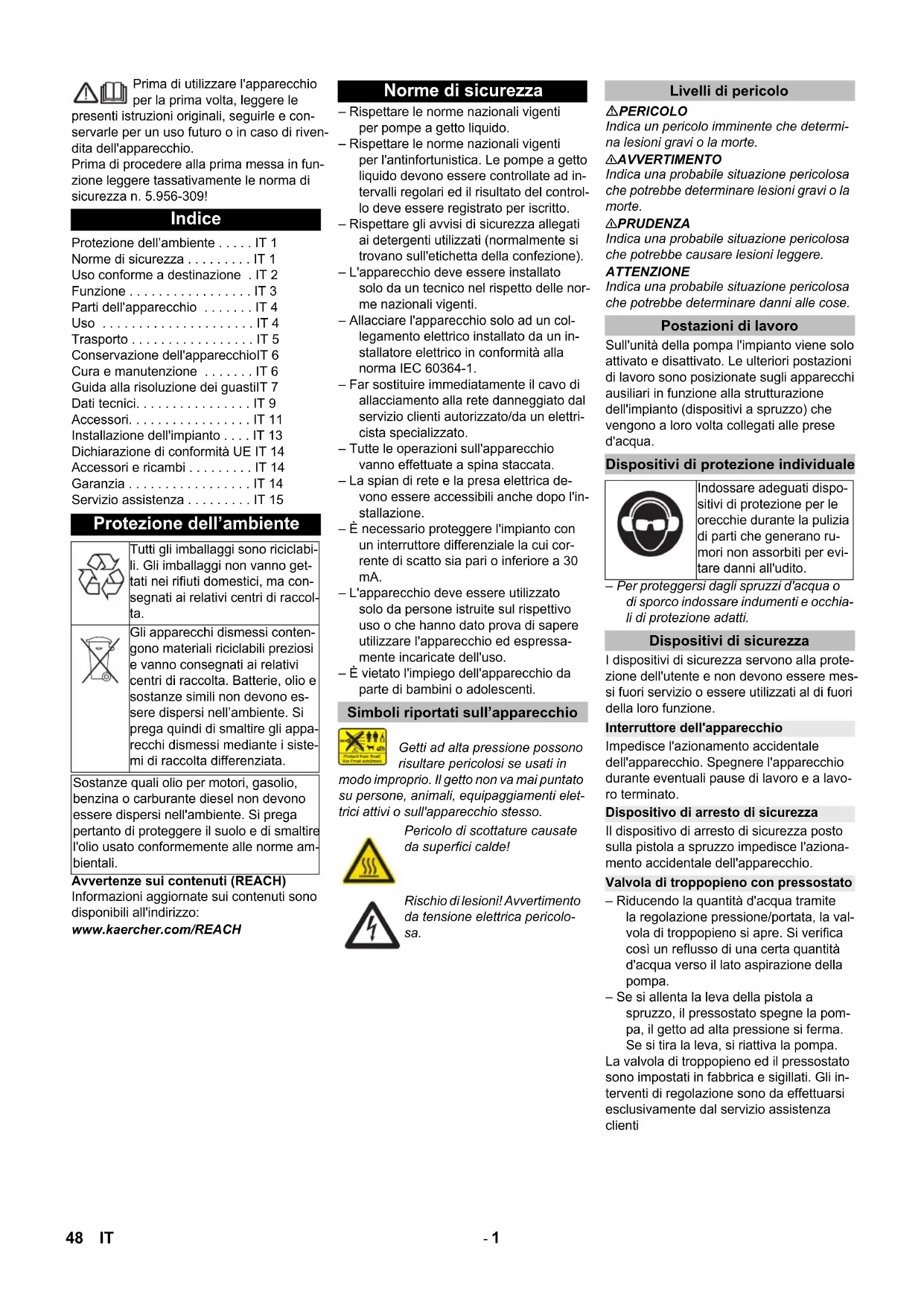 - 45FR- 14 Les réglages sont faits sur la platine de commande. Cette dernière se trouve dans le coffret électrique de la pompe haute pression. 1 Potentiomètre dureté de l'eau 2 Durée de disponibilité du potentiomètre Régler la durée d'opérationnalité avec le potentiomètre sur l'électronique de commande. Paramètre par défaut : 10 Minutes La durée peut être réglée entre 5 et 120 mi- nutes. Une graduation simple est imprimée avec des valeurs indicatives sur la platine de commande. En protection contre l'entartrage pour le fonctionnement avec de l'eau dure. Ajoute de l'adoucisseur à l'eau. La quantité dosée peut être adaptée au degré de dureté de l'eau. Remplir le réservoir avec l'adoucisseur de Kärcher RM 110 (N° de commande 2.780-001). Déterminer la dureté de l'eau locale : – En contactant le distributeur local, – avec un appareil pour essai de dureté (N° de commande 6.768-004). DANGER Tension électrique dangereuse ! Seul un électricien spécialisé est habilité à effectuer ce réglage. Régler le potentiomètre rotatif sur la platine d'adoucisseur selon la dureté de l'eau. La graduation indique la plage de dure- té de 1 à 4. Dévisser l'injecteur. Laisser l'appareil en route jusqu'à l'eau sorte sans faire de bulles. Faire tourner l'appareil éventuellement pendant 10 secondes - le mettre hors service. Répéter le processus à plu- sieurs reprises. Arrêter l'appareil et dévisser de nou- veau l'injecteur. Nous certifions par la présente que la ma- chine spécifiée ci-après répond de par sa conception et son type de construction ain- si que de par la version que nous avons mise sur le marché aux prescriptions fon- damentales stipulées en matière de sécuri- té et d’hygiène par les directives euro- péennes en vigueur. Toute modification ap- portée à la machine sans notre accord rend cette déclaration invalide. Les soussignés agissent sur ordre et sur procuration de la Direction commerciale. Responsable de la documentation: S. Reiser Alfred Kärcher GmbH Co. KG Alfred-Kärcher-Str. 28 - 40 71364 Winnenden (Germany) Téléphone : +49 7195 14-0 Télécopieur : +49 7195 14-2212 Winnenden, 2016/11/01 N'utiliser que des accessoires et pièces de rechange d'origine, ils garantissent le bon fonctionnement de l'appareil. Vous trouverez des informations relatives aux accessoires et pièces de rechange sur www.kaercher.com. Dans chaque pays, les conditions de ga- rantie en vigueur sont celles publiées par notre société de distribution responsable. Nous éliminons gratuitement d’éventuelles pannes sur l’appareil au cours de la durée de la garantie, dans la mesure où une er- reur de matériau ou de fabrication en sont la cause. La garantie n'est valable que si votre reven- deur remplit dûment la carte de réponses jointe, la tamponne et la signe et que vous renvoyez ladite carte à la société distri- butrice de votre pays. En cas de recours en garantie, s’adresser au revendeur respectif ou au prochain ser- vice après-vente avec l’accessoire et le bon d’achat. Réglages Durée de disponibilité Jeu de montage adoucisseur (option) Purger l'appareil Déclaration UE de conformité Produit: Nettoyeur haute pression Type: 1.524-xxx Directives européennes en vigueur : 2006/42/CE (+2009/127/CE) 2014/30/UE Normes harmonisées appliquées : EN 55014–1: 2006+A1: 2009+A2: 2011 EN 55014–2: 2015 EN 60335–1 EN 60335–2–79 EN 61000–3–2: 2006+A1: 2009+A2: 2009 EN 61000–3–3: 2013 EN 62233: 2008 CEO Head of Approbation Accessoires et pièces de rechange Garantie 46 FR- 15 Contrôle effectué le : Résultat : Contrôle effectué le : Résultat : Contrôle effectué le : Résultat : Contrôle effectué le : Résultat : Service après-vente Type de station : N° de fabrication : Date de mise en service : Signature Signature Signature Signature 47FR- 1 Prima di utilizzare l'apparecchio per la prima volta, leggere le presenti istruzioni originali, seguirle e con- servarle per un uso futuro o in caso di riven- dita dell'apparecchio. Prima di procedere alla prima messa in fun- zione leggere tassativamente le norma di sicurezza n. 5.956-309! Avvertenze sui contenuti (REACH) Informazioni aggiornate sui contenuti sono disponibili all'indirizzo: www.kaercher.com/REACH – Rispettare le norme nazionali vigenti per pompe a getto liquido. – Rispettare le norme nazionali vigenti per l'antinfortunistica. Le pompe a getto liquido devono essere controllate ad in- tervalli regolari ed il risultato del control- lo deve essere registrato per iscritto. – Rispettare gli avvisi di sicurezza allegati ai detergenti utilizzati (normalmente si trovano sull'etichetta della confezione). – L'apparecchio deve essere installato solo da un tecnico nel rispetto delle nor- me nazionali vigenti. – Allacciare l'apparecchio solo ad un col- legamento elettrico installato da un in- stallatore elettrico in conformità alla norma IEC 60364-1. – Far sostituire immediatamente il cavo di allacciamento alla rete danneggiato dal servizio clienti autorizzato/da un elettri- cista specializzato. – Tutte le operazioni sull'apparecchio vanno effettuate a spina staccata. – La spian di rete e la presa elettrica de- vono essere accessibili anche dopo l'in- stallazione. – È necessario proteggere l'impianto con un interruttore differenziale la cui cor- rente di scatto sia pari o inferiore a 30 mA. – L'apparecchio deve essere utilizzato solo da persone istruite sul rispettivo uso o che hanno dato prova di sapere utilizzare l'apparecchio ed espressa- mente incaricate dell'uso. – È vietato l'impiego dell'apparecchio da parte di bambini o adolescenti. Getti ad alta pressione possono risultare pericolosi se usati in modo improprio. Il getto non va mai puntato su persone, animali, equipaggiamenti elet- trici attivi o sull'apparecchio stesso. PERICOLO Indica un pericolo imminente che determi- na lesioni gravi o la morte. 몇 AVVERTIMENTO Indica una probabile situa