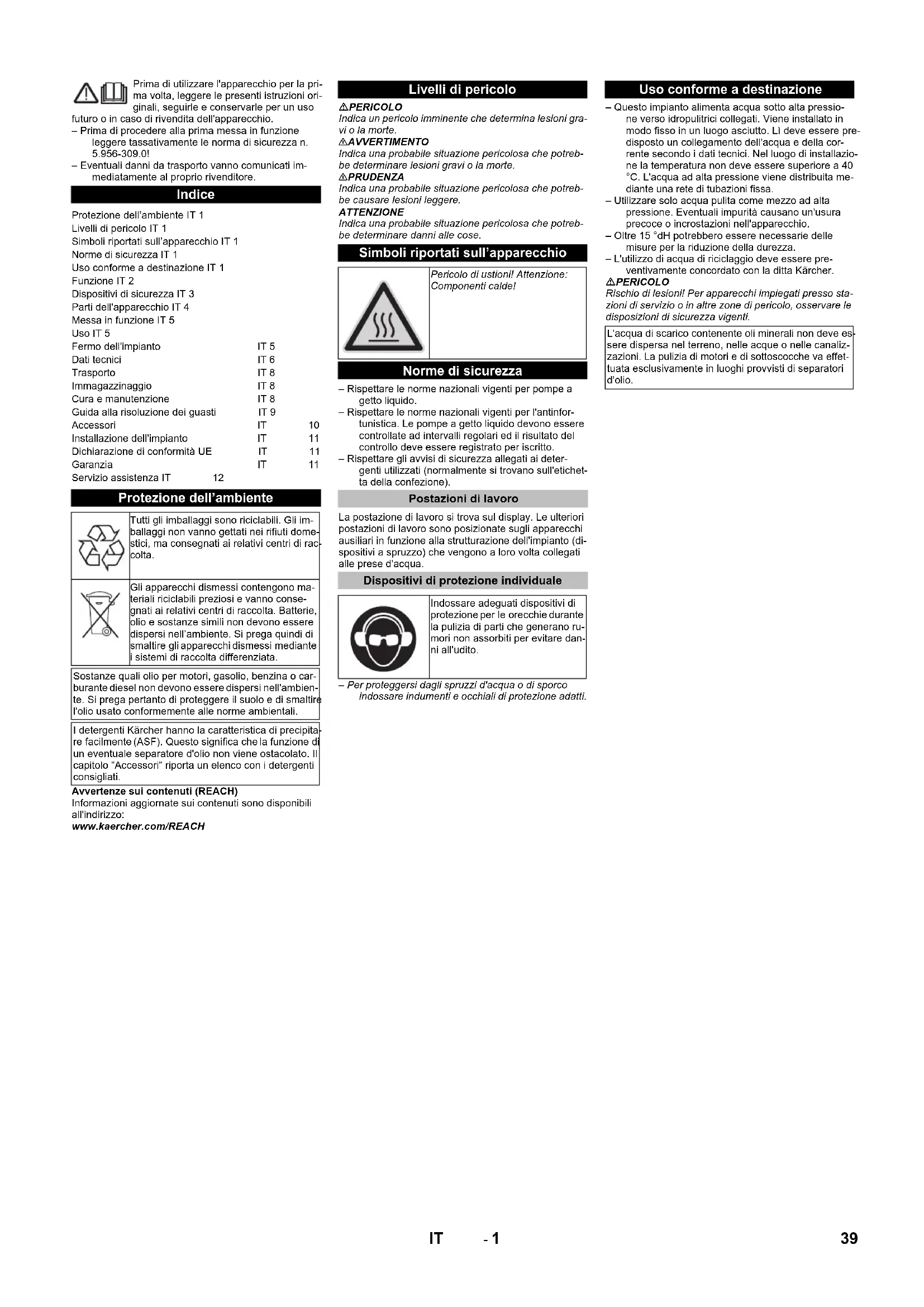 Alimentation en eau Valeur de pH 6,5...9,5Conductibilité électrique < 2000 µS/cmsubstances qui se déposent < 0,5 mg/l *Substances qui peuvent être fil-trées (dimensions des grains sous 0,025 mm)< 20 mg/lHydrocarbures < 20 mg/lChlorure < 300 mg/lCalcium < 85 mg/l **Dureté globale < 15 °dH **Fer < 0,5 mg/lManganèse < 0,05 mg/lCuivre < 0,02 mg/lexempt de mauvaises odeurs Branchement électrique Déclaration UE de conformité Produit : Nettoyeur haute pressionType : 2.509-xxxDirectives européennes en vigueur :2006/42/CE (+2009/127/CE)2009/125/CE2011/65/UE2014/30/UENormes harmonisées appliquées :EN IEC 63000: 2018EN 55014–1: 2017 + A11: 2020EN 55014–2: 2015EN 60335–1EN 60335–2–79EN 61000–3–2: 2014EN 61000–3–3: 2013EN 61000–3–12: 2011EN 61000–6–2: 2005EN 61000–6–4: 2007EN 62233: 2008Décrets appliqués(UE) 2019/1781 Garantie Chairman of the Board of ManagementDirector Regulatory Affairs & Certification 37FR- 12 Service après-vente Type de station : N° de fabrication : Date de mise en service : Contrôle effectué le : Résultat : Signature Contrôle effectué le : Résultat : Signature Contrôle effectué le : Résultat : Signature Contrôle effectué le : Résultat : Signature 38 FR- 1 Prima di utilizzare l'apparecchio per la pri- ma volta, leggere le presenti istruzioni ori- ginali, seguirle e conservarle per un uso futuro o in caso di rivendita dell'apparecchio. – Prima di procedere alla prima messa in funzione leggere tassativamente le norma di sicurezza n. 5.956-309.0! – Eventuali danni da trasporto vanno comunicati im- mediatamente al proprio rivenditore. Avvertenze sui contenuti (REACH) Informazioni aggiornate sui contenuti sono disponibili all'indirizzo: www.kaercher.com/REACH PERICOLO Indica un pericolo imminente che determina lesioni gra- vi o la morte. 몇 AVVERTIMENTO Indica una probabile situazione pericolosa che potreb- be determinare lesioni gravi o la morte. 몇 PRUDENZA Indica una probabile situazione pericolosa che potreb- be causare lesioni leggere. ATTENZIONE Indica una probabile situazione pericolosa che potreb- be determinare danni alle cose. – Rispettare le norme nazionali vigenti per pompe a getto liquido. – Rispettare le norme nazionali vigenti per l'antinfor- tunistica. Le pompe a getto liquido devono essere controllate ad intervalli regolari ed il risultato del controllo deve essere registrato per iscritto. – Rispettare gli avvisi di sicurezza allegati ai deter- genti utilizzati (normalmente si trovano sull'etichet- ta della confezione). La postazione di lavoro si trova sul display. Le ulteriori postazioni di lavoro sono posizionate sugli apparecchi ausiliari in funzione alla strutturazione dell'impianto (di- spositivi a spruzzo) che vengono a loro volta collegati alle prese d'acqua. – Per proteggersi dagli spruzzi d'acqua o di sporco indossare indumenti e occhiali di protezione adatti. – Questo impianto alimenta acqua sotto alta pressio- ne verso idropulitrici collegati. Viene installato in modo fisso in un luogo asciutto. Lì deve essere pre- disposto un collegamento dell'acqua e della cor- rente secondo i dati tecnici. Nel luogo di installazio- ne la temperatura non deve essere superiore a 40 °C. L'acqua ad alta pressione viene distribuita me- diante una rete di tubazioni fissa. – Utilizzare solo acqua pulita come mezzo ad alta pressione. Eventuali impurità causano un'usura precoce o incrostazioni nell'apparecchio. – Oltre 15 °dH potrebbero essere necessarie delle misure per la riduzione della durezza. – L'utilizzo di acqua di riciclaggio deve essere pre- ventivamente concordato con la ditta Kärcher. PERICOLO Rischio di lesioni! Per apparecchi impiegati presso sta- zioni di servizio o in altre zone di pericolo, osservare le disposizioni di sicurezza vigenti. Indice Protezione dell’ambiente IT 1 Livelli di pericolo IT 1 Simboli riportati sull’apparecchio IT 1 Norme di sicurezza IT 1 Uso conforme a destinazione IT 1 Funzione IT 2 Dispositivi di sicurezza IT 3 Parti dell'apparecchio IT 4 Messa in funzione IT 5 Uso IT 5 Fermo dell'impianto IT 5 Dati tecnici IT 6 Trasporto IT 8 Immagazzinaggio IT 8 Cura e manutenzione IT 8 Guida alla risoluzione dei guasti IT 9 Accessori IT 10 Installazione dell'impianto IT 11 Dichiarazione di conformità UE IT 11 Garanzia IT 11 Servizio assistenza IT 12 Protezione dell’ambiente Tutti gli imballaggi sono riciclabili. Gli im- ballaggi non vanno gettati nei rifiuti dome- stici, ma consegnati ai relativi centri di rac- colta. Gli apparecchi dismessi contengono ma- teriali riciclabili preziosi e vanno conse- gnati ai relativi centri di raccolta. Batterie, olio e sostanze simili non devono essere dispersi nell’ambiente. Si prega quindi di smaltire gli apparecchi dismessi mediante i sistemi di raccolta differenziata. Sostanze quali olio per motori, gasolio, benzina o car- burante diesel non devono essere dispersi nell'ambien- te. Si prega pertanto di proteggere il suolo e di smaltire l'olio usato conformemente alle norme ambientali. I detergenti Kärcher hanno la caratteristica di precipita- re facilmente (ASF). Questo significa che la funzione di un eventuale separatore d'olio non viene ostacolato. Il capitolo “Accessori” riporta un elenco con i detergenti consigliati. Livelli di pericolo Simboli riportati sull’apparecchio Pericolo di ustioni! Attenzione: Componenti calde! Norme di sicurezza Postazioni di lavoro Dispositivi di protezione individuale Indossare adeguati dispositivi di protezione per le orecchie durante la pulizia di parti che generano ru- mori non assorbiti per evitare dan- ni all'udito. Uso conforme a destinazione L'acqua di scarico contenente oli minerali non deve es- sere dispersa nel terreno, nelle acque o nelle canaliz- zazioni. La pulizia di motori e di sottoscocche va effet- tuata esclusivamente in luoghi provvisti di separatori d'olio. 39IT- 2 1 Parasporco (in loco)2 Sonda termica3 Protezione mancanza acqua4 Contenitore con galleggiante5