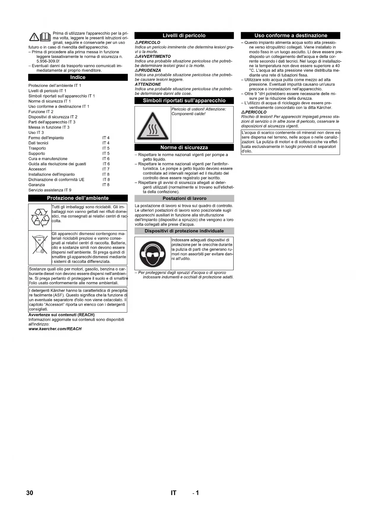 Branchement électrique Régler la pression de travail macxi sur la vanne de décharge Régler la soupape de décharge Déclaration UE de conformité Produit : Nettoyeur haute pressionType : 1.509-xxxType : 2.509-xxxDirectives européennes en vigueur :2006/42/CE (+2009/127/CE)2009/125/CE2011/65/UE2014/30/UENormes harmonisées appliquées :EN IEC 63000: 2018EN 55014–1: 2017 + A11: 2020EN 55014–2: 2015EN 60335–1EN 60335–2–79EN 61000–3–2: 2014EN 61000–3–12: 2011EN 61000–6–2: 2005EN 61000–6–4: 2007EN 62233: 2008HDC 20/8, HDC 20/8 H:EN 61000–3–3: 2013HDC 20/16, HDC 20/16 H:EN 61000–3–11: 2000Décrets appliqués(UE) 2019/1781 Garantie Chairman of the Board of ManagementDirector Regulatory Affairs & Certification 28 FR- 9 Service après-vente Type de station : N° de fabrication : Date de mise en service : Contrôle effectué le : Résultat : Signature Contrôle effectué le : Résultat : Signature Contrôle effectué le : Résultat : Signature Contrôle effectué le : Résultat : Signature 29FR- 1 Prima di utilizzare l'apparecchio per la pri- ma volta, leggere le presenti istruzioni ori- ginali, seguirle e conservarle per un uso futuro o in caso di rivendita dell'apparecchio. – Prima di procedere alla prima messa in funzione leggere tassativamente le norma di sicurezza n. 5.956-309.0! – Eventuali danni da trasporto vanno comunicati im- mediatamente al proprio rivenditore. Avvertenze sui contenuti (REACH) Informazioni aggiornate sui contenuti sono disponibili all'indirizzo: www.kaercher.com/REACH PERICOLO Indica un pericolo imminente che determina lesioni gra- vi o la morte. 몇 AVVERTIMENTO Indica una probabile situazione pericolosa che potreb- be determinare lesioni gravi o la morte. 몇 PRUDENZA Indica una probabile situazione pericolosa che potreb- be causare lesioni leggere. ATTENZIONE Indica una probabile situazione pericolosa che potreb- be determinare danni alle cose. – Rispettare le norme nazionali vigenti per pompe a getto liquido. – Rispettare le norme nazionali vigenti per l'antinfor- tunistica. Le pompe a getto liquido devono essere controllate ad intervalli regolari ed il risultato del controllo deve essere registrato per iscritto. – Rispettare gli avvisi di sicurezza allegati ai deter- genti utilizzati (normalmente si trovano sull'etichet- ta della confezione). La postazione di lavoro si trova sul quadro di controllo. Le ulteriori postazioni di lavoro sono posizionate sugli apparecchi ausiliari in funzione alla strutturazione dell'impianto (dispositivi a spruzzo) che vengono a loro volta collegati alle prese d'acqua. – Per proteggersi dagli spruzzi d'acqua o di sporco indossare indumenti e occhiali di protezione adatti. – Questo impianto alimenta acqua sotto alta pressio- ne verso idropulitrici collegati. Viene installato in modo fisso in un luogo asciutto. Lì deve essere pre- disposto un collegamento dell'acqua e della cor- rente secondo i dati tecnici. Nel luogo di installazio- ne la temperatura non deve essere superiore a 40 °C. L'acqua ad alta pressione viene distribuita me- diante una rete di tubazioni fissa. – Utilizzare solo acqua pulita come mezzo ad alta pressione. Eventuali impurità causano un'usura precoce o incrostazioni nell'apparecchio. – Oltre 9 °dH potrebbero essere necessarie delle mi- sure per la riduzione della durezza. – L'utilizzo di acqua di riciclaggio deve essere pre- ventivamente concordato con la ditta Kärcher. PERICOLO Rischio di lesioni! Per apparecchi impiegati presso sta- zioni di servizio o in altre zone di pericolo, osservare le disposizioni di sicurezza vigenti. Indice Protezione dell’ambiente IT 1 Livelli di pericolo IT 1 Simboli riportati sull’apparecchio IT 1 Norme di sicurezza IT 1 Uso conforme a destinazione IT 1 Funzione IT 2 Dispositivi di sicurezza IT 2 Parti dell'apparecchio IT 3 Messa in funzione IT 3 Uso IT 3 Fermo dell'impianto IT 4 Dati tecnici IT 4 Trasporto IT 5 Supporto IT 5 Cura e manutenzione IT 6 Guida alla risoluzione dei guasti IT 6 Accessori IT 7 Installazione dell'impianto IT 8 Dichiarazione di conformità UE IT 8 Garanzia IT 8 Servizio assistenza IT 9 Protezione dell’ambiente Tutti gli imballaggi sono riciclabili. Gli im- ballaggi non vanno gettati nei rifiuti dome- stici, ma consegnati ai relativi centri di rac- colta. Gli apparecchi dismessi contengono ma- teriali riciclabili preziosi e vanno conse- gnati ai relativi centri di raccolta. Batterie, olio e sostanze simili non devono essere dispersi nell’ambiente. Si prega quindi di smaltire gli apparecchi dismessi mediante i sistemi di raccolta differenziata. Sostanze quali olio per motori, gasolio, benzina o car- burante diesel non devono essere dispersi nell'ambien- te. Si prega pertanto di proteggere il suolo e di smaltire l'olio usato conformemente alle norme ambientali. I detergenti Kärcher hanno la caratteristica di precipita- re facilmente (ASF). Questo significa che la funzione di un eventuale separatore d'olio non viene ostacolato. Il capitolo “Accessori” riporta un elenco con i detergenti consigliati. Livelli di pericolo Simboli riportati sull’apparecchio Pericolo di ustioni! Attenzione: Componenti calde! Norme di sicurezza Postazioni di lavoro Dispositivi di protezione individuale Indossare adeguati dispositivi di protezione per le orecchie durante la pulizia di parti che generano ru- mori non assorbiti per evitare dan- ni all'udito. Uso conforme a destinazione L'acqua di scarico contenente oli minerali non deve es- sere dispersa nel terreno, nelle acque o nelle canaliz- zazioni. La pulizia di motori e di sottoscocche va effet- tuata esclusivamente in luoghi provvisti di separatori d'olio. 30 IT- 2 1 Valvola di chiusura (in loco)2 Sonda termica3 Protezione mancanza acqua4 Contenitore con galleggiante5 Pompa di mandata(solo HDC 20/8 H, HDC 20/16 H)6 Pompa con albero a gomito7 Valvola di sicurezza8 Motore elettrico9 Manometro10 Sensore di pressione11 Flussostato12 Valvola di troppopieno13 Valv