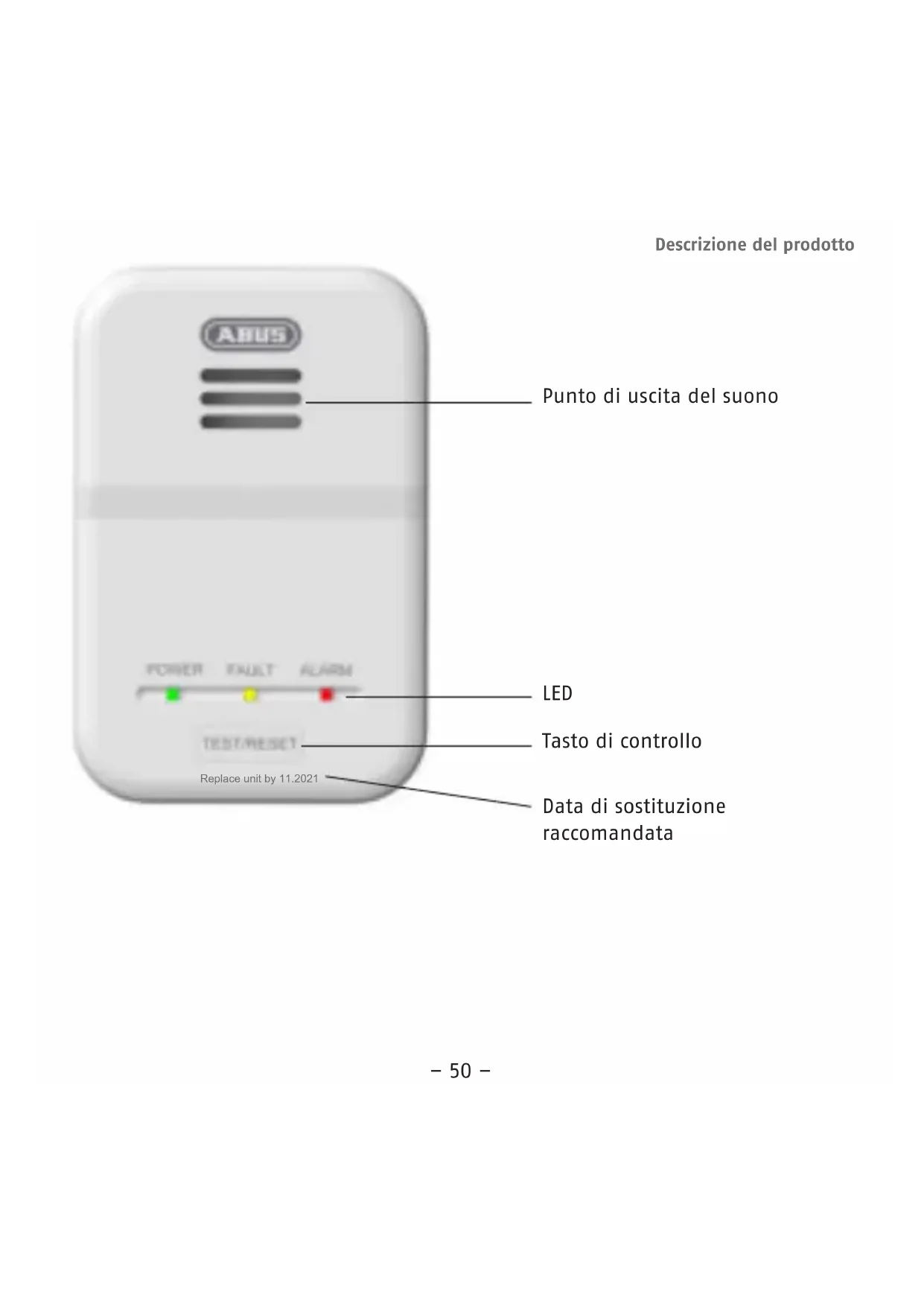 Manutenzione, controllo e cura IlLedverde“Power“devesempreessereacceso.Essoindicacheilrilevatoreèin funzione.SeilLEDverdeèspentocontrollareseilcavodicollegamentoèattaccato eseèinseritalacorrente.Setuttoèapostosignicacheilrilevatorepresentaun difetto e deve essere sostituito. Cose fare quando scatta l'allarme, Manutenzione, controllo e cura– 59 – Noiconsigliamodieettuareunaprovadifunzionamentounavoltaalmese:pre- mereilpulsante“Test”sull’apparecchioperfarscattareunallarmediprova
