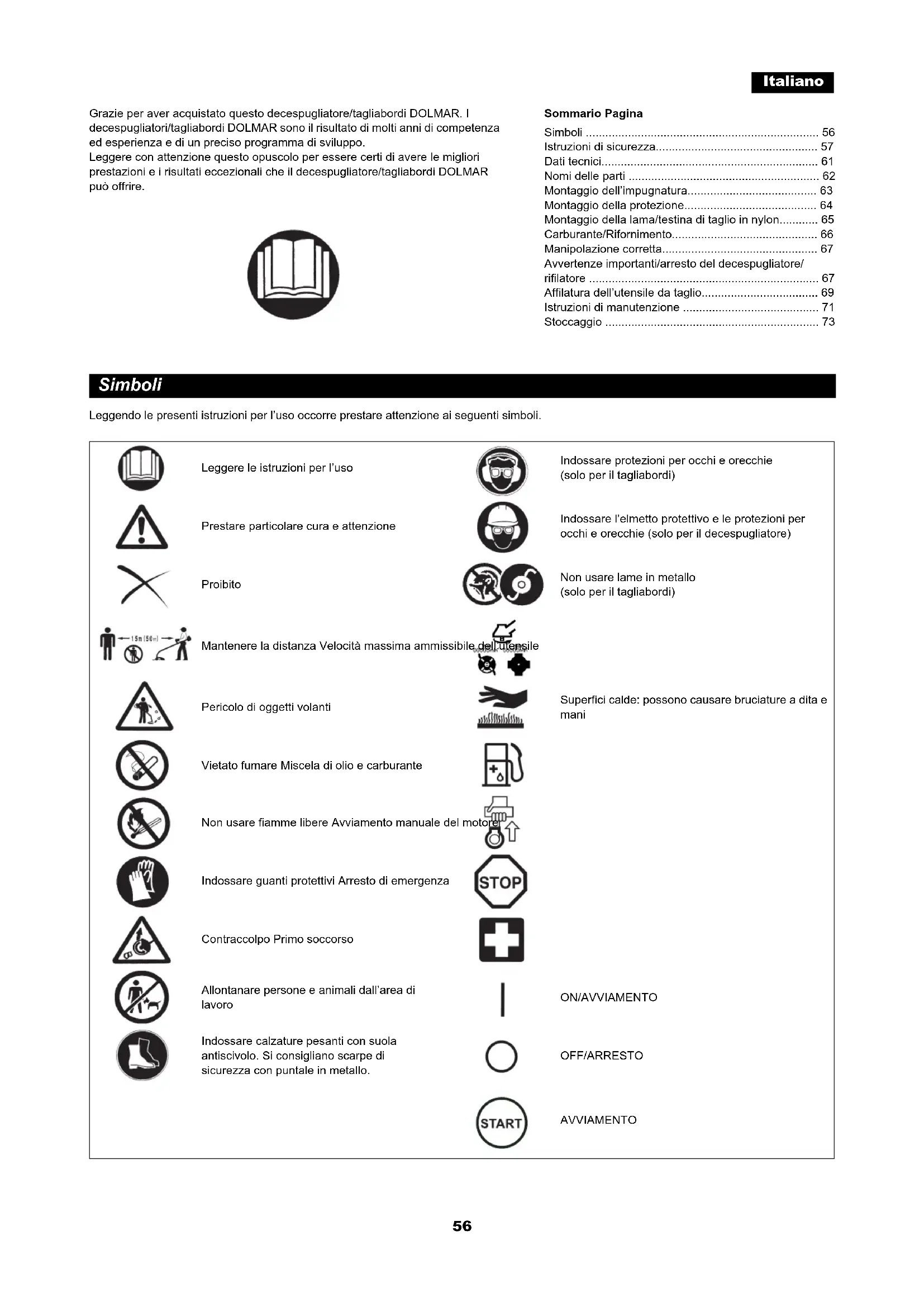 - Vergaser verschmutzt, muss gereinigt werden Motor startet, geht jedoch gleich wieder aus Kraftstoffzufuhr Tank gefüllt Falsche Leerlaufeinstellung, Vergaser verschmutzt Problem mit Lüftungsöffnung im Kraftstofftank, Kraftstoff- Zufuhrleitung unterbrochen, Kabel oder I-Stopp-Schalter (Ein/Aus)/Start-Stopp-Schalter defekt Unzureichende Leistung Möglicherweise sind mehrere Systeme gleichzeitig betroffen. Motorleerlaufdrehzahl zu niedrig Luftfilter verschmutzt, Vergaser verschmutzt, Schalldämpfer verstopft, Auslasskanal im Zylinder verstopft Kraftstoff ablassen Feuchtigkeit56 Grazie per aver acquistato questo decespugliatore/tagliabordi DOLMAR. I decespugliatori/tagliabordi DOLMAR sono il risultato di molti anni di competenza ed esperienza e di un preciso programma di sviluppo. Leggere con attenzione questo opuscolo per essere certi di avere le migliori prestazioni e i risultati eccezionali che il decespugliatore/tagliabordi DOLMAR può offrire. Leggendo le presenti istruzioni per l’uso occorre prestare attenzione ai seguenti simboli. Simboli Leggere le istruzioni per l’uso Indossare protezioni per occhi e orecchie (solo per il tagliabordi) Prestare particolare cura e attenzione Indossare l’elmetto protettivo e le protezioni per occhi e orecchie (solo per il decespugliatore) Proibito Non usare lame in metallo (solo per il tagliabordi) Mantenere la distanza Velocità massima ammissibile dell’utensile Pericolo di oggetti volanti Superfici calde: possono causare bruciature a dita e mani Vietato fumare Miscela di olio e carburante Non usare fiamme libere Avviamento manuale del motore Indossare guanti protettivi Arresto di emergenza Contraccolpo Primo soccorso Allontanare persone e animali dall’area di lavoro ON/AVVIAMENTO Indossare calzature pesanti con suola antiscivolo. Si consigliano scarpe di sicurezza con puntale in metallo. OFF/ARRESTO AVVIAMENTO Sommario Pagina Simboli p. 56