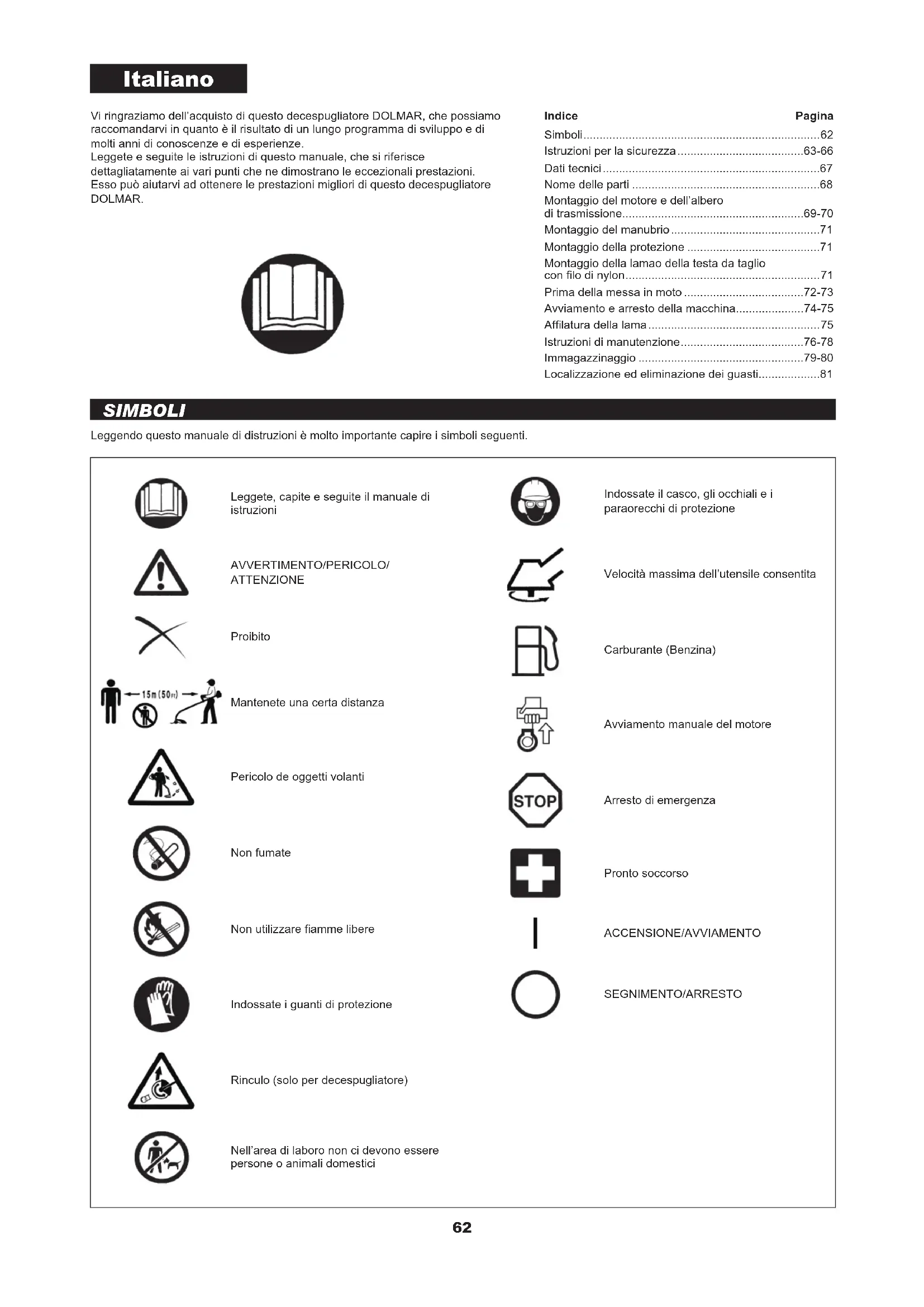 Mantenete una certa distanza Pericolo de oggetti volantiNon fumateNon utilizzare amme libereIndossate i guanti di protezioneRinculo (solo per decespugliatore)Nell’area di laboro non ci devono essere persone o animali domesticiIndossate il casco, gli occhiali e i paraorecchi di protezioneVelocità massima dell’utensile consentitaCarburante (Benzina)Avviamento manuale del motoreArresto di emergenzaPronto soccorsoACCENSIONE/AVVIAMENTOSEGNIMENTO/ARRESTO63