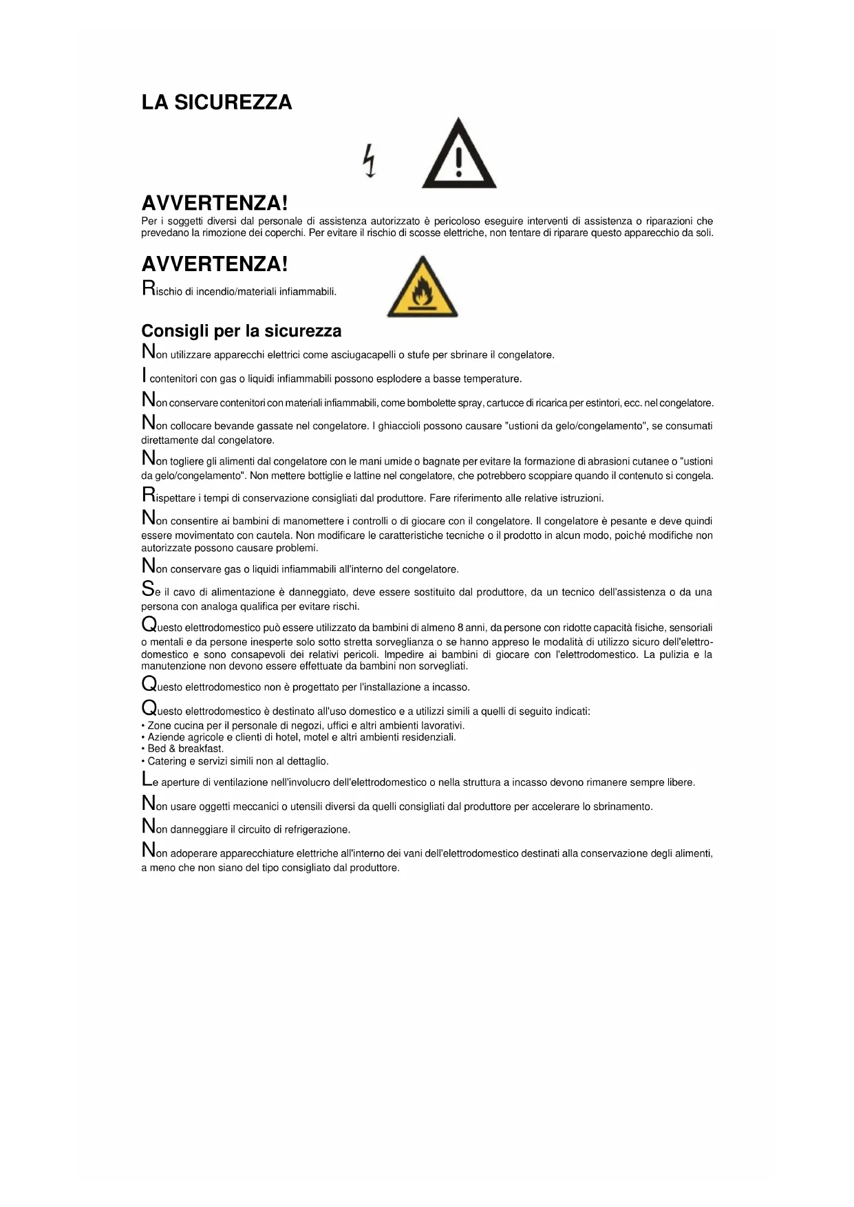 Consigli per la sicurezza Non utilizzare apparecchi elettrici come asciugacapelli o stufe per sbrinare il congelatore. I contenitori con gas o liquidi infiammabili possono esplodere a basse temperature. Non conservare contenitori con materiali infiammabili, come bombolette spray, cartucce di ricarica per estintori, ecc. nel congelatore. Non collocare bevande gassate nel congelatore. I ghiaccioli possono causare "ustioni da gelo/congelamento", se consumati direttamente dal congelatore. Non togliere gli alimenti dal congelatore con le mani umide o bagnate per evitare la formazione di abrasioni cutanee o "ustioni da gelo/congelamento". Non mettere bottiglie e lattine nel congelatore, che potrebbero scoppiare quando il contenuto si congela. Rispettare i tempi di conservazione consigliati dal produttore. Fare riferimento alle relative istruzioni. Non consentire ai bambini di manomettere i controlli o di giocare con il congelatore. Il congelatore è pesante e deve quindi essere movimentato con cautela. Non modificare le caratteristiche tecniche o il prodotto in alcun modo, poiché modifiche non autorizzate possono causare problemi. Non conservare gas o liquidi infiammabili all'interno del congelatore. Se il cavo di alimentazione è danneggiato, deve essere sostituito dal produttore, da un tecnico dell'assistenza o da una persona con analoga qualifica per evitare rischi. Questo elettrodomestico può essere utilizzato da bambini di almeno 8 anni, da persone con ridotte capacità fisiche, sensoriali o mentali e da persone inesperte solo sotto stretta sorveglianza o se hanno appreso le modalità di utilizzo sicuro dell'elettro- domestico e sono consapevoli dei relativi pericoli. Impedire ai bambini di giocare con l'elettrodomestico. La pulizia e la manutenzione non devono essere effettuate da bambini non sorvegliati. Questo elettrodomestico non è progettato per l'installazione a incasso. Questo elettrodomestico è destinato all'uso domestico e a utilizzi simili a quelli di seguito indicati: