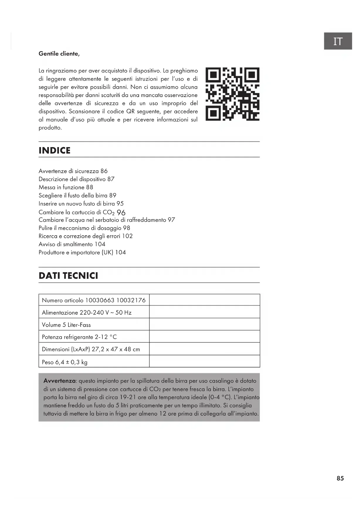Gentile cliente, La ringraziamo per aver acquistato il dispositivo. La preghiamo di leggere attentamente le seguenti istruzioni per l’uso e di seguirle per evitare possibili danni. Non ci assumiamo alcuna responsabilità per danni scaturiti da una mancata osservazione delle avvertenze di sicurezza e da un uso improprio del dispositivo. Scansionare il codice QR seguente, per accedere al manuale d’uso più attuale e per ricevere informazioni sul prodotto. INDICE Avvertenze di sicurezza86 Descrizione del dispositivo87 Messa in funzione88 Scegliere il fusto della birra89 Inserire un nuovo fusto di birra95 Cambiare la cartuccia di CO ₂96 Cambiare l’acqua nel serbatoio di raffreddamento97 Pulire il meccanismo di dosaggio98 Ricerca e correzione degli errori102 Avviso di smaltimento104 Produttore e importatore (UK)104 DATI TECNICI Numero articolo 10030663 10032176 Alimentazione 220-240 V ~ 50 Hz Volume 5 Liter-Fass Potenza refrigerante 2-12 °C Dimensioni (LxAxP) 27,2 x 47 x 48 cm Peso 6,4 ± 0,3 kg Avvertenza: questo impianto per la spillatura della birra per uso casalingo è dotato di un sistema di pressione con cartucce di CO₂ per tenere fresca la birra. L’impianto porta la birra nel giro di circa 19-21 ore alla temperatura ideale (0-4 °C). L’impianto mantiene freddo un fusto da 5 litri praticamente per un tempo illimitato. Si consiglia tuttavia di mettere la birra in frigo per almeno 12 ore prima di collegarla all’impianto.86