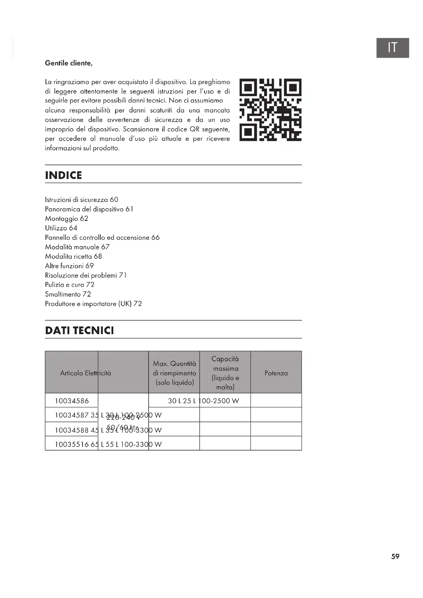 Gentile cliente, La ringraziamo per aver acquistato il dispositivo. La preghiamo di leggere attentamente le seguenti istruzioni per l’uso e di seguirle per evitare possibili danni tecnici. Non ci assumiamo alcuna responsabilità per danni scaturiti da una mancata osservazione delle avvertenze di sicurezza e da un uso improprio del dispositivo. Scansionare il codice QR seguente, per accedere al manuale d’uso più attuale e per ricevere informazioni sul prodotto. INDICE Istruzioni di sicurezza60 Panoramica del dispositivo61 Montaggio62 Utilizzo64 Pannello di controllo ed accensione66 Modalità manuale67 Modalita ricetta68 Altre funzioni69 Risoluzione dei problemi71 Pulizia e cura72 Smaltimento72 Produttoree importatore (UK) 72 DATI TECNICI Articolo Elettricità Max. Quantità di riempimento (solo liquido) Capacità massima (liquido e malto) Potenza