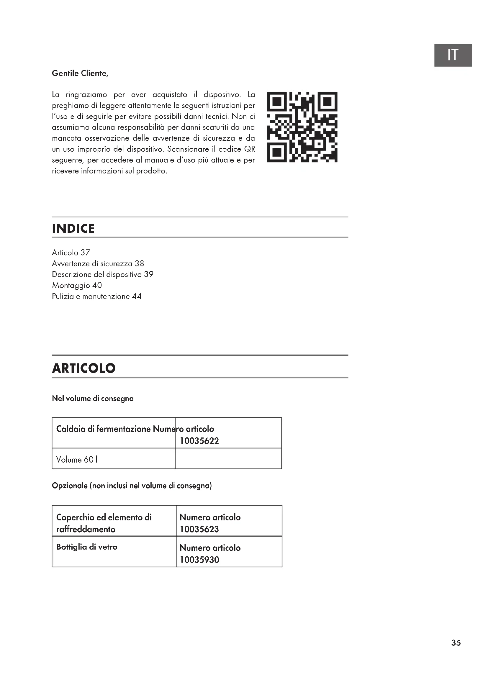 Articolo 37 Avvertenze di sicurezza 38 Descrizione del dispositivo 39 Montaggio 40 Pulizia e manutenzione 44 Gentile Cliente, La ringraziamo per aver acquistato il dispositivo. La preghiamo di leggere attentamente le seguenti istruzioni per l’uso e di seguirle per evitare possibili danni tecnici. Non ci assumiamo alcuna responsabilità per danni scaturiti da una mancata osservazione delle avvertenze di sicurezza e da un uso improprio del dispositivo. Scansionare il codice QR seguente, per accedere al manuale d’uso più attuale e per ricevere informazioni sul prodotto. INDICE ARTICOLO Nel volume di consegna Caldaia di fermentazione Numero articolo