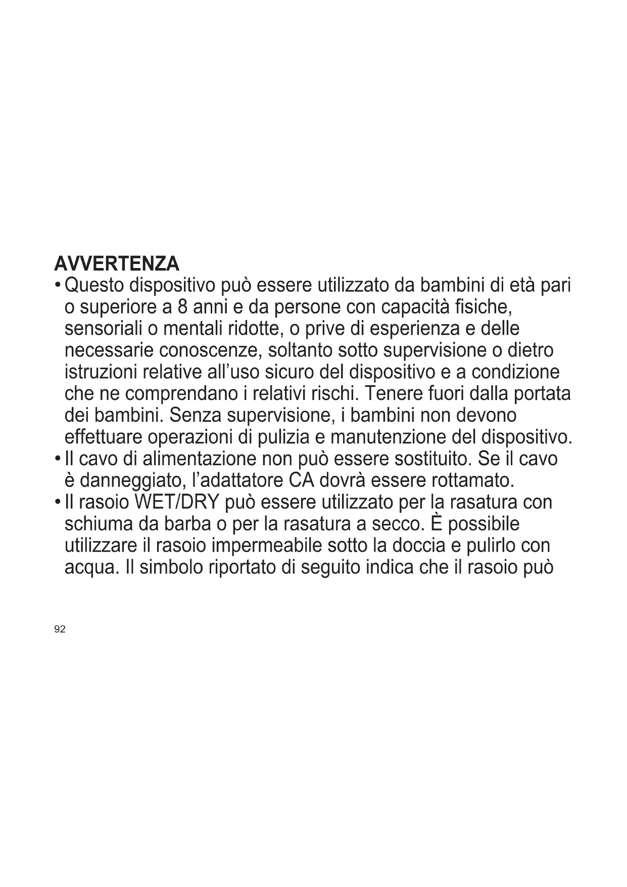Il rasoio WET/DRY può essere utilizzato per la rasatura con schiuma da barba o per la rasatura a secco. È possibile utilizzare il rasoio impermeabile sotto la doccia e pulirlo con acqua. Il simbolo riportato di seguito indica che il rasoio può93 TR RO H SK CZ PL FIN S N P DK E NL I F D GB essere utilizzato in una vasca da bagno o sotto la doccia.