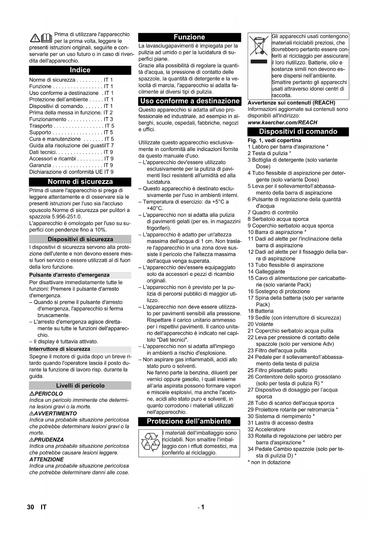 dB(A) 87 Accessoires et pièces de rechange Garantie Déclaration UE de conformité Produit : Nettoyeur de plancher appa- reil à accrocher Type : 1.161-xxx Directives européennes en vigueur : 2006/42/CE (+2009/127/CE) 2014/30/UE Normes harmonisées appliquées : EN 55014–1: 2006+A1: 2009+A2: 2011 EN 55014–2: 2015 EN 60335–1 EN 60335–2–29: 2004+A2: 2010 EN 60335–2–72 EN 61000–3–2: 2014 EN 61000–3–3: 2013 EN 62233: 2008 Normes nationales appliquées : Chairman of the Board of Management Director Regulatory Affairs & Certification 29FR- 1 Prima di utilizzare l'apparecchio per la prima volta, leggere le presenti istruzioni originali, seguirle e con- servarle per un uso futuro o in caso di riven- dita dell'apparecchio. Prima di usare l'apparecchio si prega di leggere attentamente e di osservare sia le presenti istruzioni per l'uso sia l'accluso opuscolo Norme di sicurezza per pulitori a spazzola 5.956-251.0. L'apparecchio è omologato per l'uso su su- perfici con pendenze fino a 10%. I dispositivi di sicurezza servono alla prote- zione dell'utente e non devono essere mes- si fuori servizio o essere utilizzati al di fuori della loro funzione. Per disattivare immediatamente tutte le funzioni: Premere il pulsante d'arresto d'emergenza. – Quando si preme il pulsante d'arresto d'emergenza, l'apparecchio si ferma bruscamente. – L'arresto d'emergenza agisce diretta- mente su tutte le funzioni dell'apparec- chio. – Il display è tuttavia attivato. Spegne il motore di guida dopo un breve ri- tardo quando l'operatore lascia il posto du- rante la funzione di lavoro risp. durante la guida. PERICOLO Indica un pericolo imminente che determi- na lesioni gravi o la morte. 몇 AVVERTIMENTO Indica una probabile situazione pericolosa che potrebbe determinare lesioni gravi o la morte. 몇 PRUDENZA Indica una probabile situazione pericolosa che potrebbe causare lesioni leggere. ATTENZIONE Indica una probabile situazione pericolosa che potrebbe determinare danni alle cose. La lavasciugapavimenti è impiegata per la pulizia ad umido o per la lucidatura di su- perfici piane. Grazie alla possibilità di regolare la quanti- tà d'acqua, la pressione di contatto delle spazzole, la quantità di detergente e la ve- locità di marcia, l'apparecchio si adatta fa- cilmente ai diversi tipi di pulizia. Questo apparecchio si adatta all'uso pro- fessionale ed industriale, ad esempio in al- berghi, scuole, ospedali, fabbriche, negozi e uffici. Utilizzate questo apparecchio esclusiva- mente in conformità alle indicazioni fornite da questo manuale d'uso. – L'apparecchio dev'essere utilizzato esclusivamente per la pulizia di pavi- menti lisci resistenti all'umidità ed alla lucidatura. – Questo apparecchio è destinato esclu- sivamente per l'uso in ambienti interni. – Temperatura di esercizio: da +5°C a +40°C. – L'apparecchio non si adatta alla pulizia di pavimenti gelati (per es. in magazzini frigoriferi). – L'apparecchio è adatto per un'altezza massima dell'acqua di 1 cm. Non trasla- re l'apparecchio in una zona dove sus- siste il pericolo che l'altezza massima dell'acqua venga superata. – L'apparecchio dev'essere equipaggiato solo da accessori e pezzi di ricambio originali. – L'apparecchio non è previsto per la pu- lizia di percorsi pubblici di maggior uti- lizzo. – L'apparecchio non deve essere utilizza- to per pavimenti sensibili alla pressione. Rispettare il carico unitario ammesso per i rispettivi pavimenti. Il carico unita- rio dell'apparecchio è indicato nel capi- tolo "Dati tecnici". – L'apparecchio non si adatta all'impiego in ambienti a rischio d'esplosione. – Non aspirare gas infiammabili, acidi allo stato puro o solventi. Ne fanno parte la benzina, diluenti per vernici oppure gasolio, i quali insieme all’aria aspirata possono formare vapori e miscele esplosivi, ma anche l'aceto- ne, acidi allo stato puro e solventi, in quanto corrodono i materiali utilizzati nell'apparecchio. Avvertenze sui contenuti (REACH) Informazioni aggiornate sui contenuti sono disponibili all'indirizzo: www.kaercher.com/REACH Fig. 1, vedi copertina 1 Labbro per barra d'aspirazione * 2 Testa di pulizia * 3 Bottiglia di detergente (solo variante Dose) 4 Tubo flessibile di aspirazione per deter- gente (solo variante Dose) 5 Leva per il sollevamento/l’abbassa- mento della barra di aspirazione 6 Pulsante di regolazione della quantità d'acqua 7 Quadro di controllo 8 Serbatoio acqua sporca 9 Coperchio serbatoio acqua sporca 10 Barra di aspirazione * 11 Dadi ad alette per l'inclinazione della barra di aspirazione 12 Dadi ad alette per il fissaggio della bar- ra di aspirazione 13 Tubo flessibile di aspirazione 14 Galleggiante 15 Cavo di alimentazione per caricabatte- rie (solo variante Pack) 16 Sostegno di protezione 17 Spina della batteria (solo per variante Pack) 18 Batteria 19 Sedile (con interruttore di sicurezza) 20 Volante 21 Coperchio serbatoio acqua pulita 22 Leva per pressione di contatto delle spazzole (solo per versione Adv) 23 Filtro dell'acqua pulita 24 Pedale per il sollevamento/l’abbassa- mento della testa di pulizia 25 Filtro plissettato piatto 26 Contenitore dello sporco grossolano (solo per testa di pulizia R) * 27 Dispositivo di dosaggio per l’acqua sporca 28 Tubo di scarico dell'acqua sporca 29 Proiettore rotante per retromarcia * 30 Sistema di riempimento * 31 Lastra di accesso destra 32 Acceleratore 33 Rotella di regolazione per labbro per barra d'aspirazione * 34 Pedale Cambio spazzole (solo per te- sta di pulizia D) *