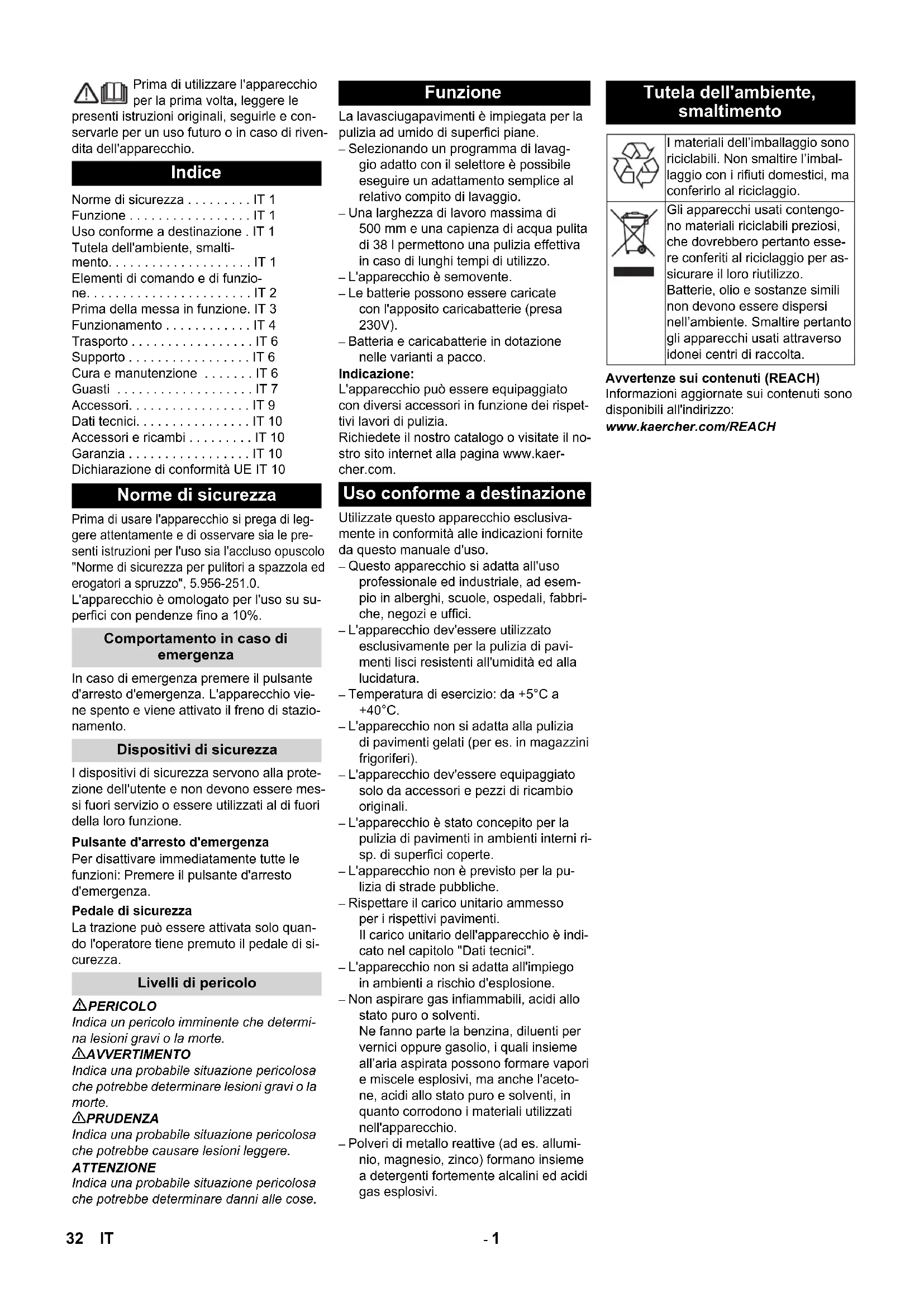 Chairman of the Board of Management Director Regulatory Affairs & Certification 31FR- 1 Prima di utilizzare l'apparecchio per la prima volta, leggere le presenti istruzioni originali, seguirle e con- servarle per un uso futuro o in caso di riven- dita dell'apparecchio. Prima di usare l'apparecchio si prega di leg- gere attentamente e di osservare sia le pre- senti istruzioni per l'uso sia l'accluso opuscolo "Norme di sicurezza per pulitori a spazzola ed erogatori a spruzzo", 5.956-251.0. L'apparecchio è omologato per l'uso su su- perfici con pendenze fino a 10%. In caso di emergenza premere il pulsante d'arresto d'emergenza. L'apparecchio vie- ne spento e viene attivato il freno di stazio- namento. I dispositivi di sicurezza servono alla prote- zione dell'utente e non devono essere mes- si fuori servizio o essere utilizzati al di fuori della loro funzione. Per disattivare immediatamente tutte le funzioni: Premere il pulsante d'arresto d'emergenza. La trazione può essere attivata solo quan- do l'operatore tiene premuto il pedale di si- curezza. PERICOLO Indica un pericolo imminente che determi- na lesioni gravi o la morte. 몇 AVVERTIMENTO Indica una probabile situazione pericolosa che potrebbe determinare lesioni gravi o la morte. 몇 PRUDENZA Indica una probabile situazione pericolosa che potrebbe causare lesioni leggere. ATTENZIONE Indica una probabile situazione pericolosa che potrebbe determinare danni alle cose. La lavasciugapavimenti è impiegata per la pulizia ad umido di superfici piane. – Selezionando un programma di lavag- gio adatto con il selettore è possibile eseguire un adattamento semplice al relativo compito di lavaggio. – Una larghezza di lavoro massima di 500 mm e una capienza di acqua pulita di 38 l permettono una pulizia effettiva in caso di lunghi tempi di utilizzo. – L'apparecchio è semovente. – Le batterie possono essere caricate con l'apposito caricabatterie (presa 230V). – Batteria e caricabatterie in dotazione nelle varianti a pacco. Indicazione: L'apparecchio può essere equipaggiato con diversi accessori in funzione dei rispet- tivi lavori di pulizia. Richiedete il nostro catalogo o visitate il no- stro sito internet alla pagina www.kaer- cher.com. Utilizzate questo apparecchio esclusiva- mente in conformità alle indicazioni fornite da questo manuale d'uso. – Questo apparecchio si adatta all'uso professionale ed industriale, ad esem- pio in alberghi, scuole, ospedali, fabbri- che, negozi e uffici. – L'apparecchio dev'essere utilizzato esclusivamente per la pulizia di pavi- menti lisci resistenti all'umidità ed alla lucidatura. – Temperatura di esercizio: da +5°C a +40°C. – L'apparecchio non si adatta alla pulizia di pavimenti gelati (per es. in magazzini frigoriferi). – L'apparecchio dev'essere equipaggiato solo da accessori e pezzi di ricambio originali. – L'apparecchio è stato concepito per la pulizia di pavimenti in ambienti interni ri- sp. di superfici coperte. – L'apparecchio non è previsto per la pu- lizia di strade pubbliche. – Rispettare il carico unitario ammesso per i rispettivi pavimenti. Il carico unitario dell'apparecchio è indi- cato nel capitolo "Dati tecnici". – L'apparecchio non si adatta all'impiego in ambienti a rischio d'esplosione. – Non aspirare gas infiammabili, acidi allo stato puro o solventi. Ne fanno parte la benzina, diluenti per vernici oppure gasolio, i quali insieme all’aria aspirata possono formare vapori e miscele esplosivi, ma anche l'aceto- ne, acidi allo stato puro e solventi, in quanto corrodono i materiali utilizzati nell'apparecchio. – Polveri di metallo reattive (ad es. allumi- nio, magnesio, zinco) formano insieme a detergenti fortemente alcalini ed acidi gas esplosivi. Avvertenze sui contenuti (REACH) Informazioni aggiornate sui contenuti sono disponibili all'indirizzo: www.kaercher.com/REACH Indice Norme di sicurezza ... IT 1 Funzione ... IT 1 Uso conforme a destinazione . IT 1 Tutela dell'ambiente, smalti- mento... IT 1 Elementi di comando e di funzio- ne... IT 2 Prima della messa in funzione. IT 3 Funzionamento ... IT 4 Trasporto ... IT 6 Supporto ... IT 6 Cura e manutenzione ... IT 6 Guasti ... IT 7 Accessori... IT 9 Dati tecnici... IT 10 Accessori e ricambi ... IT 10 Garanzia ... IT 10 Dichiarazione di conformità UE IT 10 Norme di sicurezza Comportamento in caso di emergenza Dispositivi di sicurezza Pulsante d'arresto d'emergenza Pedale di sicurezza Livelli di pericolo Funzione Uso conforme a destinazione Tutela dell'ambiente, smaltimento I materiali dell’imballaggio sono riciclabili. Non smaltire l’imbal- laggio con i rifiuti domestici, ma conferirlo al riciclaggio. Gli apparecchi usati contengo- no materiali riciclabili preziosi, che dovrebbero pertanto esse- re conferiti al riciclaggio per as- sicurare il loro riutilizzo. Batterie, olio e sostanze simili non devono essere dispersi nell’ambiente. Smaltire pertanto gli apparecchi usati attraverso idonei centri di raccolta. 32 IT- 2 1 Giunto per tubo flessibile, automatismo di riempimento 2 Serbatoio acqua pulita 3 Indicatore del livello di carica (solo per variante Bp Pack) 4 Serbatoio acqua sporca 5 Galleggiante 6 Tubo di scarico dell'acqua sporca 7 Spina dell'apparecchio 8 Spina della batteria 9 Batteria 10 Spina di rete per caricabatterie (solo per variante Bp Pack) 11 Barra di aspirazione 12 Valvola acqua pulita 13 Filtro acqua pulita 14 Coperchio serbatoio acqua pulita 15 Testa di pulizia 16 Aggancio per la barra di aspirazione per sporco ostinato (metodo a due inter- venti) 17 Indicatore di livello acqua pulita Tubo di scarico dell'acqua pulita 18 Acceleratore 19 Superficie piana per operatore 20 Pedale di sicurezza 21 Chiusura 22 Quadro di comando 23 Volante 24 Leva di sblocco, guida 25 Leva di sblocco, spingere A Spazzatrice sporco grossolano (solo per la variante BR) B Paraspruzzi, laterale (solo per la varian- te BR) – Gli elementi di comando per il processo di pulizia sono gialli. – Gli elementi d