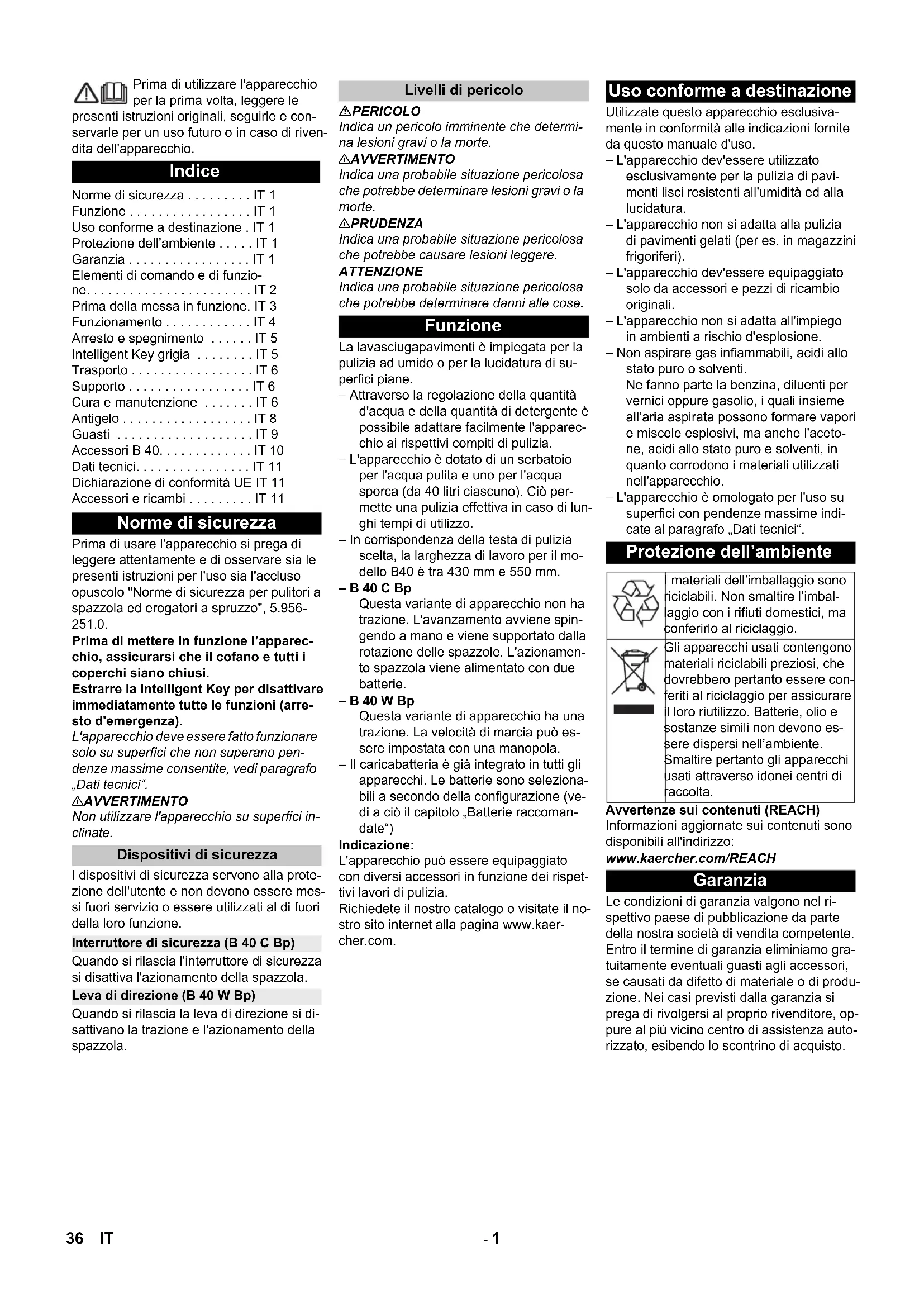 Prima di mettere in funzione l’apparec- chio, assicurarsi che il cofano e tutti i coperchi siano chiusi. Estrarre la Intelligent Key per disattivare immediatamente tutte le funzioni (arre- sto d'emergenza). L'apparecchio deve essere fatto funzionare solo su superfici che non superano pen- denze massime consentite, vedi paragrafo „Dati tecnici“. 몇 AVVERTIMENTO Non utilizzare l'apparecchio su superfici in- clinate. I dispositivi di sicurezza servono alla prote- zione dell'utente e non devono essere mes- si fuori servizio o essere utilizzati al di fuori della loro funzione. Quando si rilascia l'interruttore di sicurezza si disattiva l'azionamento della spazzola. Quando si rilascia la leva di direzione si di- sattivano la trazione e l'azionamento della spazzola. PERICOLO Indica un pericolo imminente che determi- na lesioni gravi o la morte. 몇 AVVERTIMENTO Indica una probabile situazione pericolosa che potrebbe determinare lesioni gravi o la morte. 몇 PRUDENZA Indica una probabile situazione pericolosa che potrebbe causare lesioni leggere. ATTENZIONE Indica una probabile situazione pericolosa che potrebbe determinare danni alle cose. La lavasciugapavimenti è impiegata per la pulizia ad umido o per la lucidatura di su- perfici piane. – Attraverso la regolazione della quantità d'acqua e della quantità di detergente è possibile adattare facilmente l'apparec- chio ai rispettivi compiti di pulizia. – L'apparecchio è dotato di un serbatoio per l'acqua pulita e uno per l'acqua sporca (da 40 litri ciascuno). Ciò per- mette una pulizia effettiva in caso di lun- ghi tempi di utilizzo. – In corrispondenza della testa di pulizia scelta, la larghezza di lavoro per il mo- dello B40 è tra 430 mm e 550 mm. – B 40 C Bp Questa variante di apparecchio non ha trazione. L'avanzamento avviene spin- gendo a mano e viene supportato dalla rotazione delle spazzole. L'azionamen- to spazzola viene alimentato con due batterie. – B 40 W Bp Questa variante di apparecchio ha una trazione. La velocità di marcia può es- sere impostata con una manopola. – Il caricabatteria è già integrato in tutti gli apparecchi. Le batterie sono seleziona- bili a secondo della configurazione (ve- di a ciò il capitolo „Batterie raccoman- date“) Indicazione: L'apparecchio può essere equipaggiato con diversi accessori in funzione dei rispet- tivi lavori di pulizia. Richiedete il nostro catalogo o visitate il no- stro sito internet alla pagina www.kaer- cher.com. Utilizzate questo apparecchio esclusiva- mente in conformità alle indicazioni fornite da questo manuale d'uso. – L'apparecchio dev'essere utilizzato esclusivamente per la pulizia di pavi- menti lisci resistenti all'umidità ed alla lucidatura. – L'apparecchio non si adatta alla pulizia di pavimenti gelati (per es. in magazzini frigoriferi). – L'apparecchio dev'essere equipaggiato solo da accessori e pezzi di ricambio originali. – L'apparecchio non si adatta all'impiego in ambienti a rischio d'esplosione. – Non aspirare gas infiammabili, acidi allo stato puro o solventi. Ne fanno parte la benzina, diluenti per vernici oppure gasolio, i quali insieme all’aria aspirata possono formare vapori e miscele esplosivi, ma anche l'aceto- ne, acidi allo stato puro e solventi, in quanto corrodono i materiali utilizzati nell'apparecchio. – L'apparecchio è omologato per l'uso su superfici con pendenze massime indi- cate al paragrafo „Dati tecnici“. Avvertenze sui contenuti (REACH) Informazioni aggiornate sui contenuti sono disponibili all'indirizzo: www.kaercher.com/REACH Le condizioni di garanzia valgono nel ri- spettivo paese di pubblicazione da parte della nostra società di vendita competente. Entro il termine di garanzia eliminiamo gra- tuitamente eventuali guasti agli accessori, se causati da difetto di materiale o di produ- zione. Nei casi previsti dalla garanzia si prega di rivolgersi al proprio rivenditore, op- pure al più vicino centro di assistenza auto- rizzato, esibendo lo scontrino di acquisto. Indice Norme di sicurezza ... IT 1 Funzione ... IT 1 Uso conforme a destinazione . IT 1 Protezione dell’ambiente ... IT 1 Garanzia ... IT 1 Elementi di comando e di funzio- ne... IT 2 Prima della messa in funzione. IT 3 Funzionamento ... IT 4 Arresto e spegnimento ... IT 5 Intelligent Key grigia ... IT 5 Trasporto ... IT 6 Supporto ... IT 6 Cura e manutenzione ... IT 6 Antigelo ... IT 8 Guasti ... IT 9 Accessori B 40... IT 10 Dati tecnici... IT 11 Dichiarazione di conformità UE IT 11 Accessori e ricambi ... IT 11 Norme di sicurezza Dispositivi di sicurezza Interruttore di sicurezza (B 40 C Bp) Leva di direzione (B 40 W Bp) Livelli di pericolo Funzione Uso conforme a destinazione Protezione dell’ambiente I materiali dell’imballaggio sono riciclabili. Non smaltire l’imbal- laggio con i rifiuti domestici, ma conferirlo al riciclaggio. Gli apparecchi usati contengono materiali riciclabili preziosi, che dovrebbero pertanto essere con- feriti al riciclaggio per assicurare il loro riutilizzo. Batterie, olio e sostanze simili non devono es- sere dispersi nell’ambiente. Smaltire pertanto gli apparecchi usati attraverso idonei centri di raccolta. Garanzia 36 IT- 2 1 Leva abbassamento barra di aspirazio-