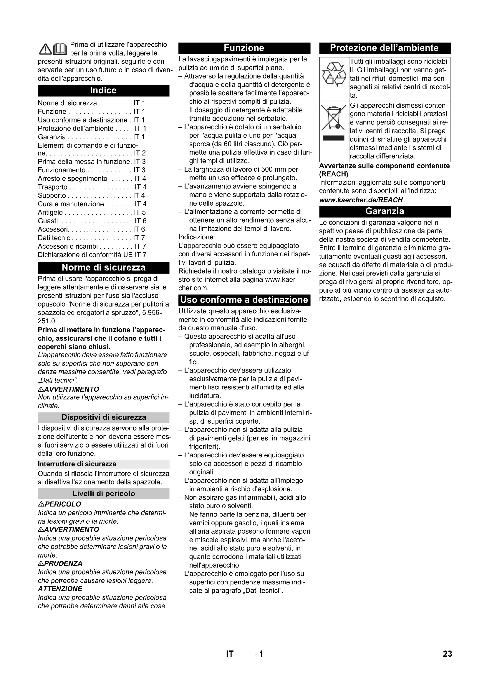 Chairman of the Board of Management Director Regulatory Affairs & Certification 22 FR- 1 Prima di utilizzare l'apparecchio per la prima volta, leggere le presenti istruzioni originali, seguirle e con- servarle per un uso futuro o in caso di riven- dita dell'apparecchio. Prima di usare l'apparecchio si prega di leggere attentamente e di osservare sia le presenti istruzioni per l'uso sia l'accluso opuscolo "Norme di sicurezza per pulitori a spazzola ed erogatori a spruzzo", 5.956-