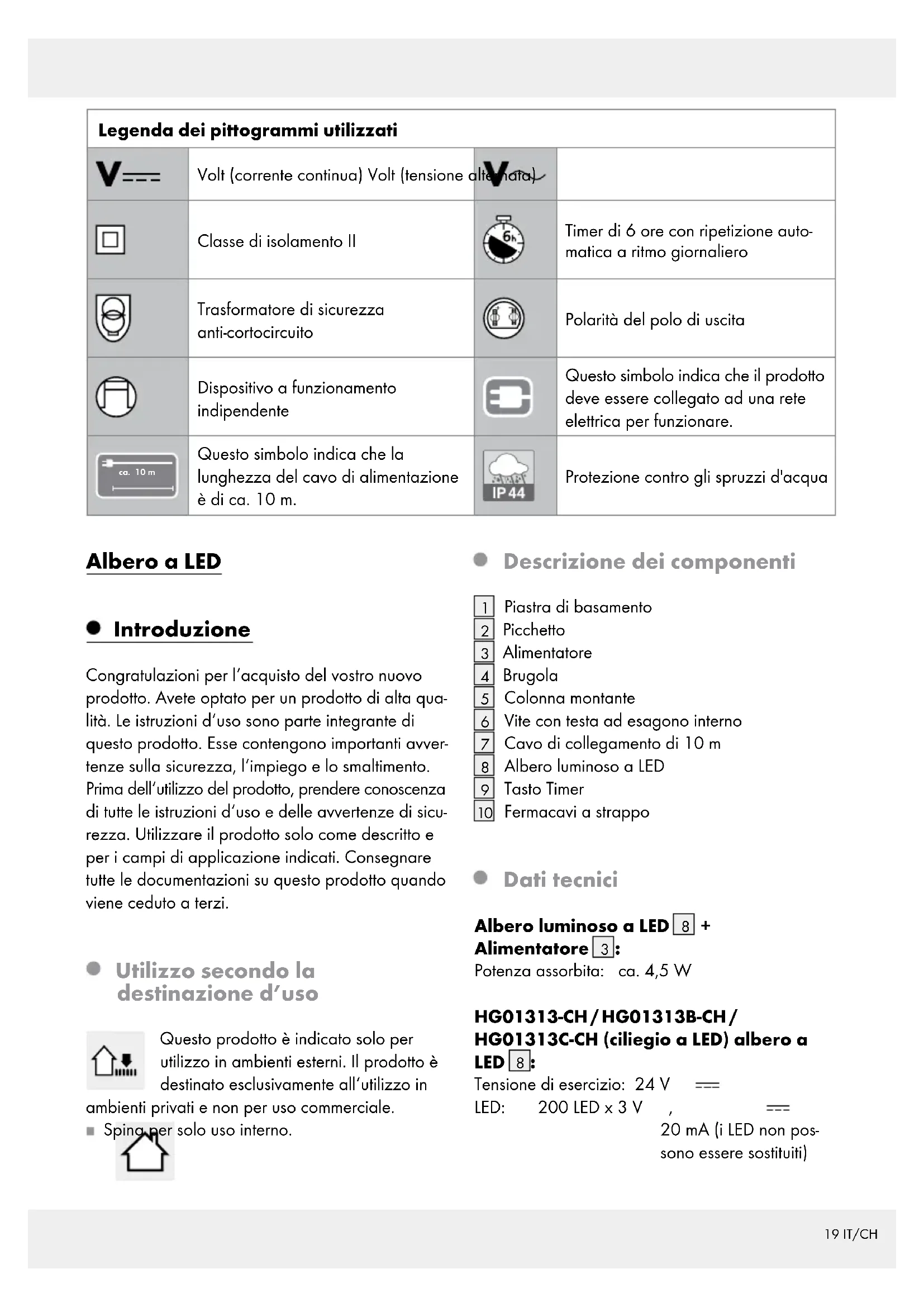 , 50‒60 Hz Tensione nominale secondaria: 31 V , 3,6 W Classe di protezione: Alimentatore (modello n° JT-DC31V3.6W-H1) Contenuto della confezione 1 albero luminoso a LED, incluso cavo di collega- mento da 10 m (HG01313-CH - bianco freddo) (HG01313B-CH /HG01313C-CH / HG04147-CH - bianco caldo) 1 colonna montante 1 piastra di basamento 1 picchetto 1 alimentatore 1 brugola 2 viti con testa ad esagono interno 5 fiori di ricambio (solo per HG01313-CH / HG01313B-CH /HG01313C-CH) 2 fermacavi a strappo 1 manuale di istruzioni per l‘uso Avvertenze in materia di sicurezza