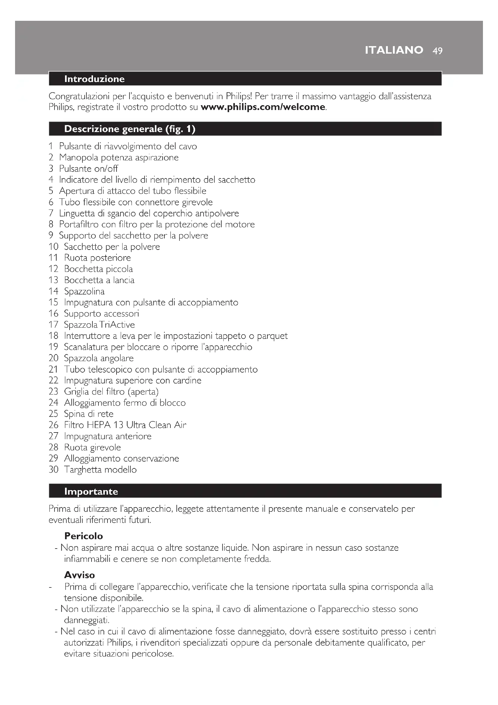 - Durante la pulizia, specialmente in stanze con una bassa umidità dell’aria, l’aspirapolvere genera elettricità statica. Di conseguenza, quando toccate il tubo o altre parti in acciaio dell’apparecchio, è possibile avvertire delle scariche elettriche. Queste ultime non sono dannose né per l’uomo, né per l’apparecchio. Per ovviare a questo inconveniente, vi consigliamo di: 1 scaricare a terra l’apparecchio appoggiando spesso il tubo su altri oggetti di metallo presenti nella stanza (ad esempio sulle gambe di un tavolo o di una sedia oppure contro un radiatore, ecc...); (g. 2) 2 aumentare il livello di umidità dell’aria nella stanza utilizzando dell’acqua. Potete, ad esempio, appendere contenitori o recipienti pieni d’acqua sui radiatori oppure nelle loro vicinanze (g. 3). Campi elettromagnetici (EMF) Questo apparecchio Philips è conforme a tutti gli standard relativi ai campi elettromagnetici (EMF). Se utilizzato in modo appropriato seguendo le istruzioni contenute nel presente manuale d’uso, l’apparecchio consente un utilizzo sicuro come confermato dai risultati scientici attualmente disponibili. Predisposizione dell’apparecchio Tubo essibile 1 Percollegareiltuboessibile,inseritelonell’apparecchionoafarloscattarein posizione(g.4). 2 Perdisinserirlopremeteipulsantietirateiltuboessibile(g.5). Tubo telescopico 1 Percollegareiltuboall’impugnatura,inseritequest’ultimaneltubostesso,quindifatescattare inposizioneilpulsantedibloccoamollanell’aperturadeltubo(g.6). - Per scollegare il tubo dall’impugnatura, premete il pulsante di blocco a molla ed estraete l’impugnatura dal tubo. 2 Regolateiltubosecondolalunghezzacheriteneteottimaleperlapulizia(g.7). Spazzola TriActive e accessori 1 PercollegarelaspazzolaTriActiveounaccessorioaltubo,premeteilpulsantedibloccoa mollapostosultubo(1)einseritequest’ultimonellabocchettaonell’accessorio(2).Inserite ilpulsantedibloccoamollanell’aperturadellabocchettaodell’accessorio.(g.8) ITALIANO50Nota: Seguendo la medesima procedura, potete anche collegare gli accessori direttamente all’impugnatura. 2 Per scollegare una bocchetta o un accessorio dal tubo, premete il pulsante di blocco a molla edestraetelabocchettaol’accessoriodaltubo. Spazzola TriActive La spazzola TriActive è una spazzola multifunzionale indicata per moquette e pavimenti duri. - Le setole laterali catturano una maggiore quantità di polvere e sporco ai lati della spazzola e consentono una pulizia accurata intorno ai mobili e negli angoli difcili da raggiungere (g. 9). - L’apertura della bocchetta consente di aspirare particelle di dimensioni maggiori (g. 10). 1 Perlapuliziadipavimentiduri,spingeteconilpiedel’interruttorealevapostoincimaalla bocchetta:(g.11) , verrannoestratteleappositesetoledall’alloggiamento.Contemporaneamente,laruotaverrà alzataperevitaredigrafarelasuperciesottostanteepermigliorarelamanovrabilità dell’apparecchio. 2 Perlapuliziadeitappeti,premetenuovamentel’interruttorealeva:(g.12) , lesetolerientrerannonell’alloggiamentoelaruotaverràabbassataautomaticamente. Accessori 1 Potetecollegarelabocchettaalancia(1),labocchettapiccola(2)olaspazzolapiccola(3)al tuboodirettamenteall’impugnaturadelessibile(g.13). - Utilizzate la bocchetta a lancia per pulire gli angoli e i punti difcili da raggiungere. - Utilizzate la bocchetta piccola per pulire aree di piccole dimensioni, come poltrone e divani. - Utilizzate la spazzolina per pulire computer, librerie, scaffali, ecc. Supporto accessori 1 Inseriteilsupportoaccessorisull’impugnaturae(g.14) 2 agganciate i due seguenti accessori al supporto: - Bocchetta a lancia e bocchetta piccola (g. 15). Nota: La bocchetta piccola va riposta nel supporto accessori come illustrato in gura. - Bocchetta a lancia e spazzolina (g. 16). Modalità d’uso dell’apparecchio 1 Estraeteilcavodialimentazionedall’apparecchioeinseritelaspinanellapresadicorrente. 2 Peraccenderel’apparecchio,premeteconilpiedeilpulsanteon/offsullapartesuperiore dell’apparecchio(g.17). Regolazione della forza aspirante Durante il funzionamento potete regolare la potenza di aspirazione. - Selezionate la potenza di aspirazione massima per pavimenti o moquette molto sporchi. - Selezionate la potenza di aspirazione minima per tende, tappeti, ecc. Manopola potenza aspirazione - Durante il funzionamento, potrete regolare la potenza di aspirazione usando la manopola posta sulla parte superiore dell’apparecchio (g. 18). Pausa durante l’utilizzo 1 Sedesideratefareunapausa,inseritelascanalaturadellabocchettanell’alloggiamentodi sospensioneperriporreiltubonelmodopiùconveniente(g.19). ITALIANO 51Conservazione 1 Fatescorrerelepartideltubol’unanell’altraperridurrealminimolalunghezzadeltubo. 2 Spegnetel’apparecchiodopol’usoerimuovetelaspinadallapresadicorrente. 3 Premeteilpulsantediriavvolgimentoperavvolgereilcavodialimentazione(g.20). 4 Perconservarel’apparecchioinposizioneverticale,inseritelascanalaturadellabocchetta nell’alloggiamentoconservazione(g.21). 5 Quandoriponetel’apparecchiomettetesemprelaspazzolaTriActivesull’impostazioneper tappeti(nastrodellaspazzolaritrattoall’internodellabocchetta)perevitarechelesetole lateralisipieghino(g.12). Sostituzione del sacchetto per la polvere Toglietesemprelaspinadallapresaprimadisostituireilsacchettoraccoglipolvere. Nota: In alcuni casi, l’indicatore del livello di riempimento del sacchetto può indicare che il sacchetto per la polvere è pieno, anche se non lo è. Questo può accadere se i fori del sacchetto sono ostruiti (ad es. nel caso in cui sia stata aspirata cenere, sabbia ne, calce, cemento in polvere e sostanze simili) o se qualcosa ostruisce la bocchetta, il tubo rigido e/o il tubo essibile. Se i fori del sacchetto per la polvere sono ostruiti, sostituite il sacchetto anche se non è completamente pieno. Se il sacchetto non è né ostruito né pieno, qualcosa ostruisce la bocchetta, il tubo rigido e/o il tubo essibile. In tal caso, non sostituite 