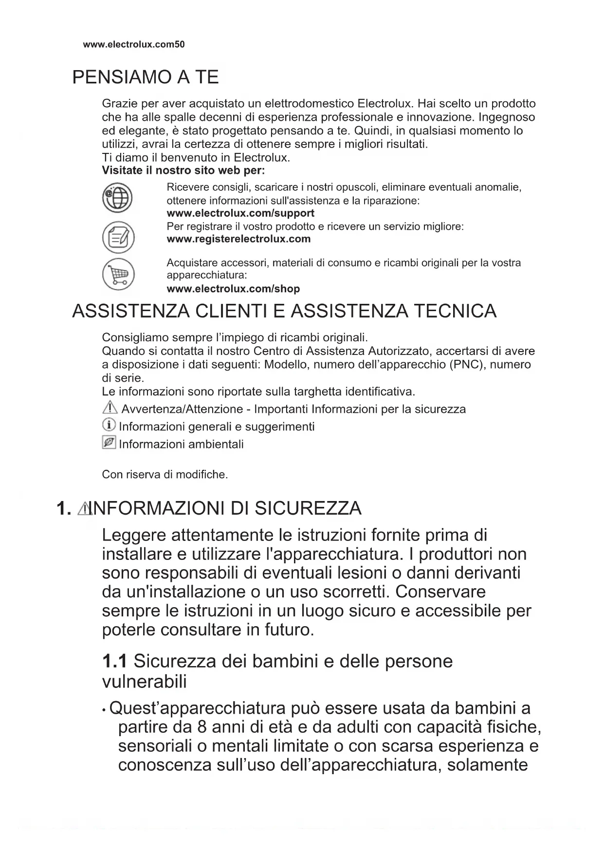 Grazie per aver acquistato un elettrodomestico Electrolux. Hai scelto un prodotto che ha alle spalle decenni di esperienza professionale e innovazione. Ingegnoso ed elegante, è stato progettato pensando a te. Quindi, in qualsiasi momento lo utilizzi, avrai la certezza di ottenere sempre i migliori risultati. Ti diamo il benvenuto in Electrolux. Visitate il nostro sito web per: Ricevere consigli, scaricare i nostri opuscoli, eliminare eventuali anomalie, ottenere informazioni sull'assistenza e la riparazione: www.electrolux.com/support Per registrare il vostro prodotto e ricevere un servizio migliore: www.registerelectrolux.com Acquistare accessori, materiali di consumo e ricambi originali per la vostra apparecchiatura: www.electrolux.com/shop