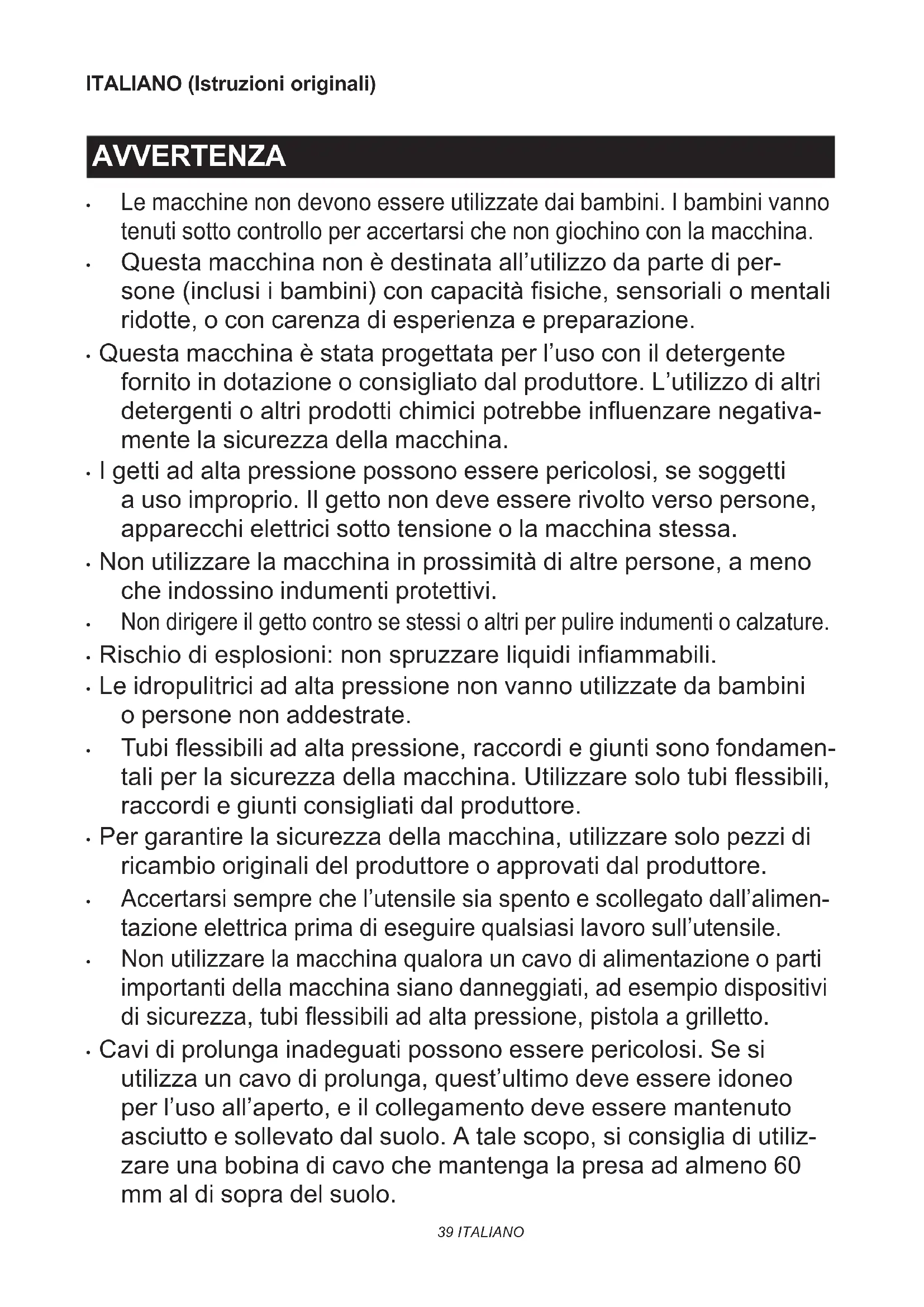- Le idropulitrici ad alta pressione non vanno utilizzate da bambini o persone non addestrate.