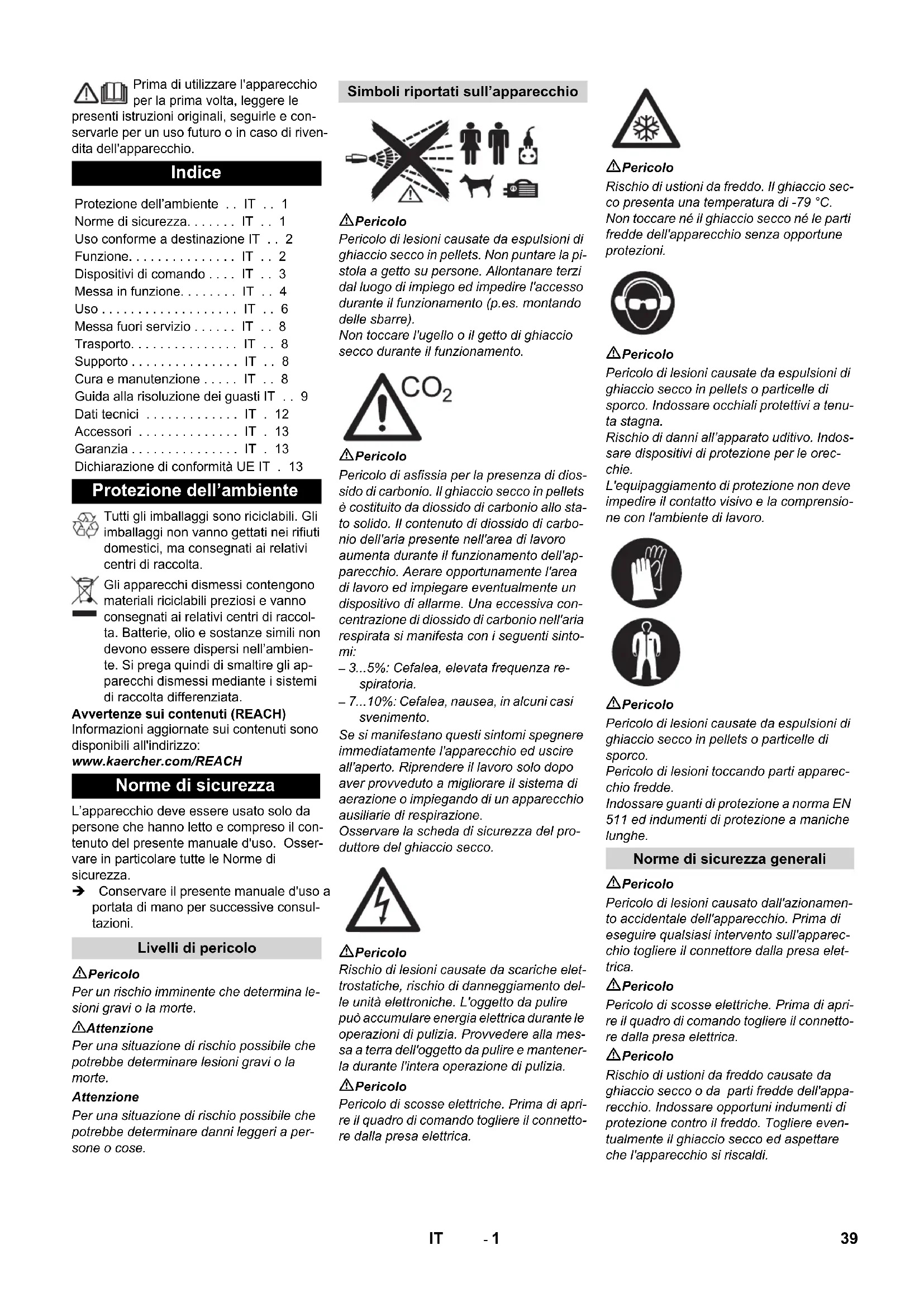 - %: Cefalea, elevata frequenza re- spiratoria. – 7 %: Cefalea, nausea, in alcuni casi svenimento. Se si manifestano questi sintomi spegnere immediatamente l'apparecchio ed uscire all'aperto. Riprendere il lavoro solo dopo aver provveduto a migliorare il sistema di aerazione o impiegando di un apparecchio ausiliarie di respirazione. Osservare la scheda di sicurezza del pro- duttore del ghiaccio secco. Pericolo Rischio di lesioni causate da scariche elet- trostatiche, rischio di danneggiamento del- le unità elettroniche. L'oggetto da pulire può accumulare energia elettrica durante le operazioni di pulizia. Provvedere alla mes- sa a terra dell'oggetto da pulire e mantener- la durante l'intera operazione di pulizia. Pericolo Pericolo di scosse elettriche. Prima di apri- re il quadro di comando togliere il connetto- re dalla presa elettrica. Pericolo Rischio di ustioni da freddo. Il ghiaccio sec- co presenta una temperatura di -79 °C. Non toccare né il ghiaccio secco né le parti fredde dell'apparecchio senza opportune protezioni. Pericolo Pericolo di lesioni causate da espulsioni di ghiaccio secco in pellets o particelle di sporco. Indossare occhiali protettivi a tenu- ta stagna. Rischio di danni all’apparato uditivo. Indos- sare dispositivi di protezione per le orec- chie. L'equipaggiamento di protezione non deve impedire il contatto visivo e la comprensio- ne con l'ambiente di lavoro. Pericolo Pericolo di lesioni causate da espulsioni di ghiaccio secco in pellets o particelle di sporco. Pericolo di lesioni toccando parti apparec- chio fredde. Indossare guanti di protezione a norma EN 511 ed indumenti di protezione a maniche lunghe. Pericolo Pericolo di lesioni causato dall'azionamen- to accidentale dell'apparecchio. Prima di eseguire qualsiasi intervento sull'apparec- chio togliere il connettore dalla presa elet- trica. Pericolo Pericolo di scosse elettriche. Prima di apri- re il quadro di comando togliere il connetto- re dalla presa elettrica. Pericolo Rischio di ustioni da freddo causate da ghiaccio secco o da parti fredde dell'appa- recchio. Indossare opportuni indumenti di protezione contro il freddo. Togliere even- tualmente il ghiaccio secco ed aspettare che l'apparecchio si riscaldi. Indice Protezione dell’ambiente p. 10