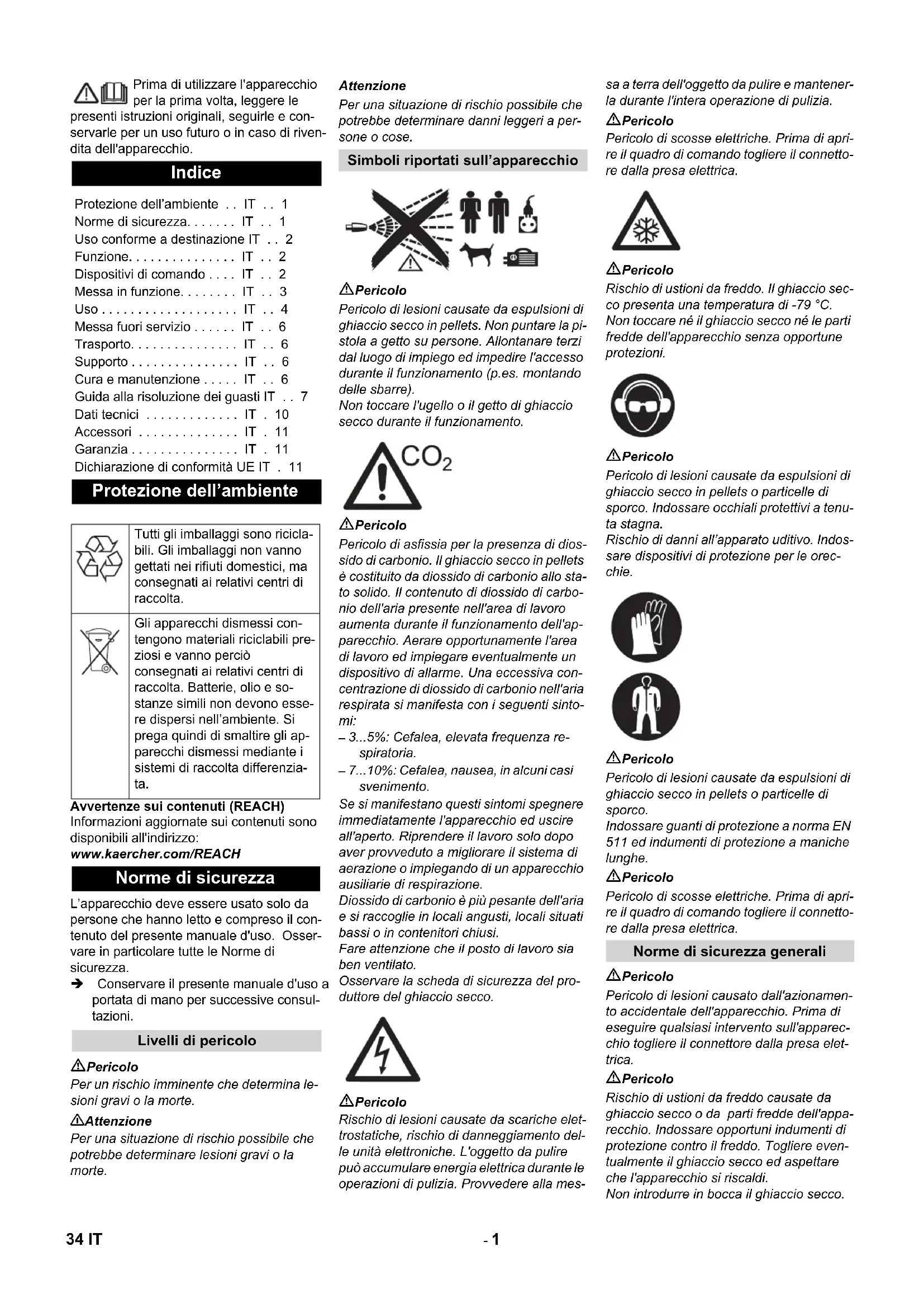 - sec et sans huile, au minimum un refroidisseur secondaire et un séparateur doivent être montés en aval du compresseur. Consommation en air comprimé Niveau de pression accoustique Niveau de puissance acoustique 32 FR- 11 Lunettes de protection complètes, anti- éclats, No de pièce : 6.321-208.0 Gants de protection contre le froid avec profil anti-dérapant, catégorie III selon EN 511, No de pièce : 6.321-210.0 Proection auditive avec arceau de tête, No de pièce : 6.321-207.0 Buse à jet rond, courte N° de pièce : 4.321-236.0 Buse à jet rond, longue N° de pièce : 4.321-234.0 Buse à jet plat, courte N° de pièce : 4.321-237.0 Buse à jet plat, longue, dans l'étendue de li- vraison N° de pièce : 4.321-235.0 Buse à jet rong, coudée N° de pièce : 4.321-249.0 Buse à jet plat, pliée N° de pièce : 4.321-250.0 Scrambler N° de pièce : 4.110-015.0 Prolongement de buse, 300 mm de long N° de pièce : 5.760-001.0 Poignée N° de pièce : 4.321-248.0 Eclairage N° de pièce : 2.815-421.0 Dans chaque pays, les conditions de ga- rantie en vigueur sont celles publiées par notre société de distribution responsable. Les éventuelles pannes sur l’appareil sont réparées gratuitement dans le délai de va- lidité de la garantie, dans la mesure où celles-ci relèvent d'un défaut matériel ou d'un vice de fabrication. En cas de recours en garantie, adressez-vous à votre reven- deur ou au service après-vente agréé le plus proche munis de votre preuve d'achat. Nous certifions par la présente que la ma- chine spécifiée ci-après répond de par sa conception et son type de construction ain- si que de par la version que nous avons mise sur le marché aux prescriptions fon- damentales stipulées en matière de sécuri- té et d’hygiène par les directives européennes en vigueur. Toute modifica- tion apportée à la machine sans notre ac- cord rend cette déclaration invalide. Les signataires agissent sous ordre et avec le pouvoir de la direction. Responsable de la documentation : S. Reiser Alfred Kärcher SE & Co. KG Alfred-Kärcher-Straße 28-40 71364 Winnenden (Germany) Tel.: +49 7195 14-0 Fax: +49 7195 14-2212 Winnenden, 2021/02/01 Accessoires Vêtements de protection Dispositif de jet Garantie Déclaration UE de conformité Produit : Nettoyeur à jet à glace sèche Type : 1.574-xxx Directives européennes en vigueur : 2011/65/EU 2006/42/CE (+2009/127/CE) 2014/30/UE 2009/125/EG + 2009/1781 Normes harmonisées appliquées : EN 55014–1: 2017 + A11: 2020 EN 55014–2: 2015 EN 60204–1 EN 61000–3–2: 2014 EN 61000–3–3: 2013 EN IEC 63000: 2018 EN 62233: 2008 Normes nationales appliquées : GS-STE-13 (en référence) Chairman of the Board of Management Director Regulatory Affairs & Certification 33FR- 1 Prima di utilizzare l'apparecchio per la prima volta, leggere le presenti istruzioni originali, seguirle e con- servarle per un uso futuro o in caso di riven- dita dell'apparecchio. Avvertenze sui contenuti (REACH) Informazioni aggiornate sui contenuti sono disponibili all'indirizzo: www.kaercher.com/REACH L’apparecchio deve essere usato solo da persone che hanno letto e compreso il con- tenuto del presente manuale d'uso. Osser- vare in particolare tutte le Norme di sicurezza. Conservare il presente manuale d'uso a portata di mano per successive consul- tazioni. Pericolo Per un rischio imminente che determina le- sioni gravi o la morte. 몇 Attenzione Per una situazione di rischio possibile che potrebbe determinare lesioni gravi o la morte. Attenzione Per una situazione di rischio possibile che potrebbe determinare danni leggeri a per- sone o cose. Pericolo Pericolo di lesioni causate da espulsioni di ghiaccio secco in pellets. Non puntare la pi- stola a getto su persone. Allontanare terzi dal luogo di impiego ed impedire l'accesso durante il funzionamento (p.es. montando delle sbarre). Non toccare l'ugello o il getto di ghiaccio secco durante il funzionamento. Pericolo Pericolo di asfissia per la presenza di dios- sido di carbonio. Il ghiaccio secco in pellets è costituito da diossido di carbonio allo sta- to solido. Il contenuto di diossido di carbo- nio dell'aria presente nell'area di lavoro aumenta durante il funzionamento dell'ap- parecchio. Aerare opportunamente l'area di lavoro ed impiegare eventualmente un dispositivo di allarme. Una eccessiva con- centrazione di diossido di carbonio nell'aria respirata si manifesta con i seguenti sinto- mi: – 3...5%: Cefalea, elevata frequenza re- spiratoria. – 7...10%: Cefalea, nausea, in alcuni casi svenimento. Se si manifestano questi sintomi spegnere immediatamente l'apparecchio ed uscire all'aperto. Riprendere il lavoro solo dopo aver provveduto a migliorare il sistema di aerazione o impiegando di un apparecchio ausiliarie di respirazione. Diossido di carbonio è più pesante dell'aria e si raccoglie in locali angusti, locali situati bassi o in contenitori chiusi. Fare attenzione che il posto di lavoro sia ben ventilato. Osservare la scheda di sicurezza del pro- duttore del ghiaccio secco. Pericolo Rischio di lesioni causate da scariche elet- trostatiche, rischio di danneggiamento del- le unità elettroniche. L'oggetto da pulire può accumulare energia elettrica durante le operazioni di pulizia. Provvedere alla mes- sa a terra dell'oggetto da pulire e mantener- la durante l'intera operazione di pulizia. Pericolo Pericolo di scosse elettriche. Prima di apri- re il quadro di comando togliere il connetto- re dalla presa elettrica. Pericolo Rischio di ustioni da freddo. Il ghiaccio sec- co presenta una temperatura di -79 °C. Non toccare né il ghiaccio secco né le parti fredde dell'apparecchio senza opportune protezioni. Pericolo Pericolo di lesioni causate da espulsioni di ghiaccio secco in pellets o particelle di sporco. Indossare occhiali protettivi a tenu- ta stagna. Rischio di danni all’apparato uditivo. Indos- sare dispositivi di protezione per le orec- chie. Pericolo Pericolo di lesioni causate da es
