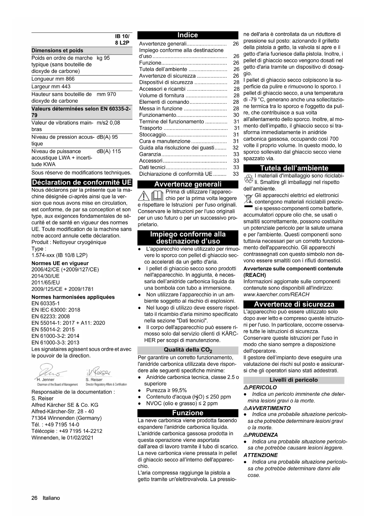 O) ≤ 250 ppm ● NVOC (olio e grasso) ≤ 2 ppm Funzione La neve carbonica viene prodotta facendo espandere l'anidride carbonica liquida. L'anidride carbonica gassosa prodotta in questa operazione viene asportata dall’area di lavoro tramite il tubo di scarico. La neve carbonica viene pressata in pellet di ghiaccio secco all’interno dell'apparec- chio. L'aria compressa raggiunge la pistola a getto tramite un'elettrovalvola. La pressio- ne dell'aria è controllata da un riduttore di pressione sul posto: azionando il grilletto della pistola a getto, la valvola si apre e il getto d'aria fuoriesce dalla pistola. Inoltre, i pellet di ghiaccio secco vengono dosati nel getto d'aria tramite un dispositivo di dosag- gio. I pellet di ghiaccio secco colpiscono la su- perficie da pulire e rimuovono lo sporco. I pellet di ghiaccio secco, a una temperatura di -79 °C, generano anche una sollecitazio- ne termica tra lo sporco e l'oggetto da puli- re, che contribuisce a sua volta all'allentamento dello sporco. Inoltre, al mo- mento dell’impatto, il ghiaccio secco si tra- sforma immediatamente in anidride carbonica gassosa, occupando così 700 volte il proprio volume. In questo modo, lo sporco sollevato dal ghiaccio secco viene spazzato via. Tutela dell’ambiente I materiali d'imballaggio sono riciclabi- li. Smaltire gli imballaggi nel rispetto dell’ambiente. Gli apparecchi elettrici ed elettronici contengono materiali riciclabili prezio- si e spesso componenti come batterie, accumulatori oppure olio che, se usati o smaltiti scorrettamente, possono costituire un potenziale pericolo per la salute umana e per l'ambiente. Questi componenti sono tuttavia necessari per un corretto funziona- mento dell'apparecchio. Gli apparecchi contrassegnati con questo simbolo non de- vono essere smaltiti con i rifiuti domestici. Avvertenze sulle componenti contenute (REACH) Informazioni aggiornate sulle componenti contenute sono disponibili all'indirizzo: www.kaercher.com/REACH Avvertenze di sicurezza L'apparecchio può essere utilizzato solo dopo aver letto e compreso queste istruzio- ni per l'uso. In particolare, occorre osserva- re tutte le istruzioni di sicurezza. Conservare queste istruzioni per l'uso in modo che siano sempre a disposizione dell'operatore. Il gestore dell’impianto deve eseguire una valutazione dei rischi sul posto e assicurar- si che gli operatori siano stati addestrati. Livelli di pericolo PERICOLO ● Indica un pericolo imminente che deter- mina lesioni gravi o la morte. 몇 AVVERTIMENTO ● Indica una probabile situazione pericolo- sa che potrebbe determinare lesioni gravi o la morte. 몇 PRUDENZA ● Indica una probabile situazione pericolo- sa che potrebbe causare lesioni leggere. ATTENZIONE ● Indica una probabile situazione pericolo- sa che potrebbe determinare danni alle cose. Dimensions et poids Poids en ordre de marche typique (sans bouteille de dioxyde de carbone) kg 95 Longueur mm 866 Largeur mm 443 Hauteur sans bouteille de dioxyde de carbone mm 970 Valeurs déterminées selon EN 60335-2-