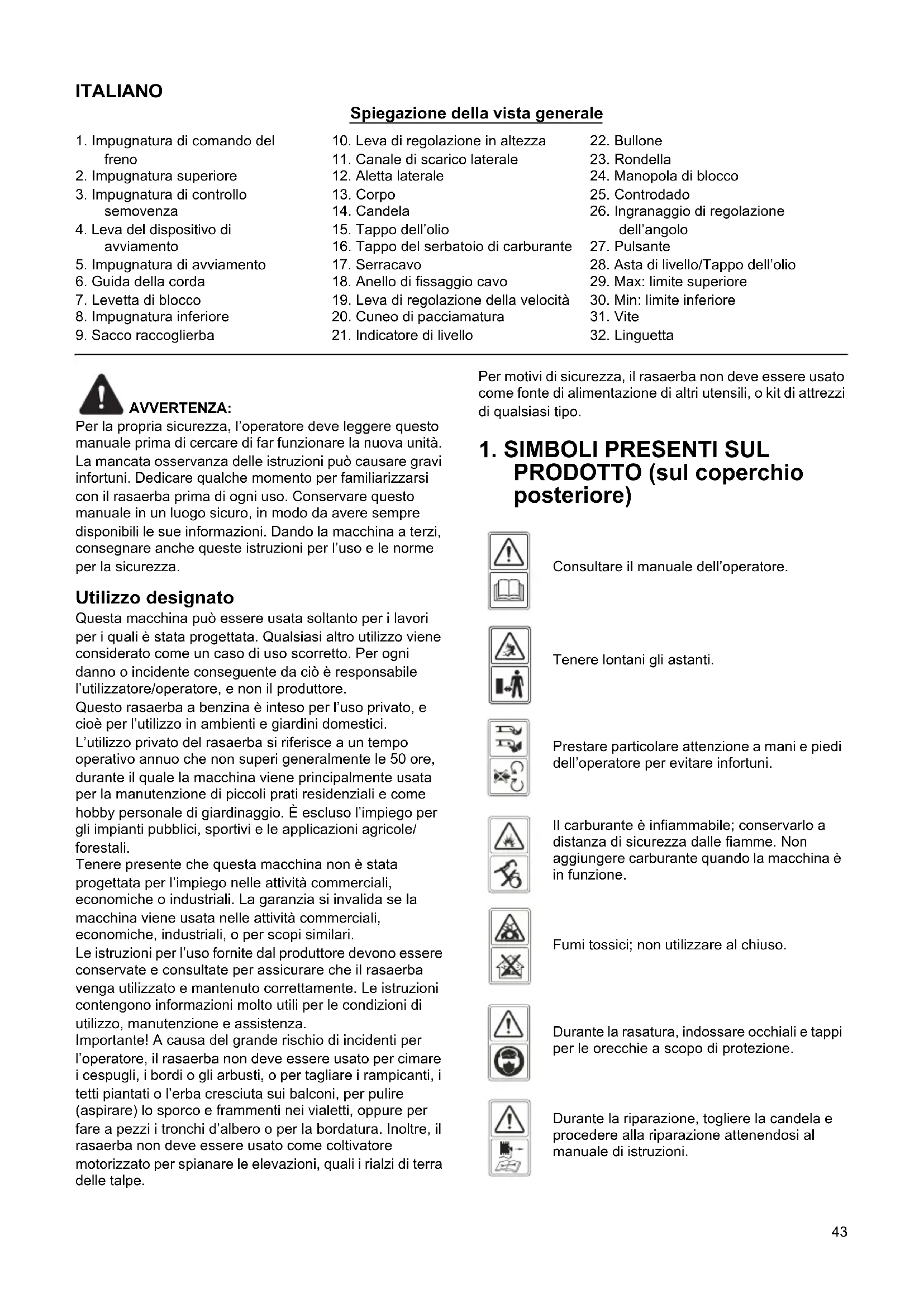 Nur für europäische Länder Die EG-Konformitätserklärung ist als Anhang A in dieser Bedienungsanleitung enthalten.43 ITALIANO Spiegazione della vista generale AVVERTENZA: Per la propria sicurezza, l’operatore deve leggere questo manuale prima di cercare di far funzionare la nuova unità. La mancata osservanza delle istruzioni può causare gravi infortuni. Dedicare qualche momento per familiarizzarsi con il rasaerba prima di ogni uso. Conservare questo manuale in un luogo sicuro, in modo da avere sempre disponibili le sue informazioni. Dando la macchina a terzi, consegnare anche queste istruzioni per l’uso e le norme per la sicurezza. Utilizzo designato Questa macchina può essere usata soltanto per i lavori per i quali è stata progettata. Qualsiasi altro utilizzo viene considerato come un caso di uso scorretto. Per ogni danno o incidente conseguente da ciò è responsabile l’utilizzatore/operatore, e non il produttore. Questo rasaerba a benzina è inteso per l’uso privato, e cioè per l’utilizzo in ambienti e giardini domestici. L’utilizzo privato del rasaerba si riferisce a un tempo operativo annuo che non superi generalmente le 50 ore, durante il quale la macchina viene principalmente usata per la manutenzione di piccoli prati residenziali e come hobby personale di giardinaggio. È escluso l’impiego per gli impianti pubblici, sportivi e le applicazioni agricole/ forestali. Tenere presente che questa macchina non è stata progettata per l’impiego nelle attività commerciali, economiche o industriali. La garanzia si invalida se la macchina viene usata nelle attività commerciali, economiche, industriali, o per scopi similari. Le istruzioni per l’uso fornite dal produttore devono essere conservate e consultate per assicurare che il rasaerba venga utilizzato e mantenuto correttamente. Le istruzioni contengono informazioni molto utili per le condizioni di utilizzo, manutenzione e assistenza. Importante! A causa del grande rischio di incidenti per l’operatore, il rasaerba non deve essere usato per cimare i cespugli, i bordi o gli arbusti, o per tagliare i rampicanti, i tetti piantati o l’erba cresciuta sui balconi, per pulire (aspirare) lo sporco e frammenti nei vialetti, oppure per fare a pezzi i tronchi d’albero o per la bordatura. Inoltre, il rasaerba non deve essere usato come coltivatore motorizzato per spianare le elevazioni, quali i rialzi di terra delle talpe. Per motivi di sicurezza, il rasaerba non deve essere usato come fonte di alimentazione di altri utensili, o kit di attrezzi di qualsiasi tipo.