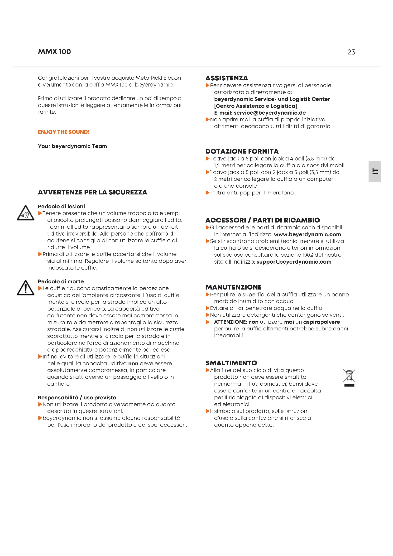 Congratulazioni per il voro acquio Meta Pick! E buon diveimento con la cuia MMX 100 di beyerdynamic. Prima di utilizzare il prodotto dedicare un po’ di tempo a quee iruzioni e leggere attentamente le informazioni fornite.