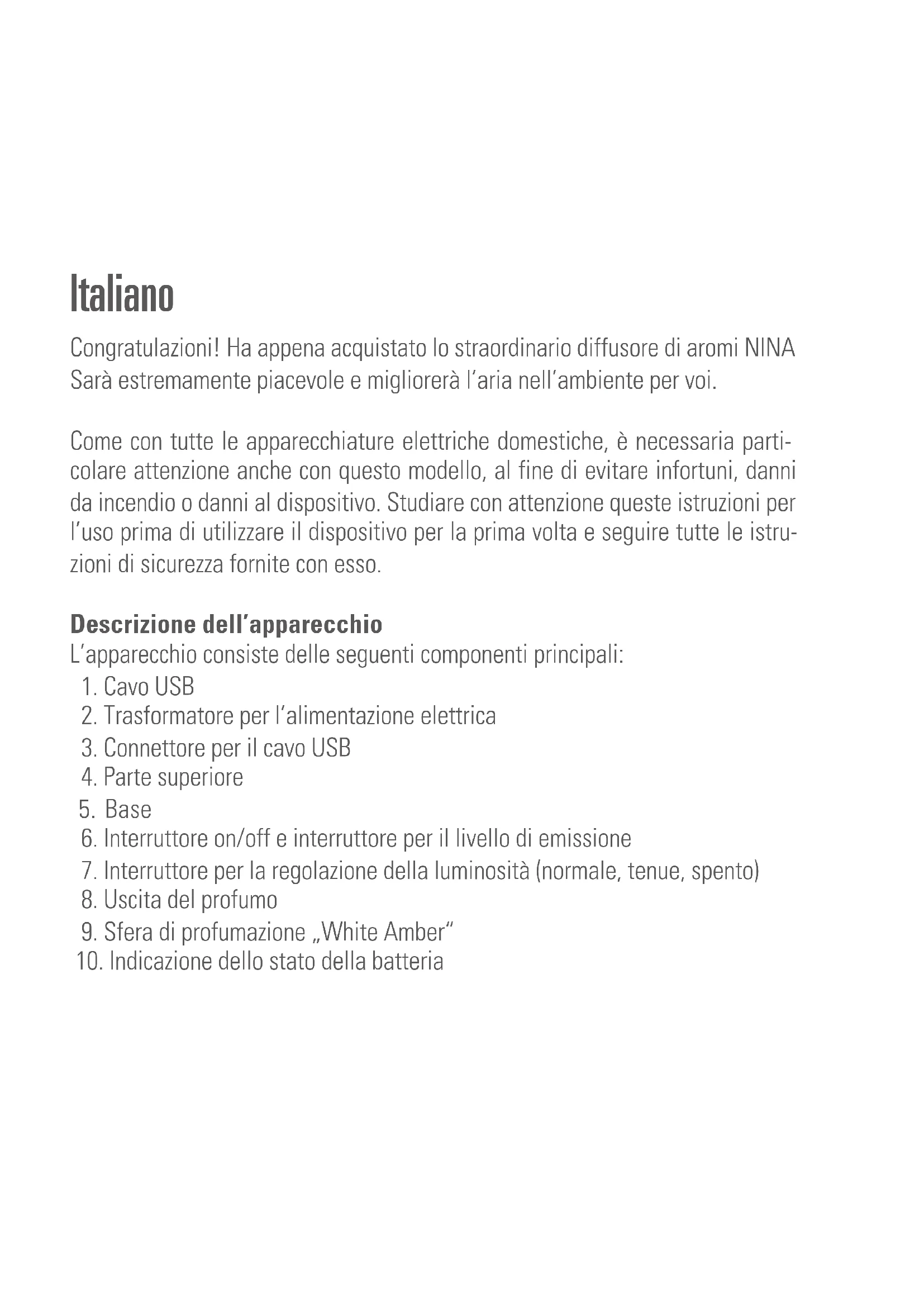 - Se l’apparecchio è irreparabile, rendetelo inutilizzabile immediatamente e consegnatelo al punto di raccolta appropriato. Smaltimento La Direttiva Europea 2012 / 19 / CE sullo Smaltimento dei rifiuti elettrici ed elettronici (WEEE) prevede che i dispositivi elettrici domestici usati non devono essere smaltiti nelle discariche municipali di rifiuti indifferenziati. I dispositivi usati devono essere raccolti separatamente in modo da ottimizzare il recupero e il riciclaggio dei materiali in essi contenuti e ridurre l’impatto sulla salute e sull’ambiente. Il simbolo del “cestino con ruote” barrato sul prodotto ricorda l’obbligo di smaltire il dispositivo mediante raccolta differenziata. I consumatori devono contattare le autorità locali o il rivenditore per informazioni relative al corretto smaltimento di dispositivi usati. La sfera per la profumazione è realizzata in plastica senza cloro e può essere smaltita con i rifiuti domestici. Smaltimento batteria: non gettare nei rifiuti; l’elettrodo è avvolto in carta isolante, può essere riciclato e riutilizzato.Specifiche Voltaggio 100–240 V / 50/60 Hz Potenza in uscita 3.5 W Tempo di funzionamento fino a 50 h Dimensioni 100 x 160 mm (diametro x altezza) Peso 360 g Rumorosità < 26 dB(A) Intervallo di temperatura del caricamento della batteria 0–45 °C Modello batteria PN103040 Conforme con i regolamenti UE CE / RoHS / EAC Tutti i diritti relativi a qualsiasi modifica tecnica sono riservatiEspañol ¡Enhorabuena! Ha adquirido el extraordinario difusor de aromas NINA. Quedará encantado con sus beneficios y mejorará la calidad del aire ambiente. Como con todos los aparatos electrodomésticos también este aparato exige un especial cuidado para evitar heridas, daños causados por incendios o daños en el aparato. Le rogamos por lo tanto que lea detenidamente el presente manual de instrucciones antes de proceder a su puesta en marcha y preste atención a las advertencias de seguridad indicadas en el aparato. Descripción del aparato El aparato tiene los siguientes componentes principales: