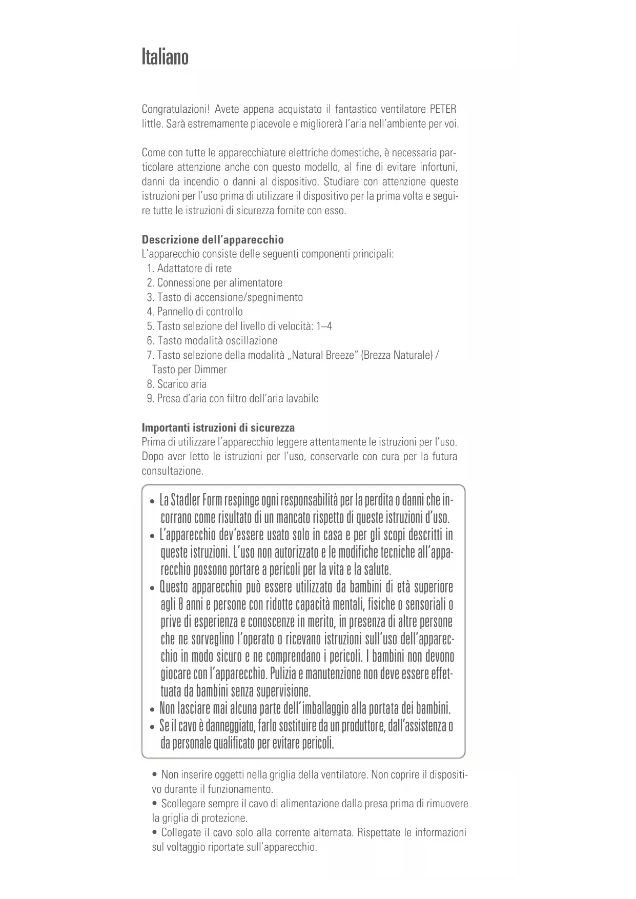 Scarica le istruzioni per il tuo Ventilatore in formato PDF gratuitamente! Trova il tuo manuale Peter little - STADLER FORM e riprendi in mano il tuo dispositivo elettronico. In questa pagina sono pubblicati tutti i documenti necessari per l'utilizzo del tuo dispositivo. Peter little del marchio STADLER FORM.
