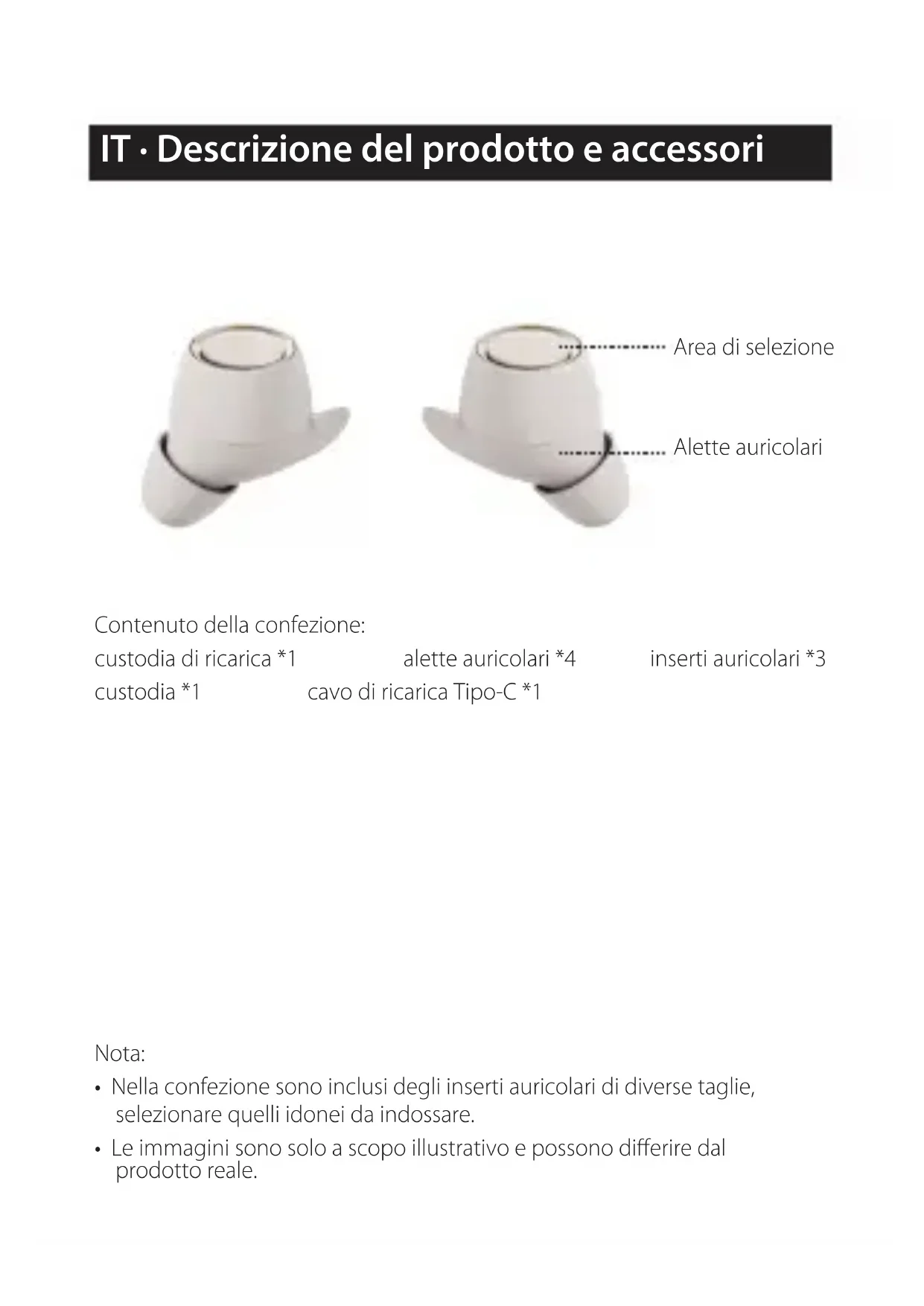 Le immagini sono solo a scopo illustrativo e possono dierire dal prodotto reale.■ Manuale Utente Premere: Indicatore batteria ● Caricare gli auricolari