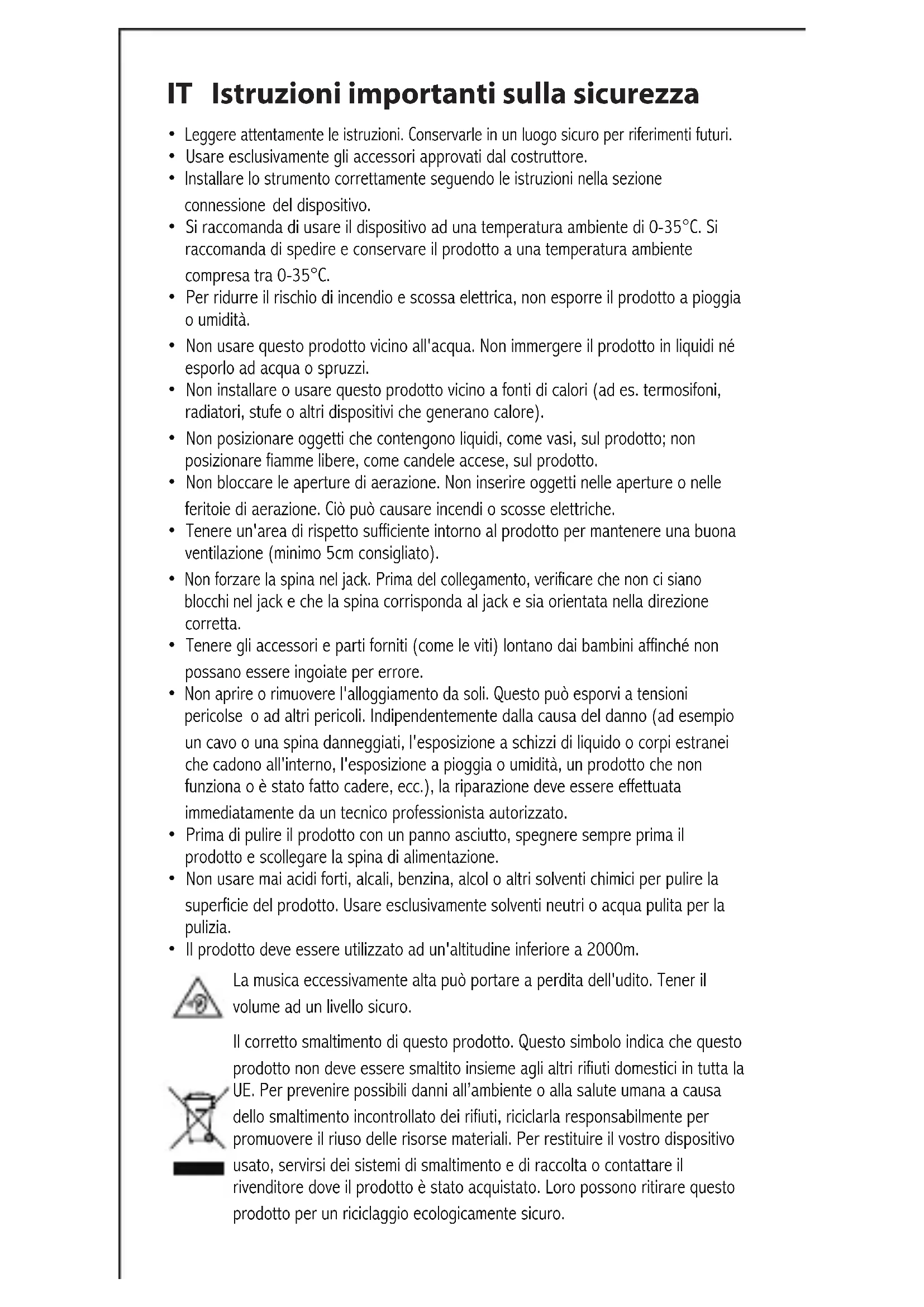 - Il prodotto deve essere utilizzato ad un'altitudine inferiore a 2000m. La musica eccessivamente alta può portare a perdita dell'udito. Tener il volume ad un livello sicuro. Il corretto smaltimento di questo prodotto. Questo simbolo indica che questo prodotto non deve essere smaltito insieme agli altri rifiuti domestici in tutta la UE. Per prevenire possibili danni all’ambiente o alla salute umana a causa dello smaltimento incontrollato dei rifiuti, riciclarla responsabilmente per promuovere il riuso delle risorse materiali. Per restituire il vostro dispositivo usato, servirsi dei sistemi di smaltimento e di raccolta o contattare il rivenditore dove il prodotto è stato acquistato. Loro possono ritirare questo prodotto per un riciclaggio ecologicamente sicuro.■ Contenuto della confezione Prodotti wireless: