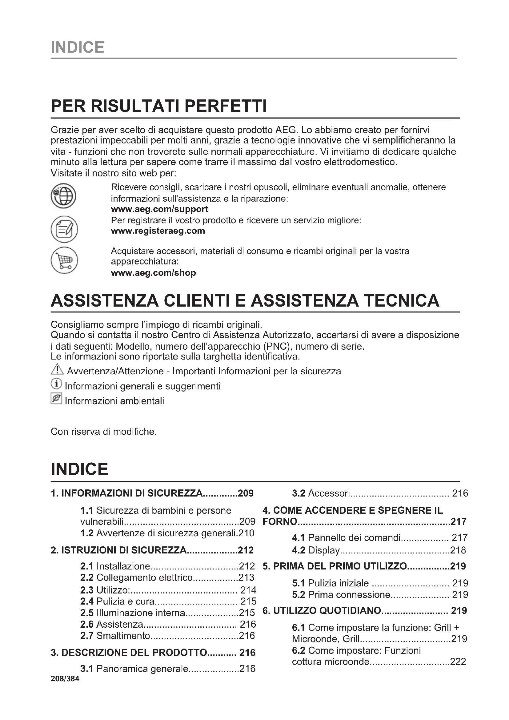 Consigliamo sempre l’impiego di ricambi originali. Quando si contatta il nostro Centro di Assistenza Autorizzato, accertarsi di avere a disposizione i dati seguenti: Modello, numero dell’apparecchio (PNC), numero di serie. Le informazioni sono riportate sulla targhetta identificativa. Avvertenza/Attenzione - Importanti Informazioni per la sicurezza Informazioni generali e suggerimenti Informazioni ambientali Con riserva di modifiche. INDICE