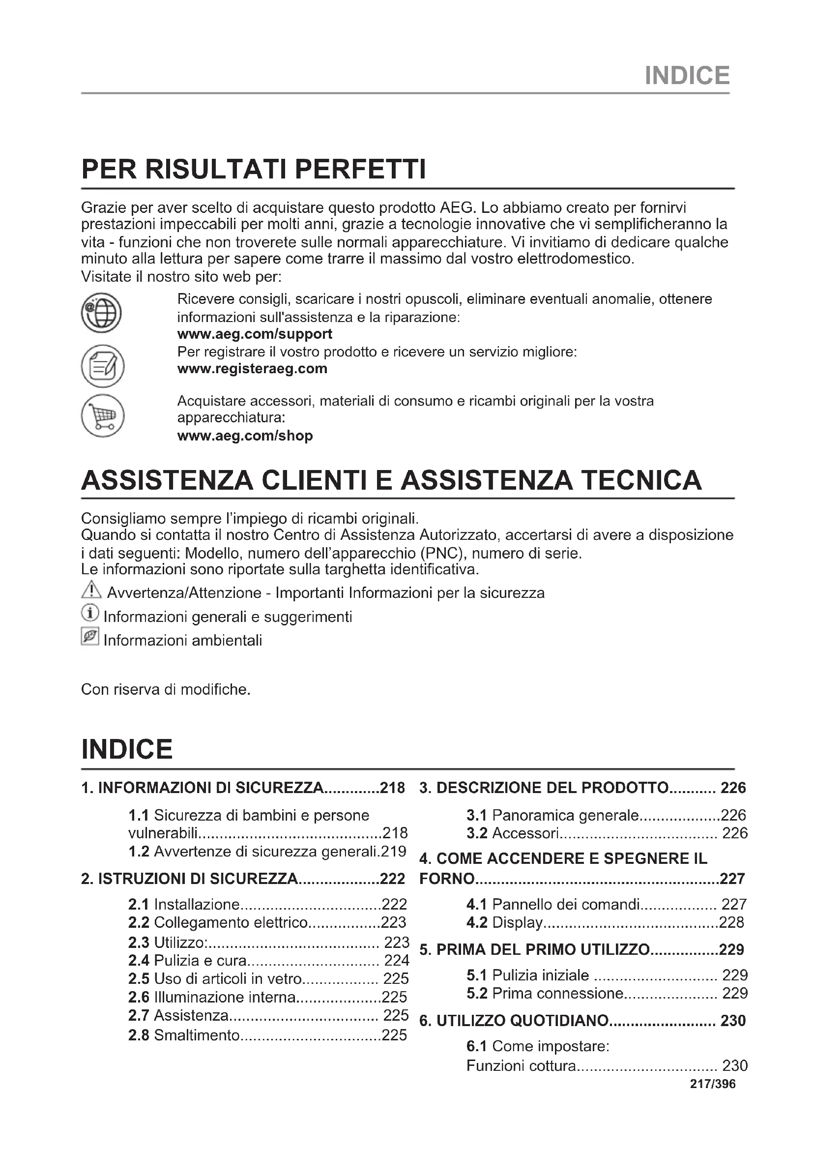 Consigliamo sempre l’impiego di ricambi originali. Quando si contatta il nostro Centro di Assistenza Autorizzato, accertarsi di avere a disposizione i dati seguenti: Modello, numero dell’apparecchio (PNC), numero di serie. Le informazioni sono riportate sulla targhetta identificativa. Avvertenza/Attenzione - Importanti Informazioni per la sicurezza Informazioni generali e suggerimenti Informazioni ambientali Con riserva di modifiche. INDICE