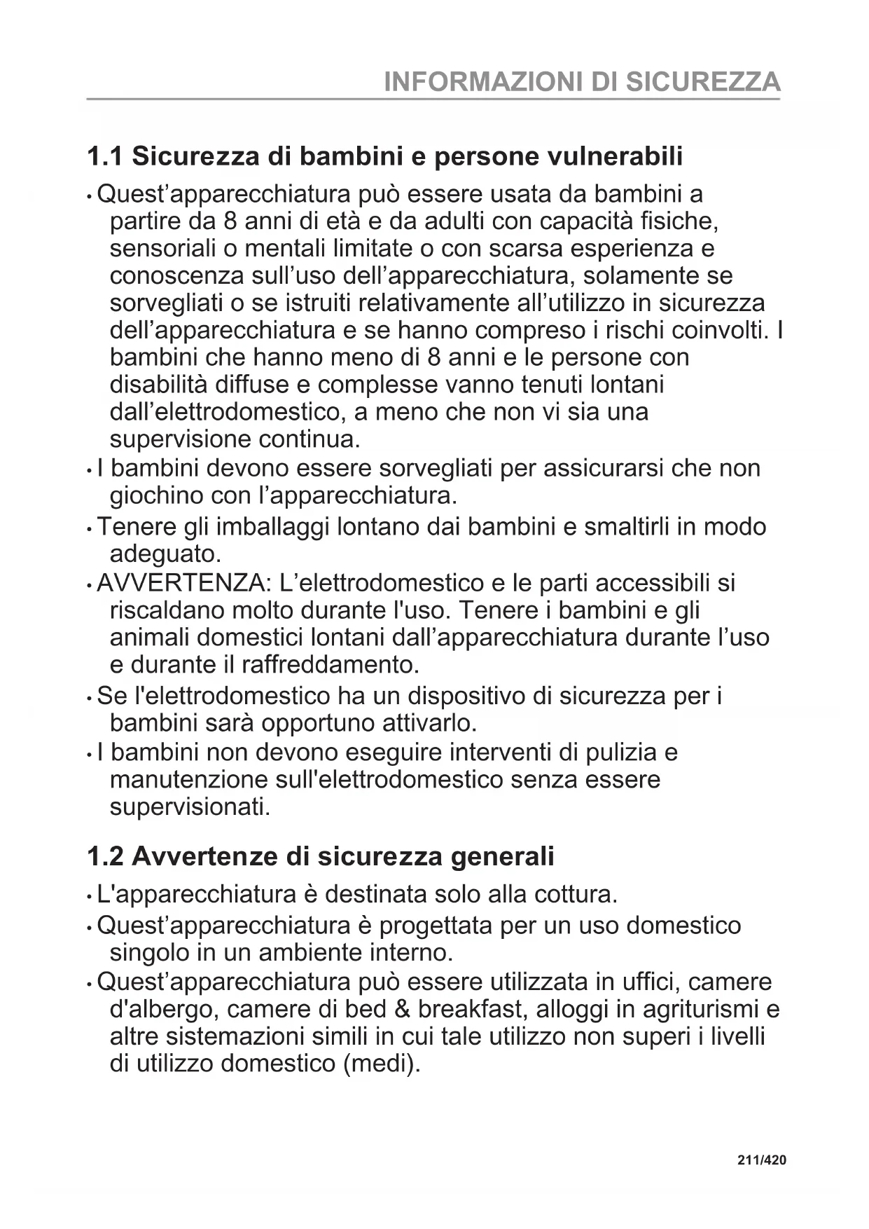 Leggere attentamente le istruzioni fornite prima di installare e utilizzare l'apparecchiatura. I produttori non sono responsabili di eventuali lesioni o danni derivanti da un'installazione o un uso scorretti. Conservare sempre le istruzioni in un luogo sicuro e accessibile per poterle consultare in futuro. 210/420 INFORMAZIONI DI SICUREZZA1.1 Sicurezza di bambini e persone vulnerabili