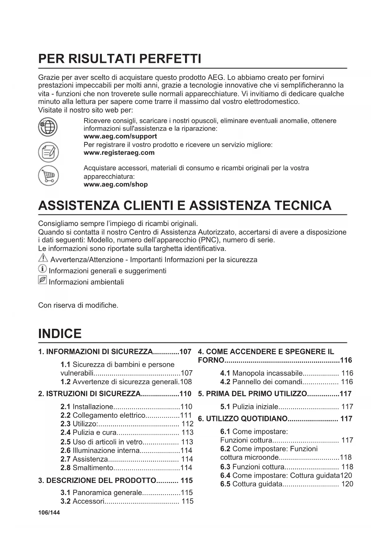 Consigliamo sempre l’impiego di ricambi originali. Quando si contatta il nostro Centro di Assistenza Autorizzato, accertarsi di avere a disposizione i dati seguenti: Modello, numero dell’apparecchio (PNC), numero di serie. Le informazioni sono riportate sulla targhetta identificativa. Avvertenza/Attenzione - Importanti Informazioni per la sicurezza Informazioni generali e suggerimenti Informazioni ambientali Con riserva di modifiche. INDICE