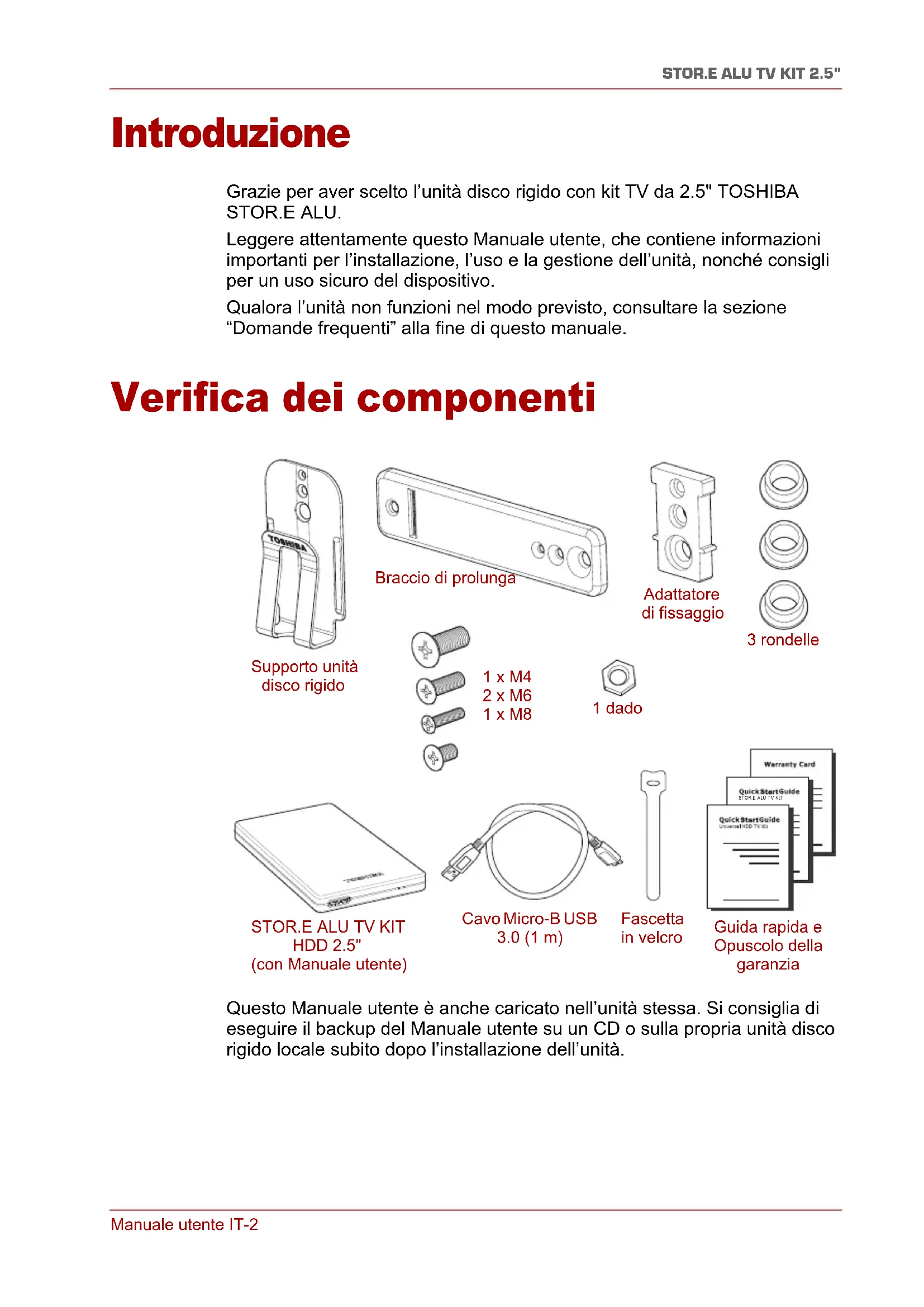 Introduzione Grazie per aver scelto l’unità disco rigido con kit TV da 2.5" TOSHIBA STOR.E ALU. Leggere attentamente questo Manuale utente, che contiene informazioni importanti per l’installazione, l’uso e la gestione dell’unità, nonché consigli per un uso sicuro del dispositivo. Qualora l’unità non funzioni nel modo previsto, consultare la sezione “Domande frequenti” alla fine di questo manuale. Verifica dei componenti Questo Manuale utente è anche caricato nell’unità stessa. Si consiglia di eseguire il backup del Manuale utente su un CD o sulla propria unità disco rigido locale subito dopo l’installazione dell’unità.