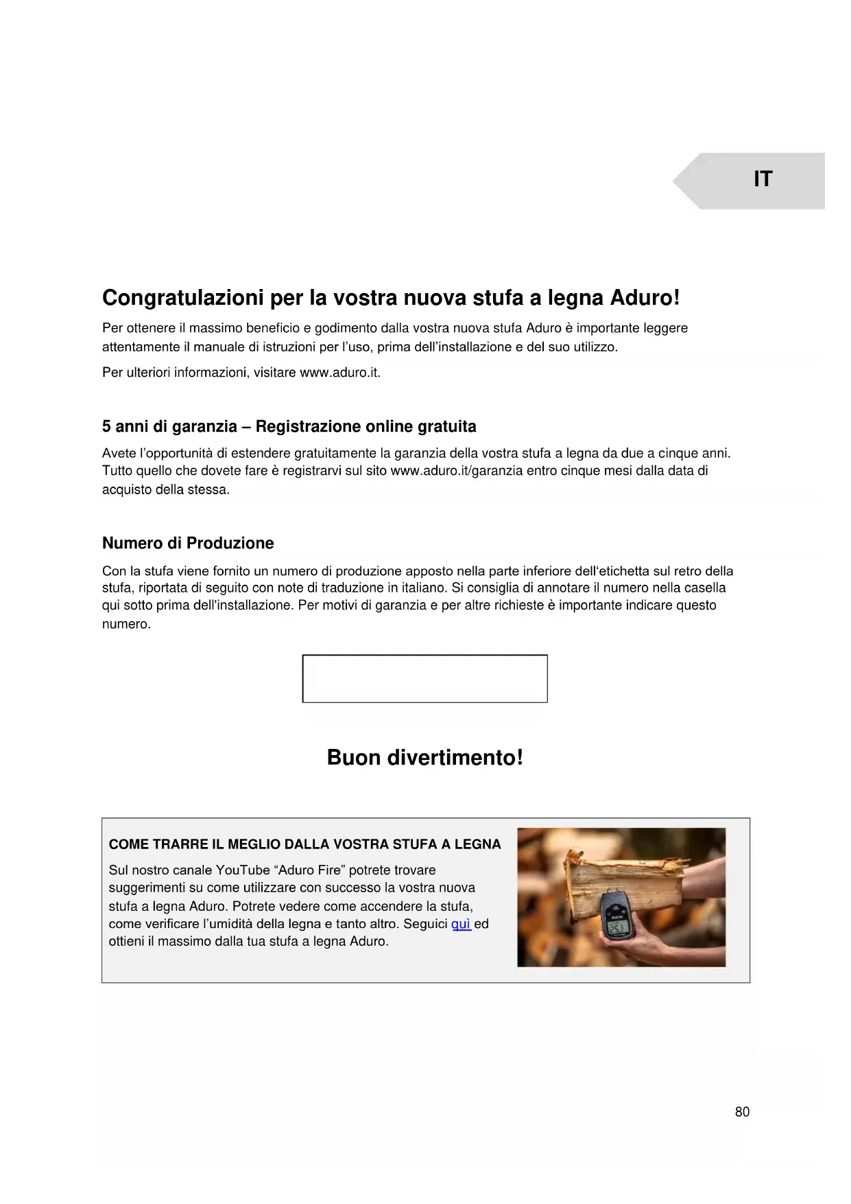 Congratulazioni per la vostra nuova stufa a legna Aduro! Per ottenere il massimo beneficio e godimento dalla vostra nuova stufa Aduro è importante leggere attentamente il manuale di istruzioni per l’uso, prima dell’installazione e del suo utilizzo. Per ulteriori informazioni, visitare www.aduro.it. 5 anni di garanzia – Registrazione online gratuita Avete l’opportunità di estendere gratuitamente la garanzia della vostra stufa a legna da due a cinque anni. Tutto quello che dovete fare è registrarvi sul sito www.aduro.it/garanzia entro cinque mesi dalla data di acquisto della stessa. Numero di Produzione Con la stufa viene fornito un numero di produzione apposto nella parte inferiore dell‘etichetta sul retro della stufa, riportata di seguito con note di traduzione in italiano. Si consiglia di annotare il numero nella casella qui sotto prima dell'installazione. Per motivi di garanzia e per altre richieste è importante indicare questo numero.
