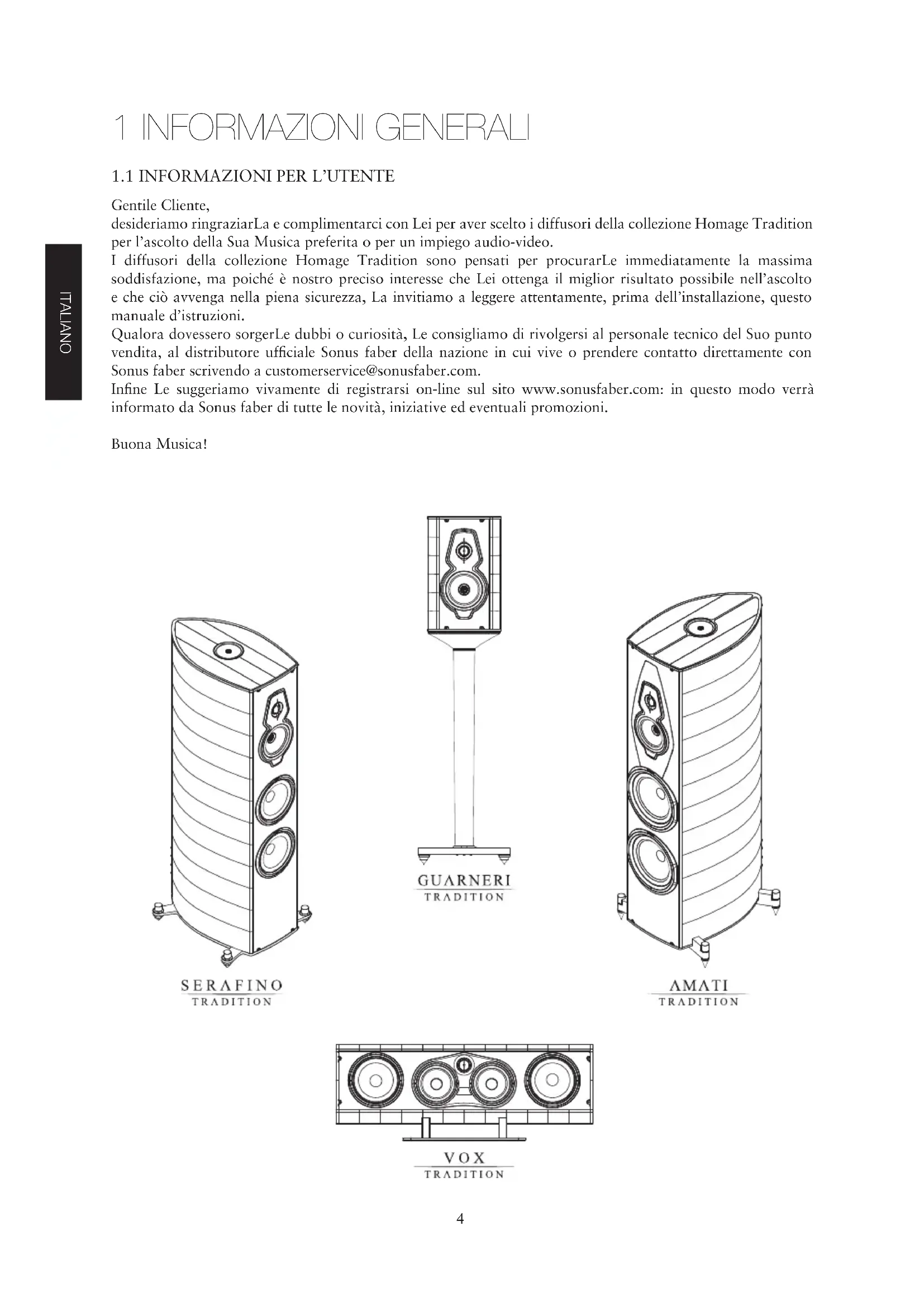 1 INFORMAZIONI GENERALI Gentile Cliente, desideriamo ringraziarLa e complimentarci con Lei per aver scelto i diffusori della collezione Homage Tradition per l’ascolto della Sua Musica preferita o per un impiego audio-video. I diffusori della collezione Homage Tradition sono pensati per procurarLe immediatamente la massima soddisfazione, ma poiché è nostro preciso interesse che Lei ottenga il miglior risultato possibile nell’ascolto e che ciò avvenga nella piena sicurezza, La invitiamo a leggere attentamente, prima dell’installazione, questo manuale d’istruzioni. Qualora dovessero sorgerLe dubbi o curiosità, Le consigliamo di rivolgersi al personale tecnico del Suo punto vendita, al distributore ufficiale Sonus faber della nazione in cui vive o prendere contatto direttamente con Sonus faber scrivendo a customerservice@sonusfaber.com. Infine Le suggeriamo vivamente di registrarsi on-line sul sito www.sonusfaber.com: in questo modo verrà informato da Sonus faber di tutte le novità, iniziative ed eventuali promozioni. Buona Musica!