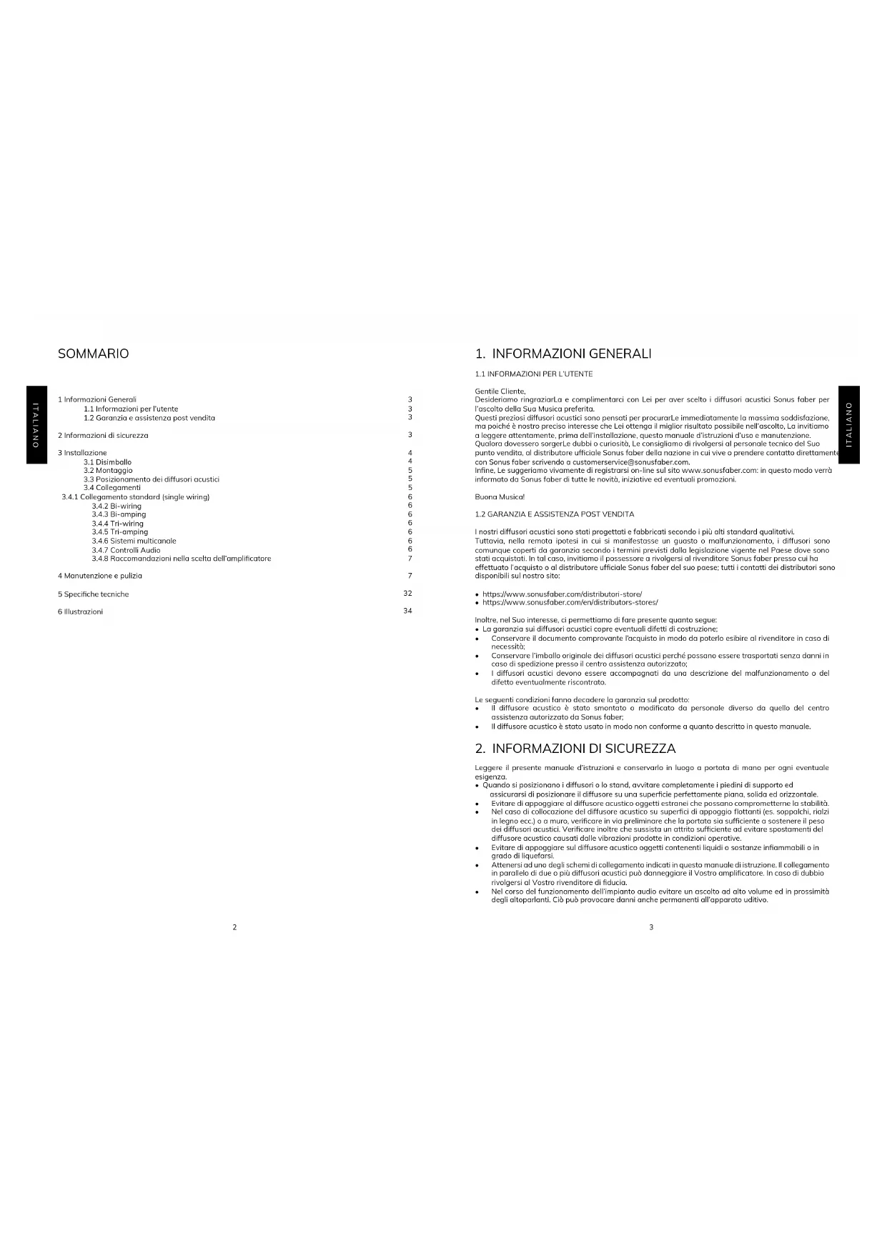 Gentile Cliente, Desideriamo ringraziarLa e complimentarci con Lei per aver scelto i diffusori acustici Sonus faber per l’ascolto della Sua Musica preferita. Questi preziosi diffusori acustici sono pensati per procurarLe immediatamente la massima soddisfazione, ma poiché è nostro preciso interesse che Lei ottenga il miglior risultato possibile nell’ascolto, La invitiamo a leggere attentamente, prima dell’installazione, questo manuale d’istruzioni d’uso e manutenzione. Qualora dovessero sorgerLe dubbi o curiosità, Le consigliamo di rivolgersi al personale tecnico del Suo punto vendita, al distributore ufciale Sonus faber della nazione in cui vive o prendere contatto direttamente con Sonus faber scrivendo a customerservice@sonusfaber.com. Inne, Le suggeriamo vivamente di registrarsi on-line sul sito www.sonusfaber.com: in questo modo verrà informato da Sonus faber di tutte le novità, iniziative ed eventuali promozioni. Buona Musica!