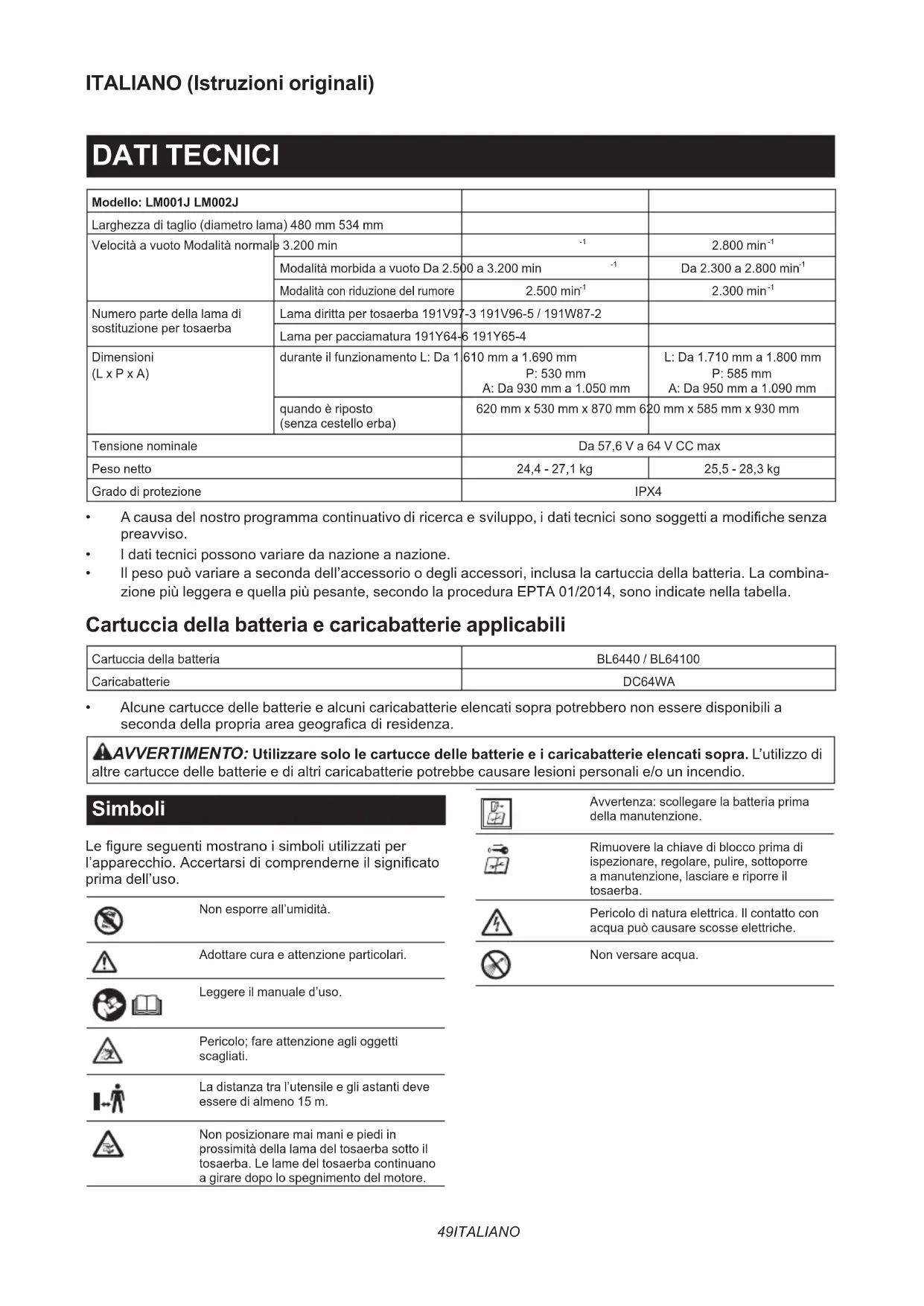 Numero parte della lama di sostituzione per tosaerba Lama diritta per tosaerba 191V97-3 191V96-5 / 191W87-2 Lama per pacciamatura 191Y64-6 191Y65-4 Dimensioni (L x P x A) durante il funzionamento L: Da 1.610 mm a 1.690 mm P: 530 mm A: Da 930 mm a 1.050 mm L: Da 1.710 mm a 1.800 mm P: 585 mm A: Da 950 mm a 1.090 mm quando è riposto (senza cestello erba) 620 mm x 530 mm x 870 mm 620 mm x 585 mm x 930 mm Tensione nominale Da 57,6 V a 64 V CC max Peso netto 24,4 - 27,1 kg 25,5 - 28,3 kg Grado di protezione IPX4