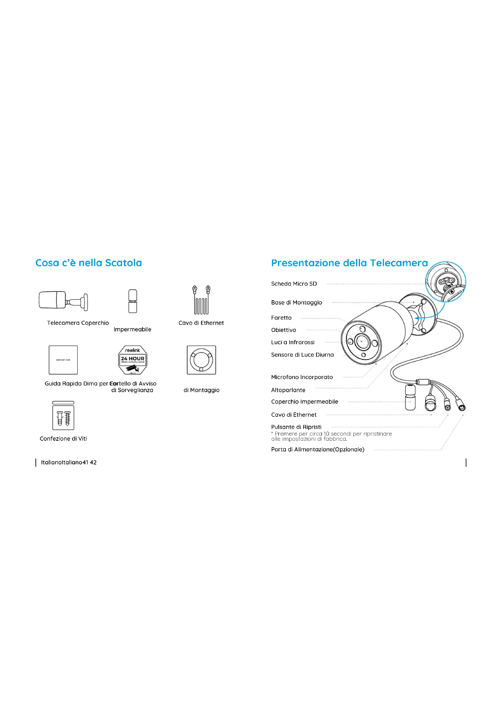 ContenutiItaliano Italiano41 42 Cosa c’è nella Scatola Confezione di Viti Telecamera Coperchio Impermeabile Cavo di Ethernet Cartello di Avviso di Sorveglianza Guida Rapida Dima per Fori di Montaggio Presentazione della Telecamera Base di Montaggio Scheda Micro SD Microfono Incorporato Altoparlante Coperchio Impermeabile Cavo di Ethernet Pulsante di Ripristi Porta di Alimentazione(Opzionale)
