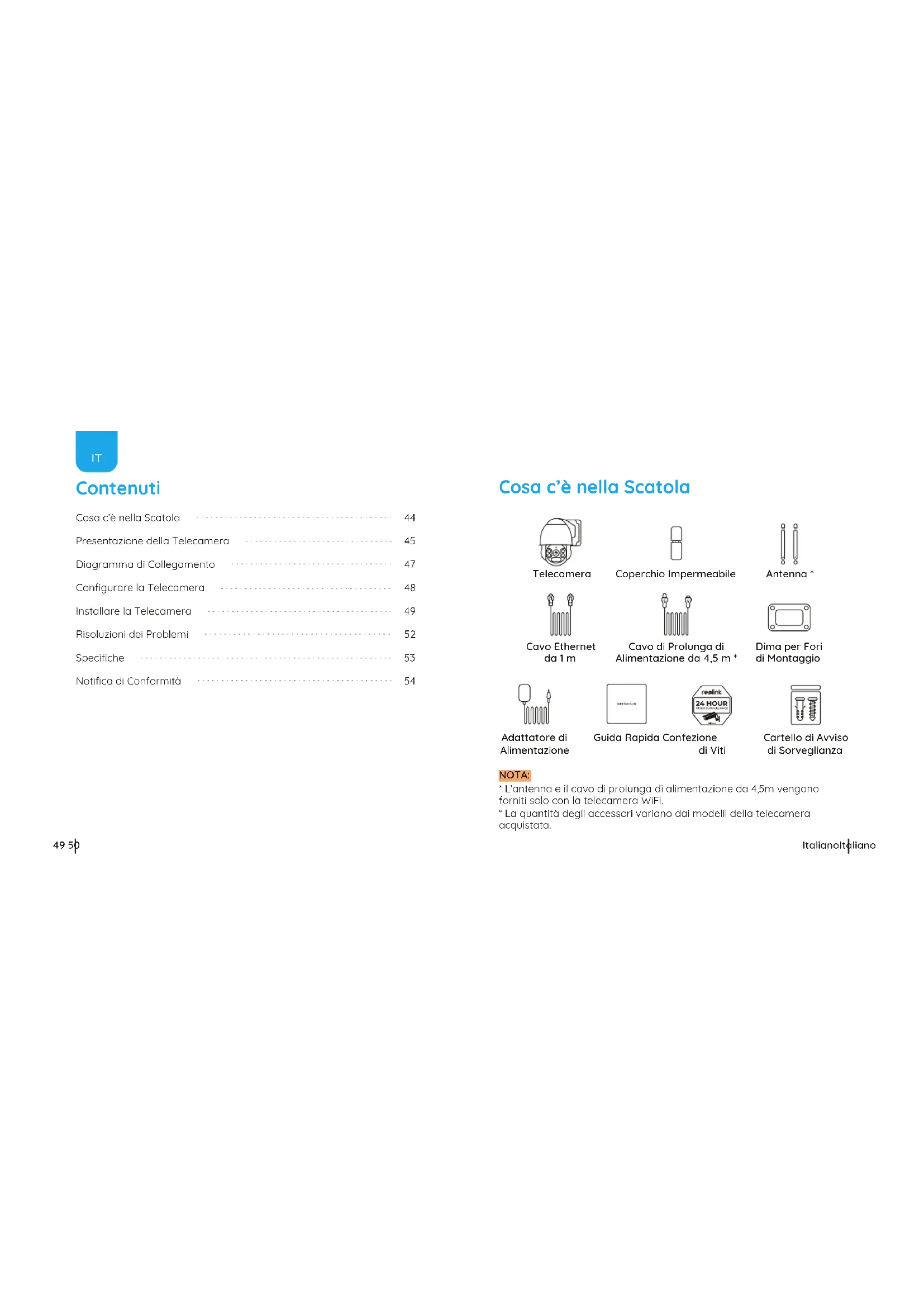 Cosa c’è nella Scatola Presentazione della Telecamera Diagramma di Collegamento Configurare la Telecamera Installare la Telecamera Risoluzioni dei Problemi Specifiche Notifica di Conformità