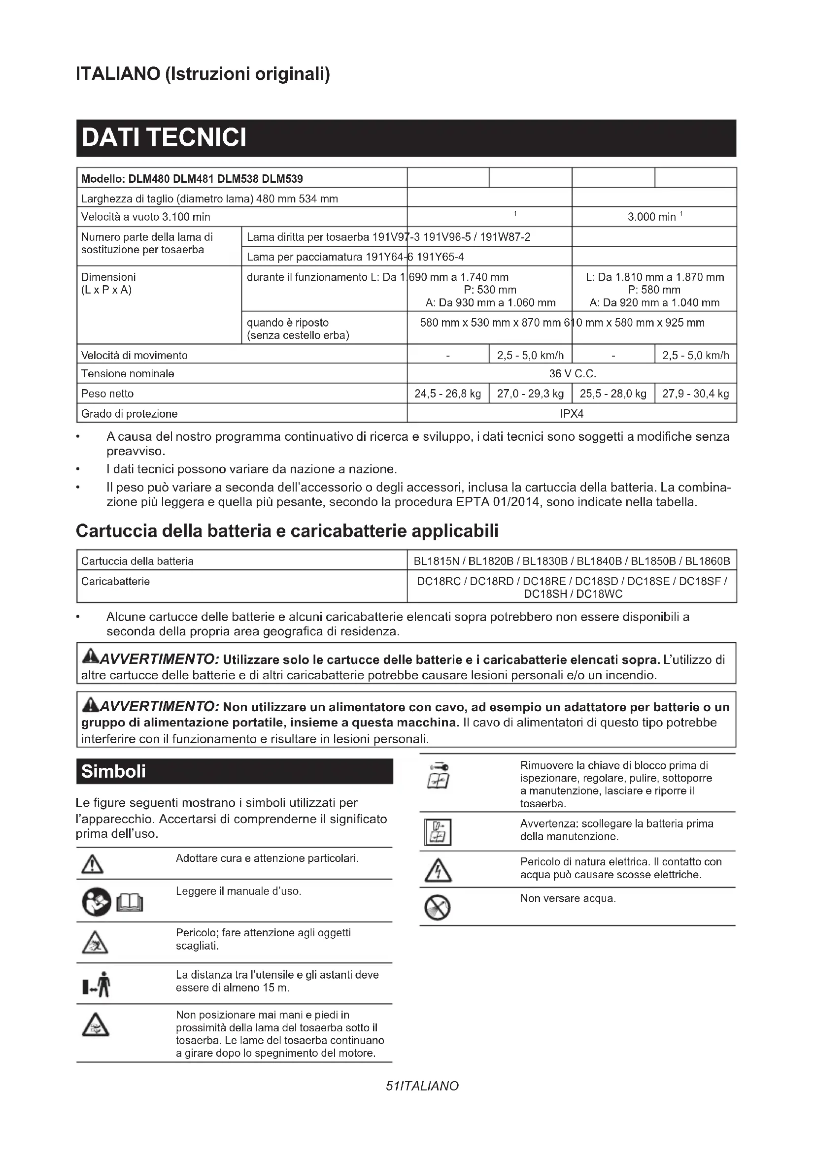- Alcune cartucce delle batterie e alcuni caricabatterie elencati sopra potrebbero non essere disponibili a seconda della propria area geograca di residenza. AVVERTIMENTO: Utilizzare solo le cartucce delle batterie e i caricabatterie elencati sopra. L’utilizzo di altre cartucce delle batterie e di altri caricabatterie potrebbe causare lesioni personali e/o un incendio. AVVERTIMENTO: Non utilizzare un alimentatore con cavo, ad esempio un adattatore per batterie o un gruppo di alimentazione portatile, insieme a questa macchina. Il cavo di alimentatori di questo tipo potrebbe interferire con il funzionamento e risultare in lesioni personali. Simboli Le gure seguenti mostrano i simboli utilizzati per l’apparecchio. Accertarsi di comprenderne il signicato prima dell’uso. Adottare cura e attenzione particolari. Leggere il manuale d’uso. Pericolo; fare attenzione agli oggetti scagliati. La distanza tra l’utensile e gli astanti deve essere di almeno 15 m. Non posizionare mai mani e piedi in prossimità della lama del tosaerba sotto il tosaerba. Le lame del tosaerba continuano a girare dopo lo spegnimento del motore. Rimuovere la chiave di blocco prima di ispezionare, regolare, pulire, sottoporre a manutenzione, lasciare e riporre il tosaerba. Avvertenza: scollegare la batteria prima della manutenzione. Pericolo di natura elettrica. Il contatto con acqua può causare scosse elettriche. Non versare acqua.52 ITALIANO Ni-MH Li-ion Solo per le nazioni dell’EU A causa della presenza di componenti pericolosi nelle apparecchiature, i riuti di apparecchiature elettriche ed elettroniche, accumulatori e batterie potrebbero pro- durre un impatto negativo sull’ambiente e sulla salute umana. Non smaltire elettrodomestici elettrici ed elettronici o batterie insieme ai riuti domestici! In conformità alla direttiva europea sui riuti di apparecchiature elettriche ed elettroniche (RAEE), sugli accumulatori e le batterie, nonché sui riuti di accumulatori e batterie, e al suo adattamento alle nor- mative nazionali, i riuti di apparecchiature elettriche ed elettroniche, batterie e accu- mulatori vanno conservati separatamente e conferiti a un punto di raccolta separato per i riuti comunali, operando in con- formità alle normative per la protezione dell’ambiente. Tale requisito viene indicato mediante il simbolo del bidone della spazzatura con ruote barrato apposto sull’apparecchio. Livello di potenza sonora garantita in base alla Direttiva rumore macchine all’aperto UE. Livello di potenza sonora in base alla normativa sul controllo del rumore NSW australiana Utilizzo previsto La macchina è destinata alla tosatura di prati. Rumore Livello tipico di rumore pesato A determinato in base allo standard EN60335-2-77: Modello DLM480 Livello di pressione sonora (L