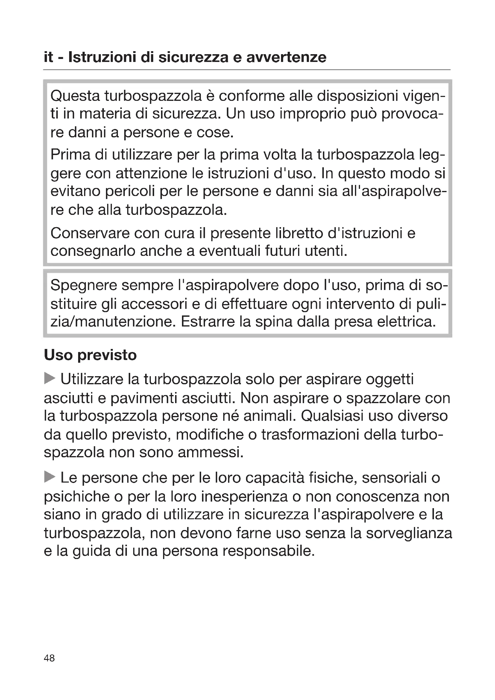 Questa turbospazzola è conforme alle disposizioni vigen- ti in materia di sicurezza. Un uso improprio può provoca- re danni a persone e cose. Prima di utilizzare per la prima volta la turbospazzola leg- gere con attenzione le istruzioni d'uso. In questo modo si evitano pericoli per le persone e danni sia all'aspirapolve- re che alla turbospazzola. Conservare con cura il presente libretto d'istruzioni e consegnarlo anche a eventuali futuri utenti. Spegnere sempre l'aspirapolvere dopo l'uso, prima di so- stituire gli accessori e di effettuare ogni intervento di puli- zia/manutenzione. Estrarre la spina dalla presa elettrica. Uso previsto Utilizzare la turbospazzola solo per aspirare oggetti asciutti e pavimenti asciutti. Non aspirare o spazzolare con la turbospazzola persone né animali. Qualsiasi uso diverso da quello previsto, modifiche o trasformazioni della turbo- spazzola non sono ammessi. Le persone che per le loro capacità fisiche, sensoriali o psichiche o per la loro inesperienza o non conoscenza non siano in grado di utilizzare in sicurezza l'aspirapolvere e la turbospazzola, non devono farne uso senza la sorveglianza e la guida di una persona responsabile.it - Istruzioni di sicurezza e avvertenze