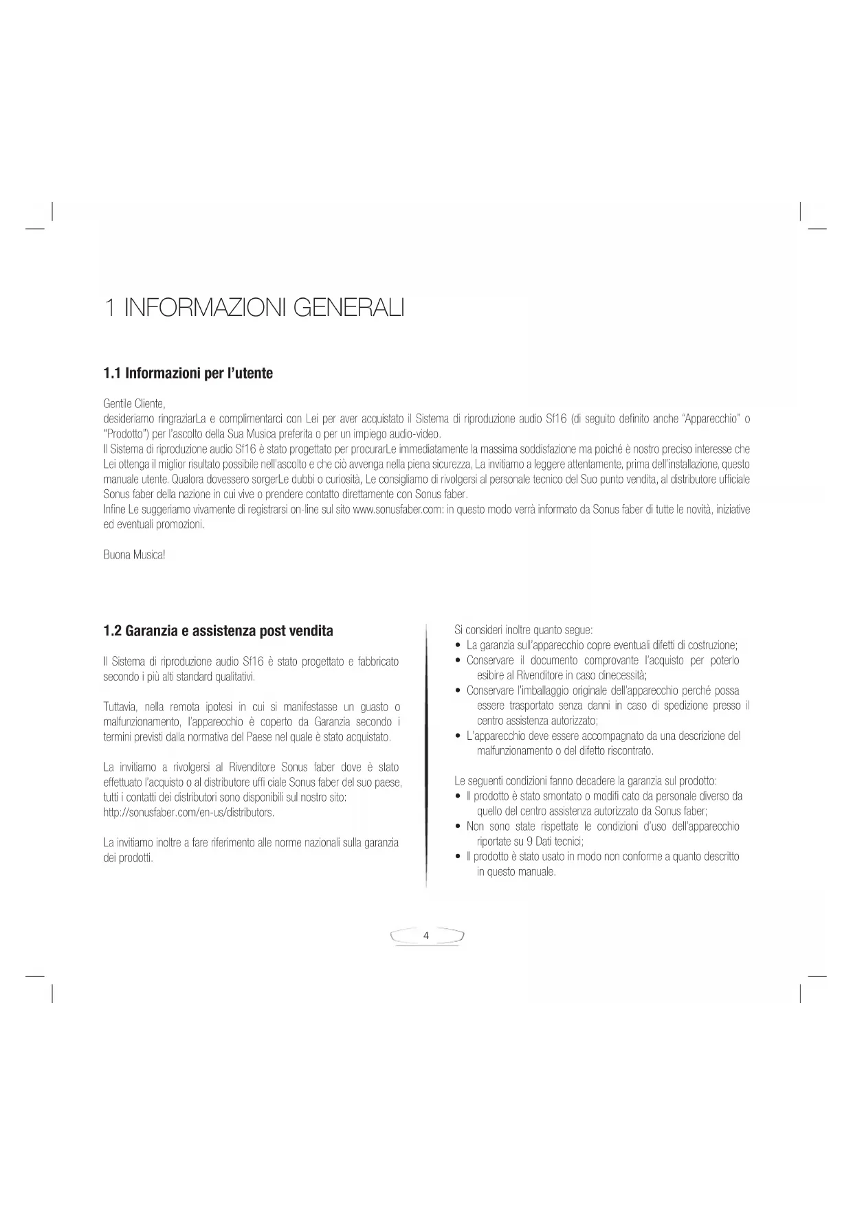Gentile Cliente, desideriamo ringraziarLa e complimentarci con Lei per aver acquistato il Sistema di riproduzione audio Sf16 (di seguito defi nito anche “Apparecchio” o “Prodotto”) per l’ascolto della Sua Musica preferita o per un impiego audio-video. Il Sistema di riproduzione audio Sf16 è stato progettato per procurarLe immediatamente la massima soddisfazione ma poiché è nostro preciso interesse che Lei ottenga il miglior risultato possibile nell’ascolto e che ciò avvenga nella piena sicurezza, La invitiamo a leggere attentamente, prima dell’installazione, questo manuale utente. Qualora dovessero sorgerLe dubbi o curiosità, Le consigliamo di rivolgersi al personale tecnico del Suo punto vendita, al distributore uffi ciale Sonus faber della nazione in cui vive o prendere contatto direttamente con Sonus faber. Infi ne Le suggeriamo vivamente di registrarsi on-line sul sito www.sonusfaber.com: in questo modo verrà informato da Sonus faber di tutte le novità, iniziative ed eventuali promozioni. Buona Musica!