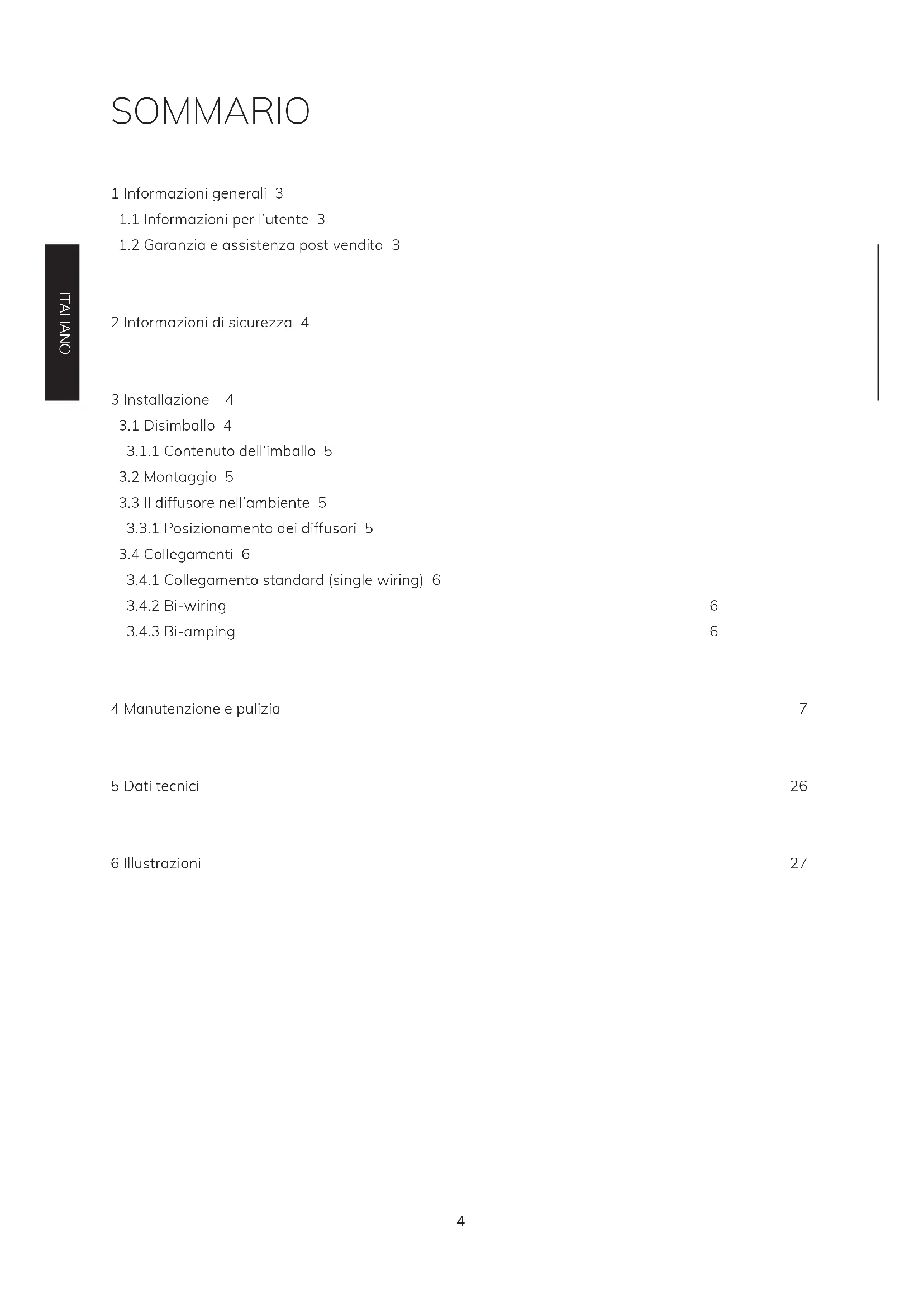 4 Manutenzione e pulizia 7 5 Dati tecnici 26 6 Illustrazioni 275 ITALIANO I diffusori Minima Amator II sono stati progettati e fabbricati secondo i più alti standard qualitativi. Tuttavia, nella remota ipotesi in cui si manifestasse un guasto o malfunzionamento, i diffusori sono comunque coperti da garanzia secondo i termini previsti dalla normativa del Paese dove sono stati acquistati. In tal caso, La invitiamo a rivolgersi al rivenditore Sonus faber presso cui ha effettuato l’acquisto o al distributore ufciale Sonus faber del Suo Paese; tutti i contatti dei distributori sono disponibili sul nostro sito al seguente indirizzo: